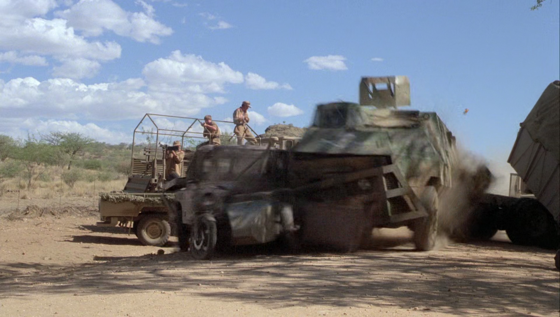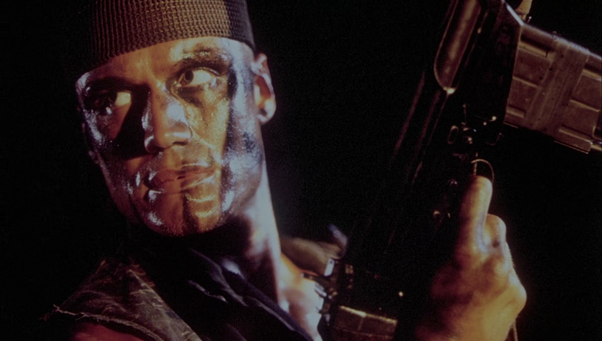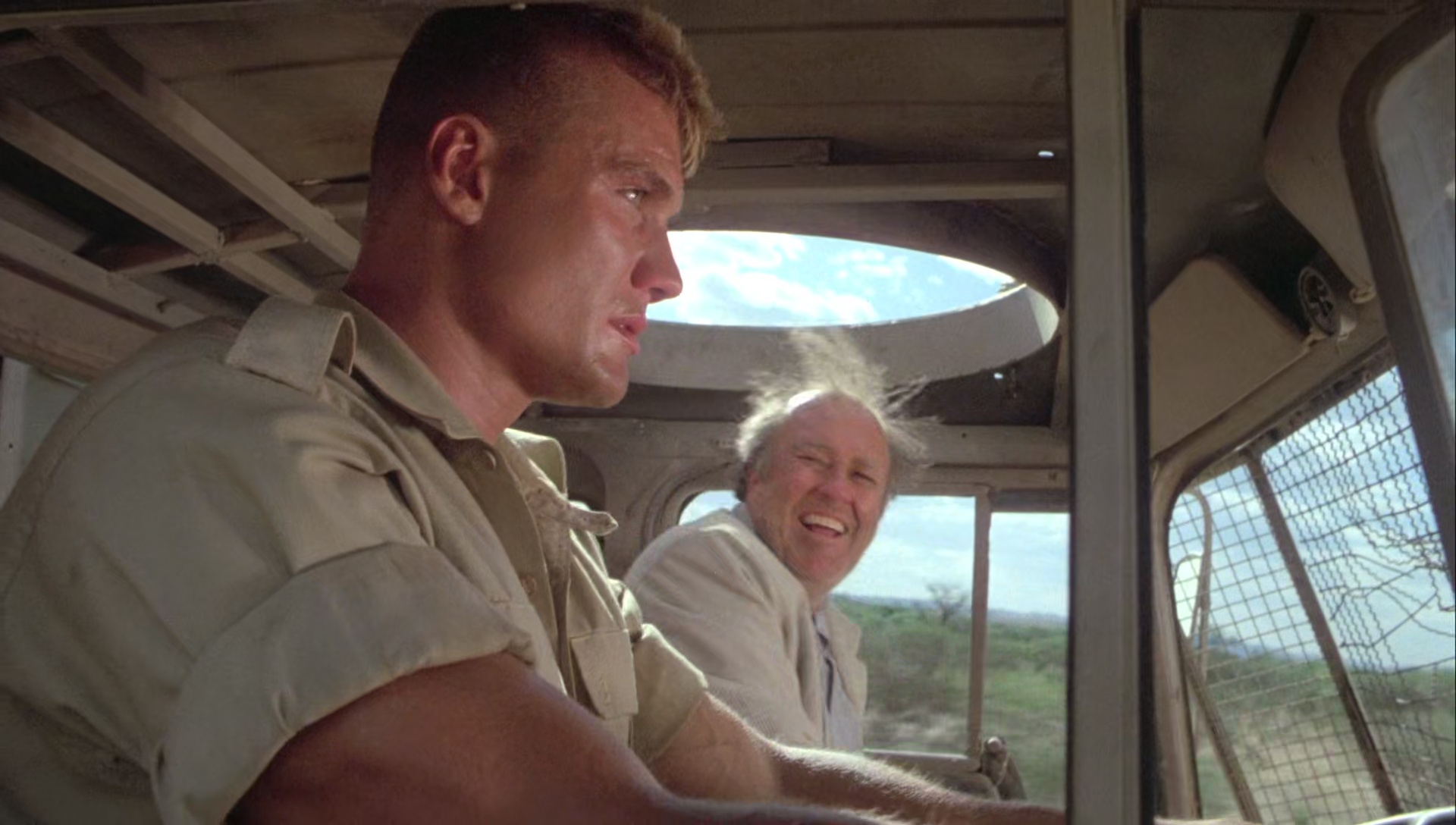 Le Scorpion Rouge, le produit fini, n’a certainement pas d’autres buts que d’envoyer du paté, que de tout faire exploser, de montrer que les Russes, ils sont vilains, et que quand l’un des leur se met à réfléchir, il change de camp pour aider les rebelles à repousser l’envahisseur soviétique, qui est aidé par les méchants Cubains. Ah ça, c’est primaire, simpliste, et il ne fallait pas en attendre plus, puisqu’en 1988, le mur de Berlin n’était pas encore tombé, c’était encore la guerre froide, et du coup au cinéma, l’ennemi principal des Américains était les Soviétiques. Il ne faut absolument pas chercher plus loin. Le Scorpion Rouge sent bon les années 80, l’action réactionnaire, les explosions, la poudre, le tout servi par un casting intégralement masculin (faut pas pousser hein, faut du muscle). Dolph Lundgren oui, avec à ses côtés M. Emmet Walsh comme précisé plus haut, mais aussi Al White (Leprechaun 2, Retour vers le Futur 2), T.P. McKenna (Les Chiens de Pailleà, Carmen Agenziano (Anges et Démons) et cette bonne tête de la série B, Brion James (Tango et Cash, Blade Runner, 48 Heures, Enemy Mine, House 3 et j’en passe). Ce brave Dolph, enfin, ce brave Nikolai Petrovitch Radchenko comme on l’appelle, est envoyé en Afrique pour éliminer le chef des rebelles. Il sympathise avec un de ses lieutenants et un journaliste Américain, les aide à s’évader en espérant se rapprocher de sa cible. Manque de bol, ses intentions sont démasquées, l’homme est retrouvé par les siens, qui ne tolèrent pas l’échec, et ce qui amène la classique scène de torture fréquente des films de guerre (scène censurée à l’époque), avant que ce pauvre Nikolai comprenne qu’il est dans le mauvais camp, et s’échappe pour aider les rebelles à vaincre l’oppression et l’envahisseur, à grand coup de mitrailleuse, de coups de pieds dans la face, de tank, hélicoptères, et de musique rock bien typées années 80.