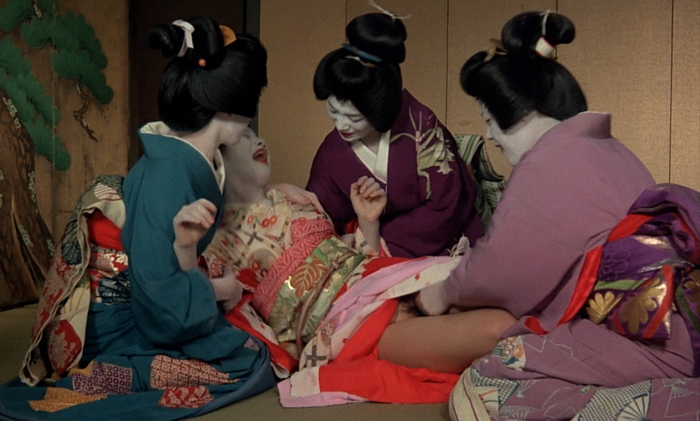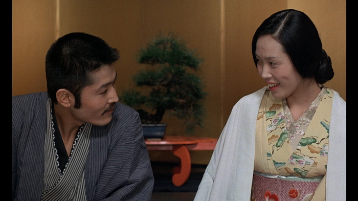 Si L’EMPIRE DES SENS est une œuvre à part dans l’histoire du cinéma, c’est avant tout parce qu’il est un exemple (presque) unique de la combinaison d’images à caractère pornographique et d’un vrai film (artistiquement parlant). Les ébats sont en effet filmés au plus près, et les images sont très rarement subjectives. On peut trouver le procédé racoleur, on peut aussi penser qu’il s’agissait là de l’occasion rêvée de mettre en scène un drame passionnel qui trouve sa source avant tout dans le sexe, et qui va rapidement devenir une drogue pour les deux principaux protagonistes. Car petit à petit, Sada et Kishizo vont se replier sur eux même, se couper du monde extérieur. Le film est ainsi tourné essentiellement en intérieurs : des scènes superbes, les plans fixes sont souvent comparables à de véritables tableaux, et parfois même à une scène de théâtre, les mises en scène de Kishizo et Sada se rapprochant parfois de véritables performances artistiques que la présence régulière d’un public (geisha, vieille femme, voyeur…) vient encore renforcer.