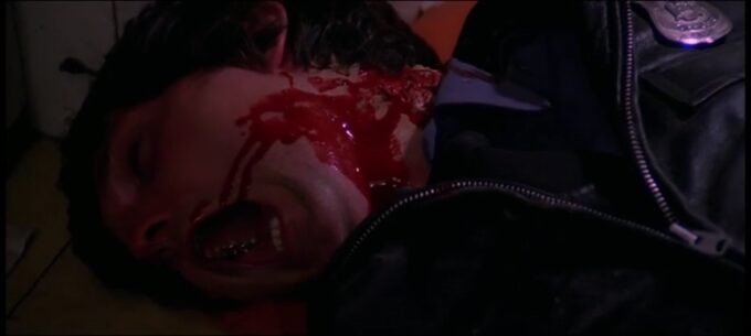 Mais hors de ces moments de calme et ces petits défauts, l’Enfer des Zombies délivre la marchandise gore attendue, quelques séquences chocs qui marquent les esprits, et on y retrouve bel et bien le style Fulci. Outre l’horreur et les corps en décomposition, on pourra citer également l’action relativement figée du métrage, si caractéristique de son auteur. Un personnage pourra se figer de peur, ou bien crier, tandis que la caméra zoom très doucement sur ce personnage. Le danger lui continue d’approcher, laissant le personnage victime d’une mort atroce. Fulci suspend en quelque sorte le temps, chose qu’il refera très souvent par la suite. Et bien entendu, l’Enfer des Zombies aura marqué pour la séquence de l’œil, chose que le réalisateur refera par la suite, conscient du traumatisme que cette scène aura donné aux spectateurs. Plus étrange par contre, on se rappellera longtemps de cette rencontre étrange entre un zombie et un requin. Oui oui, un affrontement entre les deux prédateurs, sous l’eau. Étrange, ridicule sur le papier, mais au final pas forcément raté à l’image. Le film bénéficie après tout des effets spéciaux de Giannetto De Rossi, qui participera par la suite à d’autres métrages de Fulci, mais également à des films plus friqués, comme Dune de Lynch, Rambo 3 ou encore Daylight. Notons aussi encore une fois la collaboration entre Fulci et Fabio Frizzi à la musique, qui livre d’ailleurs un magnifique thème qui sera reprit par la suite dans Frayeurs l’année suivante. L’Enfer des Zombies est plaisant, intéressant au sein de la carrière de Fulci, a ses moments cultes, mais aussi des moments un peu plus longs et moins convaincants.