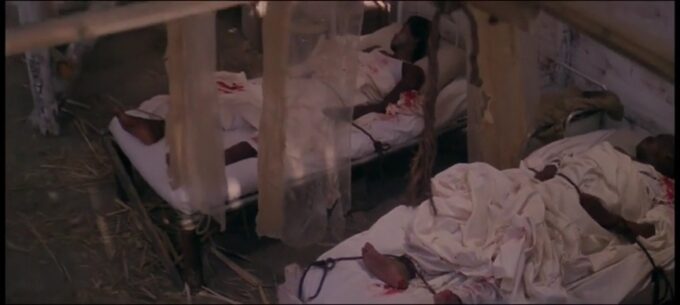 L’Enfer des Zombies donc nous raconte l’histoire d’un docteur travaillant aux Caraïbes d’un côté, et d’un groupe en bateau de l’autre qui se rend dans les environs. Les coutumes locales parlent de vaudou, qui ramènerait les morts à la vie. Autre différence majeure avec l’œuvre de Romero, le cadre de l’action, absolument pas urbain, mais rural. De cette base donc simple, Fulci nous offre un métrage qui deviendra le début de son nouveau style, et signera pour lui le début de sa notoriété, et pas seulement en Italie, mais dans le monde. Fulci livre un film glauque à souhait il faut avouer, où les blessés attendent à l’hôpital de mourir tout simplement, et où les morts reviennent, le visage en putréfaction. Une certaine ambiance se pose sur le métrage, mais force est de reconnaître que des 4 films du genre que tourna Fulci de 1979 à 1981, L’Enfer des Zombies, sans être mauvais, est le plus faible. Comme dit, le réalisateur trouvait là son nouveau style, mais le métrage est encore encré dans une narration classique, loin des expérimentations narratives étranges de Frayeurs et de l’Au-Delà. Et Fulci semble beaucoup moins à l’aise lorsque qu’il faut faire avancer son intrigue ou développer ses personnages. Certes il n’y a rien d’extraordinaire dans ces personnages, mais du coup, entre deux scènes impressionnantes, l’ennui gagne presque le métrage. Des petites scènes de discussions anodines, les doutes des personnages… De longues minutes pas toujours très passionnantes. On notera bien évidemment quelques défauts du au manque de temps et d’argent, comme ces faux raccords, ou ces plans de lancers de cocktails Molotov utilisés plusieurs fois.