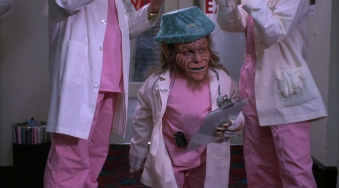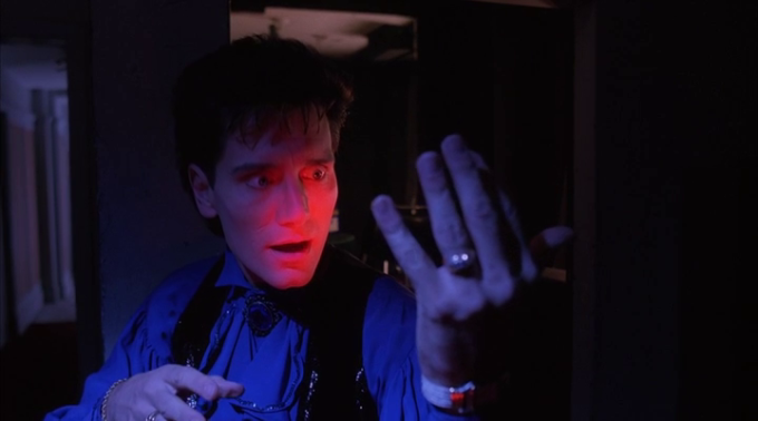 Derrière la caméra, on ne retrouve pas un inconnu puisque Brian Trenchard-Smith est coupable de quelques films cultes de l’Ozploitation : L’Homme De Hong-Kong, Le Drive-In De L’Enfer et surtout Les Traqués De L’An 2000. De quoi espérer un métrage fun et décomplexé, ce qu’est ce troisième opus de Leprechaun, ici plongé en plein dans la ville du vice, tout du moins sur le papier. Papier qui ne manque pas de bonnes idées, à commencer par le lieu de l’action. Voir Leprechaun à Las Vegas, en voilà une d’idée qui fait baver, surtout quand l’intéressé annonce qu’il va « tous les dilapider et leurs faire pleurer des larmes de sang à ces fils de pute ! ». Seulement, avant de voir le lutin maléfique arpenter les rues de la ville, il va falloir se farcir une grosse introduction bien trop longue chez un préteur sur gage où le Leprechaun sort de son sommeil. Car ici le nouveau Leprechaun a été transformé en statue de pierre et se fait revendre contre vingt dollars. N’espérez pas savoir par qui ou pourquoi il est sous cette forme, on ne le saura jamais puisque celui qui ramène la statue chez le préteur sur gage part aussi vite qu’il arrive, c’est-à-dire en trente secondes à tout casser. Il prévient cependant le propriétaire des lieux de ne pas toucher au médaillon autour du cou du lutin. Et devinez quoi ? C’est la première chose que va faire le préteur sur gage qui libère la créature. Créature qui se barre avec son or, mais devinez quoi ? Comme d’habitude il manque une pièce dans son chaudron. Dans le fond, c’est à nouveau la même histoire, mais dans la forme Leprechaun à Las Vegas tente de se démarquer de ses prédécesseurs en amenant de la nouveauté. Le Leprechaun modèle 3 tout d’abord a une particularité que les autres n’avaient pas : transformer un humain en l’un des siens si son sang entre en contact avec une plaie. Mais la principale nouveauté du métrage, c’est la pièce d’or qui se retrouve au centre du récit : elle accorde un vœu à qui la possède, et le Leprechaun va bien évidement faire retourner ledit vœux sur celui qui l’a souhaité. Ça vous dit quelque chose ? Normal, Leprechaun à Las Vegas anticipe de trois ans le pitch du Wishmaster de Robert Kurtzman. Ce troisième volet de la saga ne manque donc pas de bonnes idées mais dans l’exécution, c’est une autre histoire.
