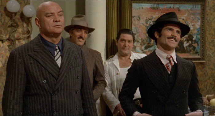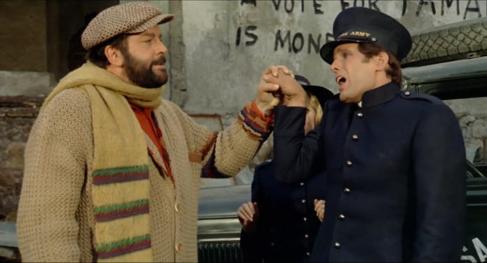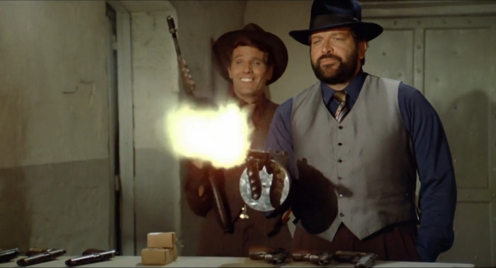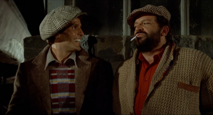 Bud Spencer incarne son personnage habituel, rude à l’extérieur mais très et altruiste à l’intérieur. Giuliano Gemma a la bonne idée de ne pas trop imiter Terence Hill en jouant ce looser qui laisse imposer son charme et sa grande gueule. On retrouve également les gueules habituelles du cinéma de Terence Hill et Bud Spencer, comme par exemple Riccardo Pizzuti et Claudio Ruffini qui une fois de plus vont prendre leur lot de claques, mais aussi un Steffen Zacharias très attachant à l’instar de son rôle de Jonathan dans On L’Appelle Trinita. On retrouve dans Les Anges Mangent Aussi des Fayots tout ce qu’on peut attendre d’une comédie de Bud Spencer et Terence Hill, bien que ce dernier n’est pas présent donc. La recette est simple, grosses claques et humour bon enfant. Nous sommes ici dans un divertissement avec très peu de subtilité et prévisible, mais l’humour parfois absurde, qu’on ne voit pas forcément venir, finit par l’emporter surtout si vous avez grandi dans les années 80 avec le célèbre duo. Le film est une sorte de parodie de films de gangsters qui va jouer avec tous les clichés possibles, sans forcément chercher à être original, le but étant sans doute que le public se sente comme dans ses petits souliers. Bon, il est vrai que le film vire parfois vers un humour un peu étrange, voire dérangeant (le bébé et le noyau de pêche), mais certains moments sont à mourir de rire, comme cette séance de tango qui n’a absolument aucun sens. Il y a peu de scènes de bagarres comparé à la durée du film, une au début et une pour le final, le reste du film se centrant sur nos deux loustics. La version complète du film (2h02), non présente sur le blu-ray de chez BQHL, développe le personnage de Giuliano Gemma et ce sont essentiellement des scènes comiques qui ont été coupées (mais aussi une partie de la baston finale). Avec ces coupes, le rythme du film est un peu étrange, même si ça fonctionne quand on le prend dans son ensemble. Au final, Les Anges Mangent Aussi des Fayots n’est pas toujours bon (sa version longue est plus fluide), mais il reste toujours frais et divertissant et c’est exactement ce qu’on attend d’une comédie de Bud Spencer.