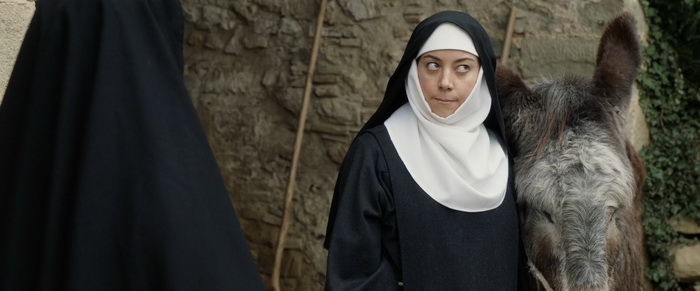 Dans Le Decameron, Giovanni Boccaccio raconte l’histoire d’un groupe de voyageurs tentant d’éviter la peste et, pendant qu’ils trainent ensemble, ils se racontent diverses histoires pour passer le temps. Beaucoup de ces histoires sont grossières et sexuelles et le ton employé a certainement dû surprendre les lecteurs à l’époque. La tonalité de Les Bonnes Sœurs semble correspondre à cette vision de Giovanni Boccaccio. L’histoire se passe en 1347 alors qu’un serviteur d’une riche famille se soit enfui après avoir couché avec la femme de son maitre. Il trouve refuge dans un monastère quasi exclusivement féminin dans lequel il compte se faire un peu oublier. Il veut éviter les mêmes ennuis ici mais avec des nonnes qui rivalisent pour attirer son attention, la tâche risque d’être ardue. Les Bonnes Sœurs, c’est comment l’arrivée d’un jeune et bel homme dans un couvent va changer la vie de ses religieuses qui, pour la plupart, n’ont jamais demandé à être là. Car à l’époque, les filles non désirées et non mariées étaient souvent forcées de rentrer dans des couvents, qu’elles le veuillent ou non, sous peine de, entre autres, mourir de faim. Bien que le film se déroule au 14ème siècle et que les décors et les tenues soient adaptées à cette époque, les dialogues et les comportements des personnages sont résolument modernes. Les mots « fuck » ou « fucking » sont légion mais, si j’ai bien compris, Boccaccio écrivait en langage familier de son époque et c’est ce que fait Jeff Baena ici. L’anachronisme que cela représente pourrait donc être fidèle au matériau d’origine. Les dialogue sont par ailleurs très bons, tantôt très fins, tantôt versant dans le grossier. Mais surtout, ils ont pour la majorité été improvisés par les acteurs qui n’avaient eu qu’un plan détaillé du scénario et rien de plus. Cela leur permet d’être réellement spontanés et d’avoir un côté souvent percutant.