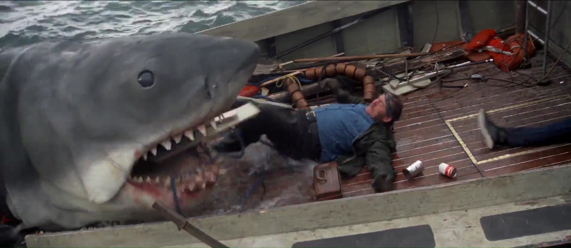 Le temps pour Spielberg de placer quelques attaques sous le signe de la suggestion, avant d’envoyer son trio de personnage en mer pour chasser ce pauvre requin qui ne demandait qu’un peu de nourriture. Mais pour autant, le requin ne va pas être montré à tout va, loin de là, afin de ménager le suspense, et surtout de faire monter la tension. Après tout, on a plus souvent peur de ce qu’on ne voit pas. Le film va alors alterner les plans rapides des requins construits par l’équipe (lorsqu’ils fonctionnent) et des images tournées en Australie avec de vrais requins. Le mélange des deux fonctionne un max. Mieux, Spielberg profite de cette seconde partie, jouant pourtant beaucoup plus sur le suspense, pour développer ses personnages, les rendre plus humain, et même au détour d’une scène mythique, un passé plutôt prenant. Avant que le squale ne revienne mettre un terme à tout ça. En terme de film animalier sérieux, Les Dents de la Mer est assurément le haut du panier, mainte fois copié, jamais égalé. C’est sans doute le plus grand défaut du film, même s’il ne concerne pas l’œuvre cinématographique en question, à savoir sa descendance. Pour retrouver un film de genre aussi fort et jouant sur la tension plutôt que les attaques répétées, il faudra attendre longtemps, avec des films tels Solitaire ou The Reef.