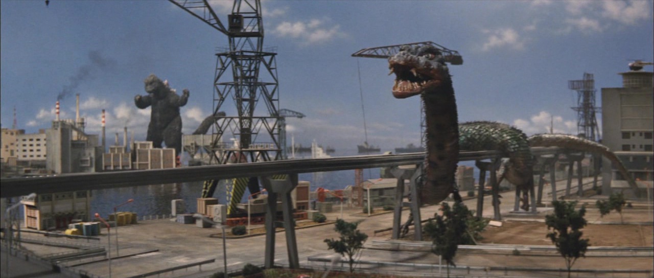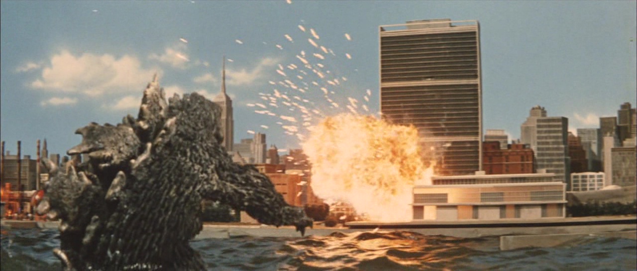 Et l’aspect Kaiju donc, que je ventais comme étant mieux introduis dans le récit et apparaissant surtout beaucoup plus rapidement qu’auparavant ? Et bien on ne va pas mentir, si tout n’est pas parfait, après avoir subit les enfantillages de Godzilla sur deux opus, l’aspect Kaiju des Envahisseurs Attaquent fait du bien ! Les monstres détruisent tout sur leur passage, la Toho a mit le paquet malgré le budget que l’on sent parfois limité (certaines incrustations moyennes, et certains plans qui semblent assez vides). Car si les ambitions sont à la hausse et que Honda est à la barre, cela ne veut pas dire que le métrage a eu droit à un temps de production plus élevé que les précédents. Mais le film se fait généreux en destruction, et nous offre un combat final avec un nombre impressionnant de Kaijus à l’écran. Alors oui, on pourra se dire d’office que le combat est déséquilibré, car bon, King Ghidorah a beau être un super méchant, le faire affronter 10 monstres, sachant que dans Invasion Planète X, Godzilla, Rodan et Mothra lui foutaient une sacrée raclée. Résultat des courses : il se prend une méga grosse raclée. Mais son combat de Kaijus reste impressionnant et divertissant pour son époque, et était un bel adieu. Adieu qui n’aura pas lieu, vu que face au sérieux du film et sa générosité, le succès fut au rendez-vous, et dés 1969, la Toho décida de continuer, de la pire manière imaginable, mais là est un autre débat.