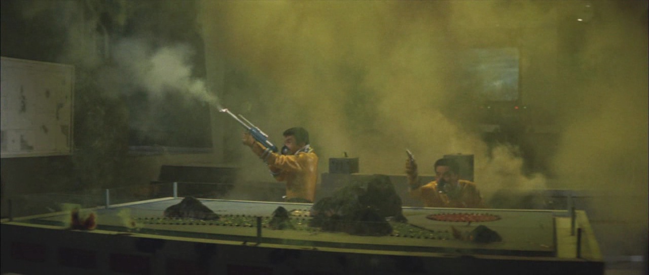 Non non, je n’oublie personne. Bon ok, il y a malheureusement aussi Minilla… vous savez, le fils de Godzilla. Comme d’habitude, il ne sert ici strictement à rien, se contentant de suivre son père et de faire ses cris d’otarie mourante. Heureusement, on le voit très peu au final. Et nous n’allons pas attendre une heure pour voir tout ce bon monde, les Kaijus sont d’ailleurs introduis dans l’histoire et montrés à l’image dés les premières minutes, puisqu’ils sont tous réunis sur une île contrôlée par le gouvernement, Monsterland. On nous les présente d’entrée de jeu, un par un, avant qu’à peine 10 minutes plus tard, des envahisseurs débarquent, le personnel de l’île étant attaqué, endormi, et au réveil de tout le monde, et bien c’est simple, les Kaijus ont disparus, et vont réapparaître peu de temps après un peu partout dans le monde, pour détruire Moscou, New York ou bien entendu Tokyo. Les Envahisseurs Attaquent ne perd pas une seconde, et laisse même au placard la plupart du temps l’aspect kitch et daté de Invasion Planète X. Les Envahisseurs en eux-mêmes sont déjà bien plus crédibles, avec une tenue bien plus sobre à l’image. On pourra toujours pester contre les pistolets en plastiques, mais cela donne au final un certain charme au métrage. Bon par contre, il faut bien l’avouer, une scène en particulier m’aura beaucoup fait rire, car oui, les mannequins en mousse qui tombent des falaises, cela se voit à des kilomètres, et je ne m’y attendais absolument pas ici. Malgré ce petit écart, l’aspect science fiction du titre possède son charme, avec ses maquettes, ses envahisseurs au départ à forme humaine, son exploration lunaire (oui, pas de Jupiter ce coup-ci).