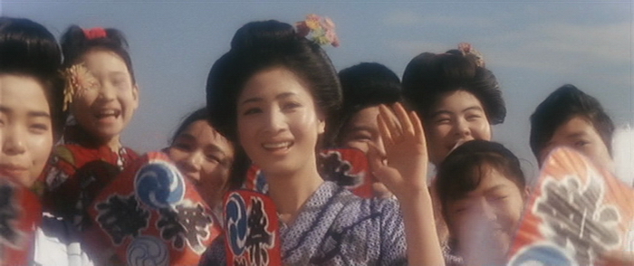 Oui, bien entendu oui. Avec LES FLEURS ET LES VAGUES, il nous livre ainsi un mélo sur fond de drame social et amoureux, dans la plus grande tradition du genre. Ou presque. Je dis bien « presque », car le remuant réalisateur japonais va apporter quelques touches indélébiles de sa virtuosité, teintant alors l’écran de tout son talent : la plus belle preuve de ce refus de l’académisme viendra poindre à la fin. En effet le film va se conclure dans des décors de studio enneigés et très abstraits, mais c’est surtout sur le fond que Suzuki semble s’être le plus amusé à déjouer les règles du genre, puisque LES FLEURS ET LES VAGUES nous propose un dénouement très osé. Indépendamment de ce final, le film de Suzuki demeure, il est vrai, assez classique : guerre des gangs, amours impossibles et un homme rattrapé par son passé. Coincé entre la police et les yakuzas, hanté par un meurtre qui attirera à lui un homme mystérieux pareil à un spectre assassin, Kikuji ne connaîtra jamais le repos. Ou alors si bref, dans les bras de sa femme, Oshige, qu’il cache pour qu’ils puissent vivre en paix, ou bien au creux du sourire ou de cette chute de reins qu’une étrange geisha ne réserve qu’à lui. Qu’à ses mains qui n’en finissent pourtant pas de se dérober. Ces deux femmes, les plus solides points d’ancrage d’un homme fatigué, presque en perdition, constituent l’une des plus belles réussites du film : deux portraits opposés mais qui sont aussi complémentaires. Deux visages de l’amour, du dévouement. De la peine aussi.