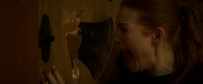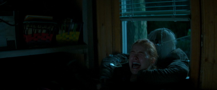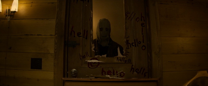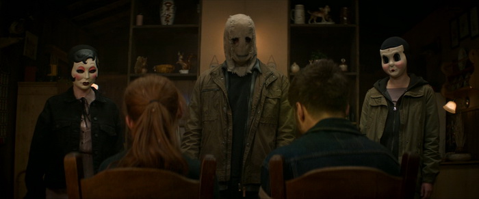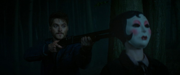 A l’origine, le scénario comptait 280 pages, basées sur les notes que le réalisateur Renny Harlin et le producteur Courtney Salomon s’étaient échangées. Harlin a déclaré que les films avaient été tournés les trois en même temps comme un seul film de 4 à 5 heures et que le tout format au final qu’un seul arc narratif qui a donc été décomposé en trois films. Il explique que le premier film est en quelques sortes le premier acte, celui qui présente les personnages, les tueurs, le personnage principal et qui met en place la tension inhérente à ce genre de film. Les Intrus – Chapitre 1 nous présente donc un couple qui se fait une petite virée en amoureux et qui va se retrouver coincé dans un patelin paumé à la population pas très accueillante et aux gueules patibulaires. Ils vont dormir dans une baraque en pleine forêt qu’on va leur louer en attendant que leur voiture soit réparée et, forcément, qui dit cabane dans les bois dans un endroit ou le réseau passe très mal et où tout le monde est bizarre, ils vont se faire attaquer par trois individus masqués qui vont pénétrer dans la maison et leur jouer des tours. L’un a un masque en toile de jute, les deux autres des masques façon poupées de porcelaine. Ils tuent dans raison apparente, comme si notre couple de héros était simplement là au mauvais endroit / au mauvais moment et, à la fin de ce premier film, on ne sait pas qui se cache derrière les masques. Alors on y va de nos suppositions, en imaginant certaines gueules cassées vu dans la première partie du film, mais rien ne nous est pour le moment révélé. L’un des problèmes de Les Intrus – Chapitre 1, c’est qu’il n’est pas très généreux. Le bodycount est très faible, trois morts seulement, il ne se passe au final pas grand-chose et même lorsqu’il passe à la vitesse supérieure à mi-film, avec les trois intrus masqués qui arrivent dans la maison, on a plus l’impression d’assister à une partie de cache-cache qu’à un vrai jeu de massacre comme on aurait pu l’espérer.