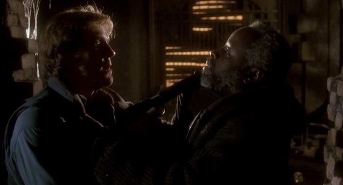 Les Pilleurs lance directement son histoire. En 5 minutes top chrono, la trame du scénario est posée et le film peut se consacrer sur ses nombreux personnages. Et on a droit à un bon gros casting de trognes : Bill Paxton (Aliens, Apollo 13), William Sadler (Die Hard 2, Les Evadés), Art Evans (Die Hard 2, Vampire vous avez dit Vampire), Ice Cube (Friday, Boyz’n the Hood) ou encore un Ice T (New Jack City, Mean Guns) avec une tête pas possible, cheveux longs permanentés et chapeau de gangster. Le duo Paxton / Sadler, l’un héros honnête mais un peu naïf, l’autre héros bourrin et un brin ambitieux, fonctionne à merveille. Ils se donnent complètement dans leurs rôles respectifs. Au niveau de nos rappeurs, Ice T n’en fait pas trop (c’est assez rare pour être signalé) mais à l’inverse Ice Cube en fait des caisses, au point d’en devenir ridicule. Aucune présence féminine dans le film si ce n’est des figurantes au début du film en arrière-plan. Les deux camps vont se confronter, mais il y aura des confrontations à l’intérieur de chaque camp via pas mal de petits rebondissements (qu’on voit venir pour certains). Walter Hill arrive à maintenir une très bonne tension tout le long du film. C’est bien rythmé, malgré un petit ventre mou à l’heure de film car il s’attarde finalement plus sur ces conflits de personnages que réellement sur l’action. Mais rassurez-vous, ça canarde malgré tout et les scènes d’action ont pas mal d’impact, à grands coups de gros calibres et autres explosions. La violence est sèche, sans esbroufe, percutante. La mise en scène de Hill est très bonne également, avec une ingénieuse utilisation des différents recoins de ce lieu unique. Il utilise toujours de chouettes angles de caméra, avec pas mal de plans cassés et autres idées bien sympathiques. L’ambiance musicale est soignée, mélangeant rap, guitare électrique, et même musique atmosphérique que n’aurait pas reniée un certain Mike Patton. Dommage que le film ne fasse qu’effleurer certains sujets (les impôts, les aides sociales, le racisme) sans jamais les approfondir, mais là n’était pas le but du film qui avait pour mission principale de divertir.