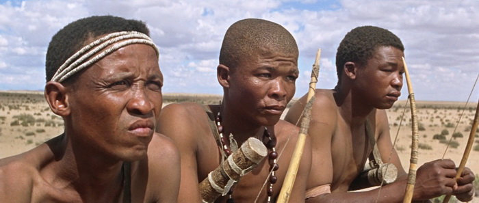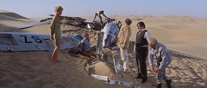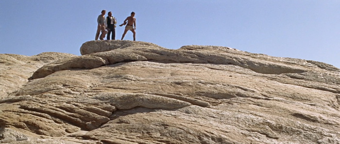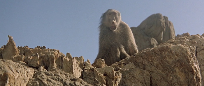 Les Sables du Kalahari, malgré sa durée de 2h, ne tarde pas à rentrer dans le vif du sujet et dès la 13ème minute, nos passagers de ce petit jet sont échoués en plein désert du Kalahari, suite à l’atterrissage en urgence et à l’explosion de leur avion. A partir de là se met en place une construction assez classique, avec un groupe de six personnes qui vont devoir survivre dans des conditions extrêmes, ici un désert et brûlant, avec un blessé à la jambe (transpercée par un morceau de métal lors du crash), très peu d’eau et sans nourriture. A l’endroit où ils décident de se poser, ils devront « cohabiter » avec une tribu de babouins. Les personnages vont se nourrir de melons sauvages, se désaltérer dès qu’ils le peuvent, s’amuser un peu dès qu’ils en ont la moindre occasion histoire de ne pas sombrer dans la folie. Ils vont s’émerveiller lorsqu’ils vont arriver à allumer un feu par eux-mêmes avec une loupe, lorsqu’ils vont réussir à attraper un lézard géant avec un piège fait maison, … Comme le dit l’un d’eux, ils ne sont pas de ce monde, la civilisation et l’évolution de la technologie ayant pour conséquence qu’ils ne savent plus se débrouiller en pleine nature hostile. Et puis peu à peu, des tensions vont naitre dans le groupe, lorsque l’un d’eux a des envies un peu trop tactiles envers la seule femme du groupe, lorsque l’un d’eux va décider que, parce qu’il a une arme et qu’il ramène du gibier, qu’il sera celui qui décide. Et puis il y a ce groupe de babouins qui les observe de loin… La chaleur torride et les gorges desséchées se ressentent, le film est souvent tendu malgré sa durée de deux heures même si, clairement, il aurait gagné en efficacité et en rythme avec vingt minutes de moins.