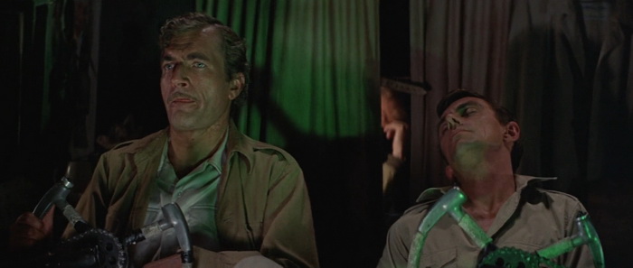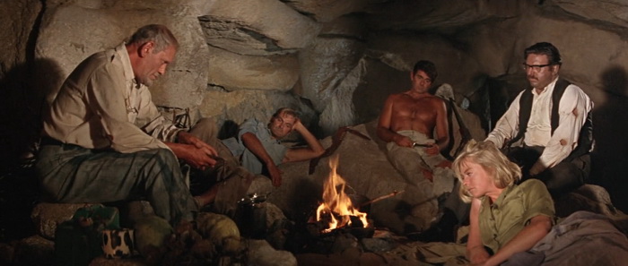 Cy Endfield arrive à créer un joli suspense à partir d’un matériel au final limité et Les Sables du Kalahari est un film qui parle de la nature profonde de certains hommes, une nature parfois mauvaise dès que la survie entre en jeu. Si on y regarde de plus près, le film parle de luxure, de cupidité, d’ignorance et il va plus loin qu’un survival classique afin de mettre en évidence la fragilité de l’équilibre social dans ce genre de situation extrême. L’humain est un animal comme les autres, mais il est pire encore, n’hésitant pas marcher sur la gueule des autres pour montrer qu’il est le plus fort. Pire encore, la tribu de babouins qu’on nous montre comme extrêmement menaçante reste au final passive, comme si on voulait nous montrer que l’homme est encore pire que certains animaux lorsqu’il faut assoir son pouvoir sur les autres membres du groupe. Les personnages n’ont au final que peu d’évolution, mais ce n’est pas gênant car le film ne cherche pas à montrer leur évolution, mais comment la situation dans laquelle ils sont va amplifier des traits déjà présents dans chacun d’eux au fur et à mesure que la hiérarchie se créé dans le groupe, que les manigances et dissensions arrivent. On apprend à bien connaître les personnages et on se surprend à réfléchir très sérieusement à leur sort et à se demander comment on réagirait dans des circonstances similaires. Le caractère imprévisible des personnages de Whitman et Davenport nous oblige à rester sur nos gardes, à nous attendre à l’inattendu. Si on ajoute une très jolie mise en scène, l’ensemble étant magnifiquement filmé en Technicolor grand écran, Les Sables du Kalahari est une vraie réussite qui à l’époque osait pas mal de choses et qui 60 ans plus tard fonctionne toujours.