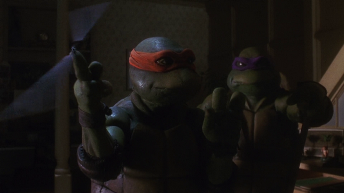 On imaginait une adaptation du dessin animé, c’est pourtant bel et bien une adaptation du comic book que propose ce premier volet, qui corrige au passage quelques libertés prises par la série : Splinter est bel et bien un rat qui a appris les arts martiaux auprès de son maître Yoshi, et non pas ce dernier qui se transforme en rat au contact d’un produit radioactif. Le clan des foot, des robots dans le dessin animé (il fallait bien que les tortues se servent de leurs armes sans choquer la ménagère), sont ici de nouveau des humains. Autre élément repris du comics, la rivalité entre Leonardo et Raphaël sur le leadership de la fratrie, un élément essentiel au développement des personnages, qui n’est pas aussi exploité qu’il devrait l’être. Il est également dommage que Donatello, sensé être l’intellectuel de la bande, soit relayé au rang de sidekick comique, ce qui ne le détache pas de Michelangelo ; heureusement, il y a les bandeaux de couleur, car sinon rien ne les diffère. Shredder est également trop en retrait, trop peu présent, le personnage ne brille que lors du final. En dehors de celui-ci, ses apparitions sont si anodines qu’il n’ apparaît jamais comme une menace. En dehors de la rivalité entre les deux frères, d’autres thèmes sont abordés tel que l’absence de la figure paternelle ou la peur de la perte de celui-ci. Mais là encore, bien que leur présence soit à saluer et que certains moments sont vraiment touchants, ce n’est jamais réellement exploité. Coté effets spéciaux, c’est au Jim Henson Creature Shop qu’est revenue la tache de donner vie aux tortues ninja, des hommes en costumes coiffés de têtes animatroniques blindées de nouvelles technologies qui permettent d’êtres animées à distance. Du bon boulot, que ce soit du coté technique et du coté des cascadeurs qui réussissent des mouvements incroyables quand on sait que les costumes pesaient un poids non négligeable.