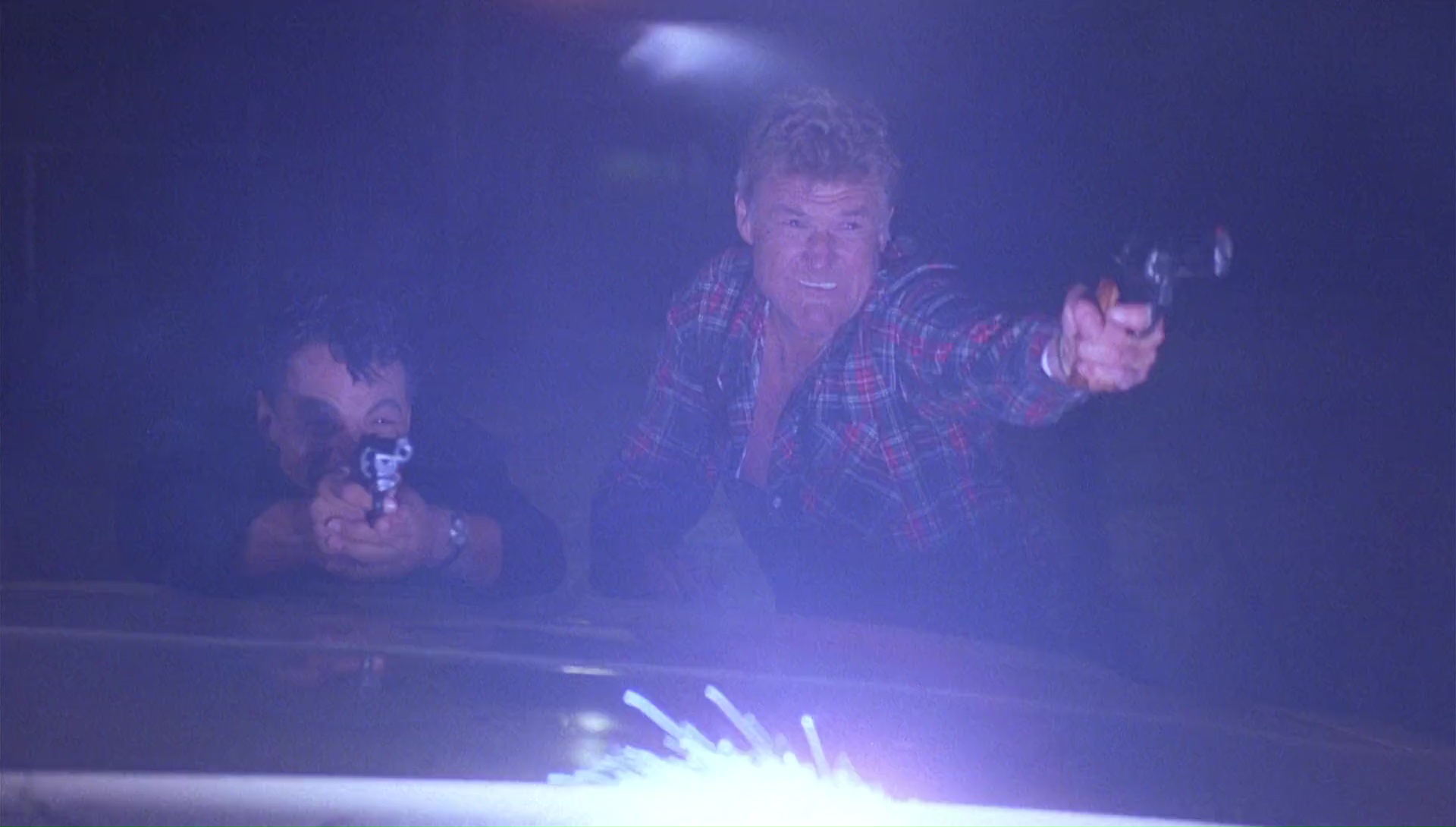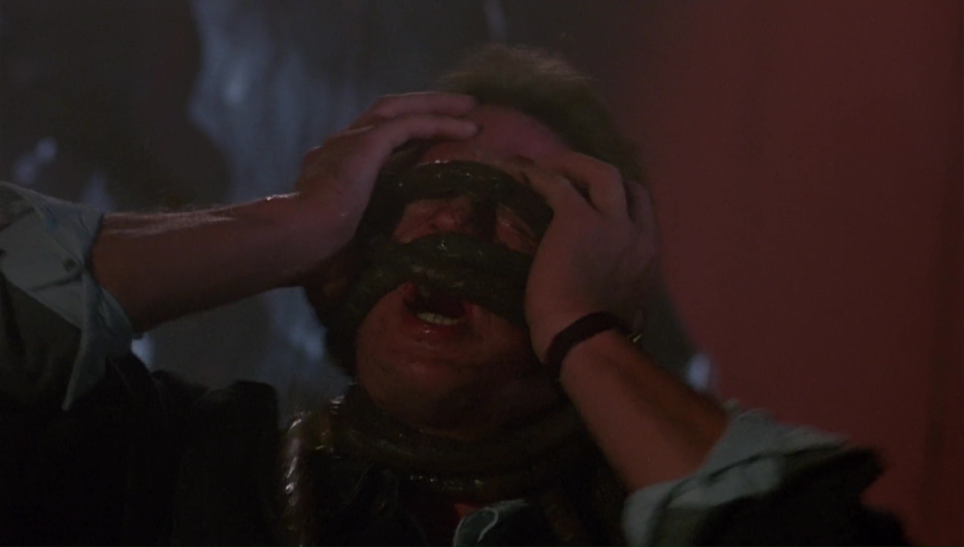 Surtout qu’outre pomper son concept, avec sa créature au design similaire (mais beaucoup moins gracieux à la caméra), le gouvernement qui en a après lui, des monstres plus petits qui sautent au visage de leurs victimes, Ray va parfois jusqu’à reprendre des scènes au film de Ridley Scott, et même à celui de James Cameron. Voir la créature attaquer un personnage alors que celui-ci est distrait par un chat qui prend peur et s’enfuie, désolé mais on connait, un peu trop bien tant la scène est dans l’inconscient collectif. Voir Charles Napier explorer un entrepôt, armé jusqu’aux dents, avec de la vapeur partout autour de lui donnant un côté industriel, ça rappelle fortement le final d’Aliens également. Mais bon, au moins, l’ensemble a clairement la gueule d’un film professionnel. Même si l’on retrouve quelques acteurs approximatifs, des effets pas toujours au top (mais mieux que d’habitude), quelques faux raccords, et quelques réactions débiles dans le scénario. On y suit donc notamment un flic, Ian McLemore, joué par ce bon vieux Charles Napier qui a enfin droit à des premiers rôles (même si dans des films de seconde ou troisième zone), qui suite au crash d’un vaisseau contenant une créature dangereuse, se met à traquer la bête. Au départ juste car c’est son boulot, puis par vengeance lorsque son partenaire se fait dévorer par la bête. Et là, oh surprise, et on le doit totalement à la présence de Charles Napier, totalement investis dans son rôle, et bien, on ne s’ennuie pas entre les différentes attaques. À l’opposé de tous ses autres métrages du réalisateur où on s’ennuie clairement en attendant qu’il se passe quelque chose. Là non, le métrage sait se faire plus ou moins rythmé et évite d’ennuyer, même lorsque certains dialogues sonnent faux. Il faut voir Charles Napier se mettre à jouer d’un instrument pour draguer une collègue, et celle-ci retirer son haut. Charles Napier semble surpris et avoue alors que c’est la première fois que sa technique fonctionne.