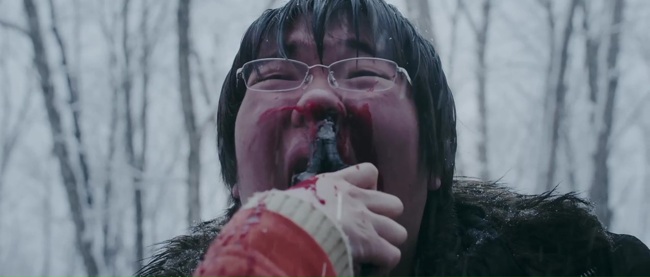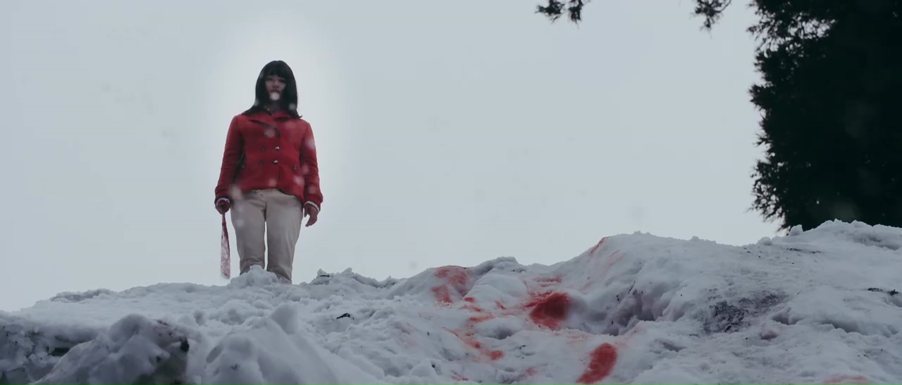 Dans le fond, on ne fait absolument pas plus simpliste et classique. Et puis le harcèlement scolaire, le réalisateur l’a déjà traité par le passé. Mais il soigne son ambiance, lente, prenante. La jeune Yamada Anna, qui tient là seulement son second rôle au cinéma, alors seulement âgée de 17 ans lors de la sortie du film, malgré son manque d’expérience, est totalement convaincante. Au départ victime de harcèlement, elle va alors tomber dans la dépression suite à ces événements, et même perdre la parole. Et lorsque ses camarades de classe ne la lâchent pas malgré ces gros événements destructeurs, la jeune femme, un peu par hasard au départ, va rendre les coups. Puissance 1000. Et à partir de ses premiers pas sur le chemin de la vengeance, le film, qui était déjà froid dans sa mise en scène et dans les interactions entre les différents personnages fait alors intervenir visuellement la neige, qui ne quittera plus le métrage. Et cette neige, si pure, ne va pas rester pure bien longtemps, se retrouvant tâchée de rouge. Abondamment. Pas de demi-mesure ici, non, Haruka prend tout ce qui lui passe par la main et y va franco, jusqu’à crever des yeux, couper des nerfs, défoncer des têtes à coup de tuyau en métal. Liverleaf ne recule pas devant la violence visuelle, loin de là, il fonce en plein dedans, avec à la fois un côté jouissif tellement Haruka va loin et un côté qui fait très mal, face à certaines mises à mort. Elles sont pourtant souvent expéditives, et parfois un brin over the top, mais ça fonctionne du tonnerre. Sans jamais révolutionner le genre bien balisé dans lequel il s’engouffre, Liverleaf fait bien les choses. Alors où est-ce que ça coince ? Dans sa dernière demi-heure, lorsque le film révèle alors toutes ces cartes, et transforme son village en pseudo Twin Peaks mais où tous les habitants seraient Bob, tous seraient des psychopathes en puissance.