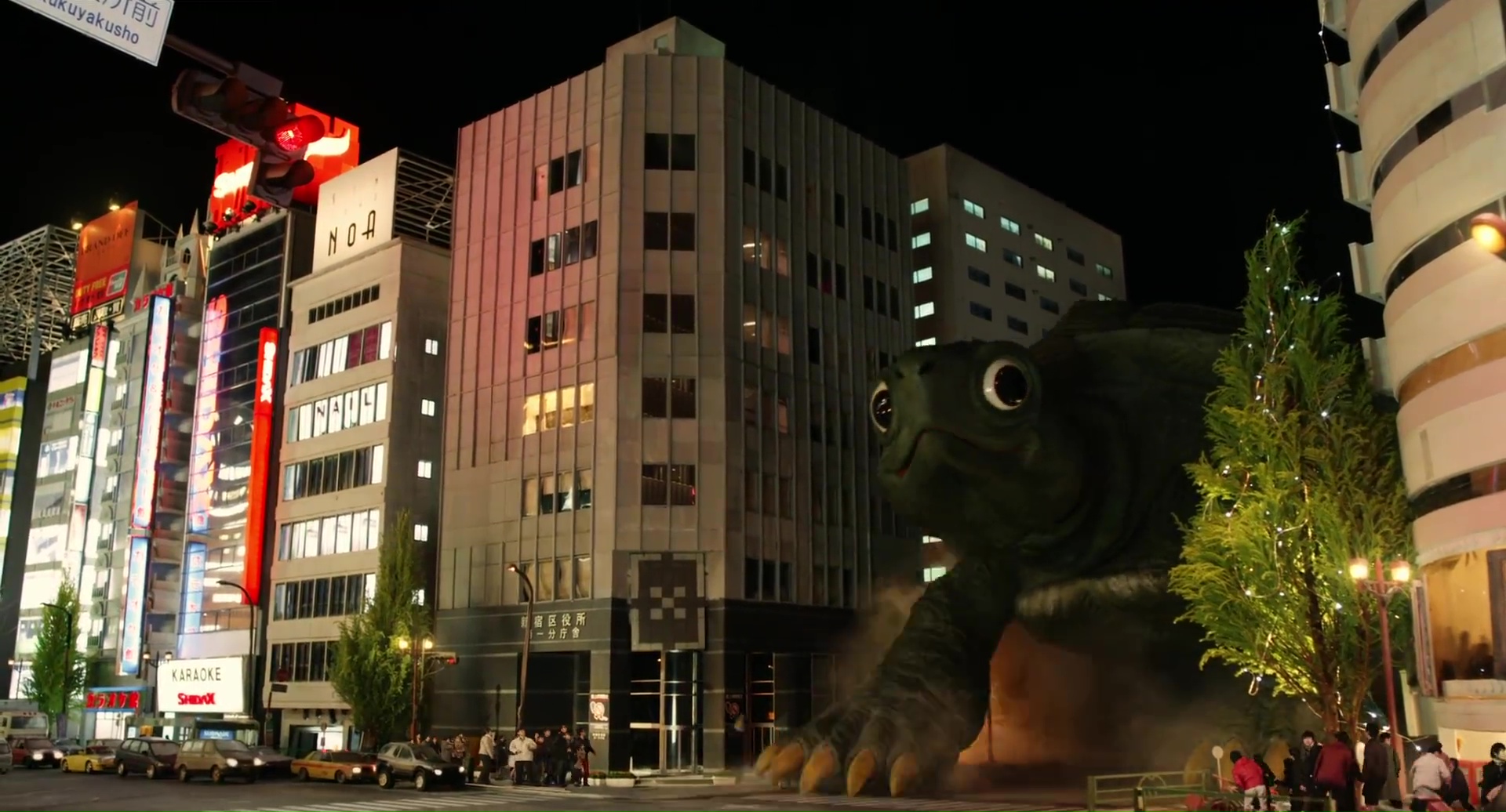 Finalement, il faut attendre la dernière partie du métrage, ou plutôt ses 15 dernières minutes pour avoir droit à du Kaiju Eiga. Ce qui est assez surprenant sachant que cet aspect fut relativement mis en avant. La tortue géante arrivera réellement 15 minutes avant la fin donc, pour une seule et unique scène de destruction. Qui finalement, n’est même pas si utile que ça à l’intrigue, sauf dans ces derniers instants (qui ne sont pas de la destruction). On a l’impression que Sono Sion a surtout voulu se faire plaisir avec cette scène. Et il faut dire que oui, elle est amusante, et voir cette scène purement réalisée à l’ancienne (avec maquette, inserts de tortue en animatronic), ça fait plaisir, ça fait sourire. Puis Pikadon au final, n’est-elle pas le personnage le plus attachant du métrage, une tortue qui ne pense qu’au bonheur de son maître, qui n’a pas des besoins humains et donc reste toujours fidèle à sa nature ? Ben moi je vous dis que si ! Dommage franchement que le film dans son ensemble ne garde pas la légèreté du début. Love & Peace n’est donc pas un chef d’œuvre, mais c’est clairement moins lourd et vulgaire qu’un Tokyo Tribe, plus posé qu’un Tag, moins con et répétitif qu’un The Virgin Psychics, et en soit, c’est déjà bien.