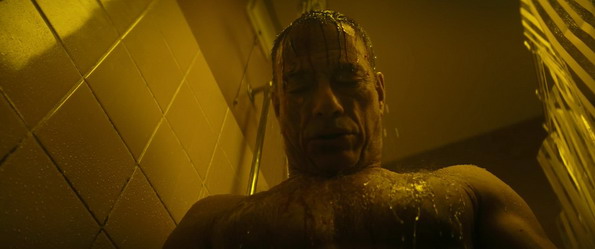 D’entrée de jeu, l’esthétique du film semble très soignée. Ça sera d’ailleurs le cas tout le long. Julien Leclercq peaufine ses plans, met en place un jeu très réussi d’ombres et de lumières, et donne une jolie patte graphique à certaines scènes en début de film via l’utilisation de néons (ce qui fera plaisir à Rick). Le réalisateur sait ce qu’il fait et il le fait très bien, comme par exemple lors d’un plan séquence très impressionnant commençant par un Van Damme à l’extérieur d’une maison, l’inspection de la maison, le kidnapping d’une personne assorti d’un gunfight, puis la sortie de la maison et la fuite en voiture. Une scène très puissante d’autant plus qu’elle est quasiment silencieuse, ce qui permet de se rendre compte que, dès qu’il n’y a pas ou peu de son, on est beaucoup plus attentif à ce qu’il se passe à l’écran. Et ça, le réalisateur l’a très bien compris. Les silences sont pesants, surtout lorsque l’histoire qu’on nous raconte est sombre, dramatique, et pour appuyer ces silences, un gros travail a été effectué au niveau de la musique.