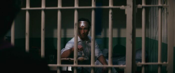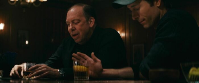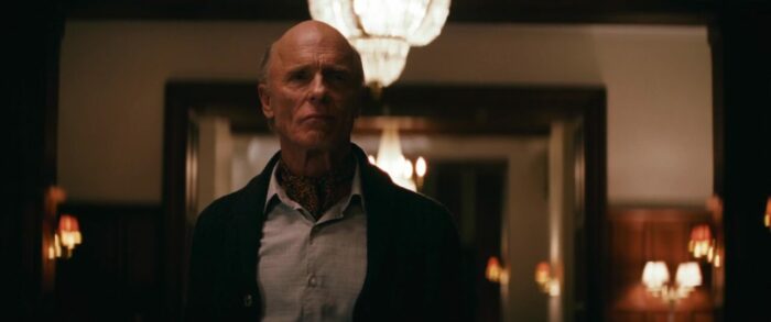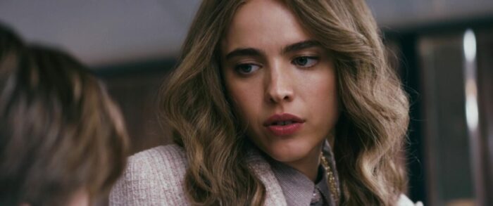 Contrairement à Running Man et son futur sombre, L’Ultime Héritier joue donc tout simplement dans la cour du film plus actuel, et lorgne vers la comédie noire. Est-ce que ça marche ? Oui, dans le fond, j’aurais passé un très bon moment devant le métrage, tout en me disant qu’avec quelques ajustements dans l’écriture, pour une approche constante thématiquement parlant tout du long de l’aventure, ça aurait pu, voir dû être beaucoup mieux. Alors, analysons ça, tout en ne révélant pas les cartes que le métrage veut absolument jouer, peu importe que ça fonctionne, ou pas. Le métrage, d’entrée de jeu, et c’est presque annoncé par le personnage qui raconte son histoire à un prêtre, et donc, par extension, aux spectateurs, mais l’histoire sera aussi invraisemblable que tragique. Le côté invraisemblable, évidemment, ce sera tout ce qui sera traité sur le ton de la comédie noire. Quand au côté tragique, ça lorgnera plus vers le drame et le thriller bien plus classique. Vouloir mélanger les deux, pourquoi pas, surtout que chaque partie a ses grandes qualités. Malheureusement, l’ensemble se fait parfois déséquilibré, comme si chaque partie du récit voulait manger un peu plus de temps d’écran, quitte à parasiter l’autre. En gros, toute la première partie du récit, avec les premiers meurtres commis, le passé du personnage, tout ça, ce sera clairement de la pure comédie noire, et ça fonctionne, entre personnages perchés, de l’ironie mordante, des acteurs qui se font plaisir en cabotinant (Zach Woods et Topher Grace, par exemple), et même un comique de répétition qui va amener le FBI dans l’intrigue, même si au final, ils seront totalement inutiles. Ce côté comédie noire parfois jouissif, il s’absentera alors pour la seconde partie du récit, pour ne revenir que lors du final. Le côté plus classique, plus tragique, forcément, il concernera les gros enjeux de l’histoire avec le grand-père (impérial Ed Harris comme toujours), mais surtout la femme fatale du récit, Margaret Qualley, bien que finalement bien trop souvent en retrait pour pleinement fonctionner.