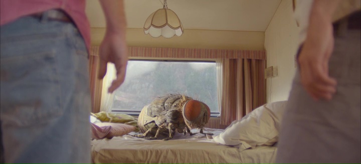 Il y a quelque chose, malgré quelques excentricités, de beaucoup plus positif dans Mandibules, mais également de plus accessible. Alors, tout cela, c’est uniquement du ressenti face à une œuvre que j’aurais apprécié, mais qui m’aura quelque peu laissé sur ma faim. Une faim de mouche ? Pourtant, oui, déjà, techniquement, on y retrouve la patte Dupieux, forcément, vu qu’il écrit, réalise, s’occupe toujours de la photographie, du montage, tourne toujours à la vitesse de l’éclair pour une bouchée de pain. Dans son scénario, s’il est plus accessible, il distille malgré tout quelques idées bien à lui et qui ramènent clairement à ces anciennes œuvres. Outre le check entre les personnages et leur côté simpliste qui ramène à son premier et génial Steak, son animal improbable qui ne devrait pas exister comme un pneu tueur dans Rubber (la mouche que l’on retrouve buvant dans la piscine rappelle clairement le second métrage de Dupieux), sa galerie de personnages allant de l’imbécile heureux à l’excentrique criant jusqu’au gosse de riche pas très intéressant, que l’on peut voir comme une critique de différents stéréotypes de personnages, ce qui n’est pas nouveau également chez Dupieux. Et oui, mine de rien, malgré l’accessibilité plus grande du métrage, loin du mindfuck d’un Réalité, de l’univers détraqué d’un Wrong ou de l’excentricité made in slasher du Daim, Mandibules reste une comédie parfois amusante, parfois savoureuse, avec un duo qui fonctionne bien à l’écran, à l’image d’Eric et Ramzy qui mettaient leur humour de côté le temps de Steak, et bien, même chose ici pour le duo Grégoire Ludig et David Marsais. La vraie question, c’est tout simplement, finalement, est-ce que Quentin Dupieux, après avoir fait le plaisir des critiques et d’une niche de cinéphiles, n’aimerait pas quelque peu toucher un public un poil plus grand, et normalement réfractaire à l’absurde ? Chivers ! Ah non, Taureau maintenant !