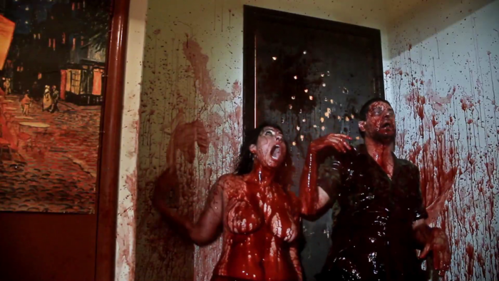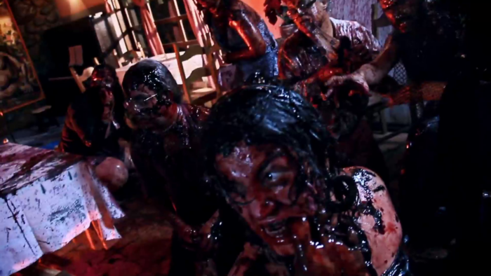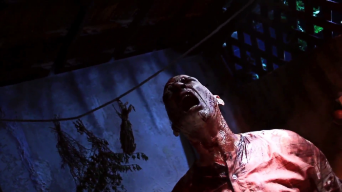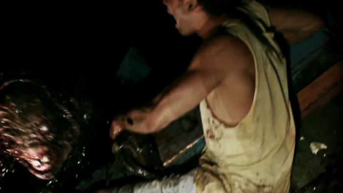 Tout comme avec Mangue Negro, Rodrigo Aragão ne fait pas un film de zombie vide de sens et parle d’écologie. Après la pollution qui infecte les mangroves et les communautés pauvres qui vivent de la pêche, le réalisateur parle ici de celle de l’océan soumis à des rejets de polluants industriels et agricoles fragilisant ainsi l’ état de santé des peuplements piscicoles, des écosystèmes et par extension des communautés qui ont fait du poisson leur source principale d’alimentation. Exit donc la boue des mangroves, ici la menace vient de l’océan duquel deux pêcheurs remontent une créature qui pourrait être une sirène agressive qui mord l’un des deux bougres. Le mordu se transforme bien évidement en zombie et commence à faire un carnage mais il n’est pas le seul, car en massacrant le monstre, son sang noir contamine l’océan et donc les poissons qui mangés par les habitant d’un petit village dans lequel un bordel vient d’ouvrir va déclencher un déluge de gore. Déluge qui met bien trop son temps à arriver. Mar Negro manque de rythme, la faute à un scénario qui à l’instar de Mangue Negro est développé maladroitement. C’est tout à l’honneur de Rodrigo Aragão d’ élargir son idée, mais entre une multiplication de personnages qui arrivent trop tard dans l’histoire et une sous intrigue à base de magie noire qui certes montre que le réalisateur développe son propre univers (on trouvera par exemple des traces de cette magie noire dans un film ultérieur : El Bosque Negro), est au final inutile et non résolue. Le temps se fait long et le métrage ne décolle réellement que dans sa dernière demi-heure.