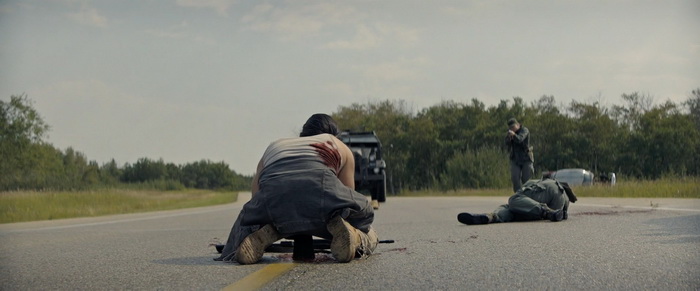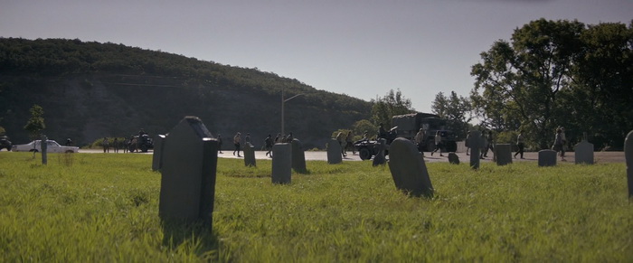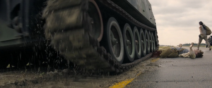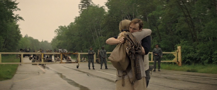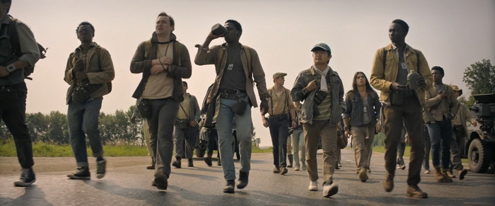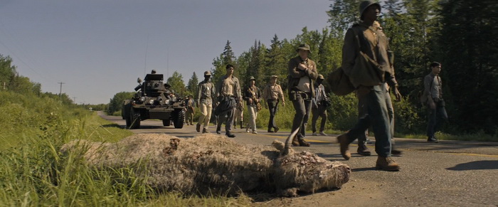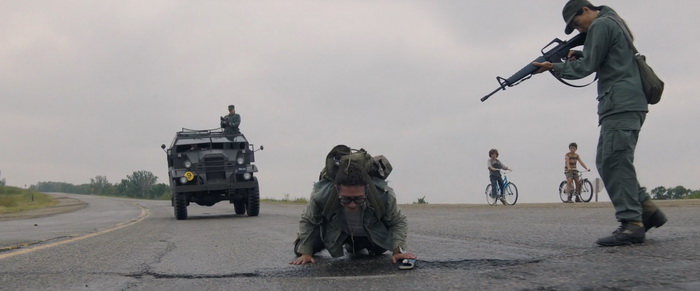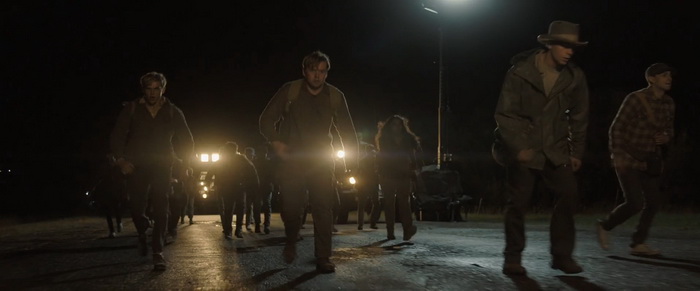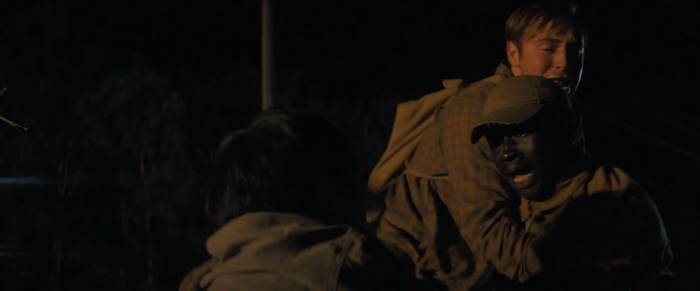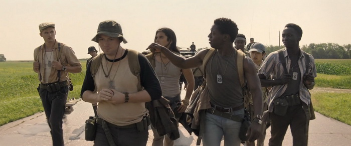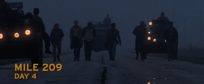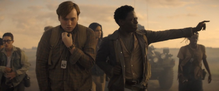 Marche ou Crève sait se faire éprouvant, pour ses personnages bien entendu, mais aussi pour le spectateur. Le rythme est possiblement volontairement lent, comme si le réalisateur voulait qu’on accompagne ces jeunes dans ce long et éreintant périple. Même chose en ce qui concerne la monotonie de la mise en scène lors des plans de marge, comme si on voulait nous mettre dans la même condition qu’eux lorsque les longues minutes / heures s’enchainent sans faire autre chose que marcher. La photographie est par contre parfois problématique. Certes, il y a de très beaux plans jouant beaucoup avec les lumières, les ombres, les moments de la journée, avec des personnages parfois presque en ombres chinoises. Mais d’un autre côté, les couleurs désaturées est un gimmick un peu trop vu et revu pour montrer un monde dystopique dépressif et le résultat visuel est fade, trop fade pour réellement retenir l’attention. On comprend le pourquoi du procédé, mais il ne surprend plus. Néanmoins, le monde dépeint est intéressant, certes pas assez développé, mais l’ambiance y est lourde, le tout appuyé par une bande son des plus intéressantes soulignant parfois l’état psychologique de certains personnages. La critique du capitalisme est là, tout comme sa cruauté, celle de nos sociétés qui deviennent un peu trop conservatrices (surtout avec le retour de Trump aux States), mais aussi celle du voyeurisme des médias qui consomment la souffrance des autres comme un divertissement, nous mettant pour le coup au même niveau que les quelques spectateurs en bord de route, attendant le passage de ces jeunes juste pour les voir mourir. Face à cela, ces jeunes n’ont plus que la camaraderie comme barrière contre la course inhumaine à laquelle ils participent. On pourra reprocher au film de ne pas assez développer tous les personnages secondaires, beaucoup n’étant là que pour être de la « chair à canon », mais les personnages centraux le sont suffisamment pour qu’on s’attache très vite à eux et que, pour le coup, on souffre avec eux. L’interprétation des jeunes Cooper Hoffman (Old Guy, Saturday Night), David Jonsson (Alien Romulus, L’Espion de Dieu) et Tut Nyuot (Steve) est d’ailleurs à saluer, tout comme la dynamique entre les personnages. Ce sont eux qui portent le film sur leurs épaules tant ils arrivent à la perfection à donner vie à leurs rôles, compensant même parfois le flou de l’univers dans lequel ils évoluent. Oui, définitivement, pour moi, ce sont bel et bien les mid-budget qui sauveront Hollywood de la débandade.