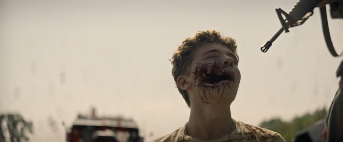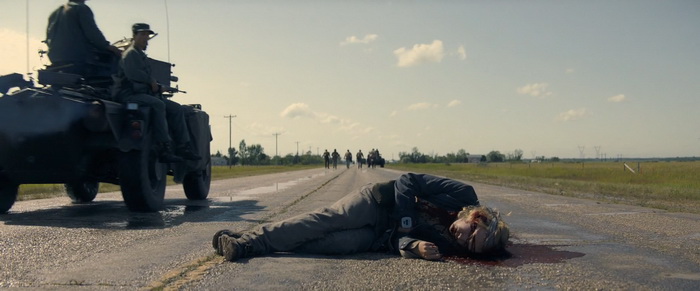 A l’instar d’œuvres telles que Battle Royale (2000) ou la série Squid Game (2021), Marche ou Crève nous présente une société en ruine en prise avec un régime totalitaire qui met en place des mesures improbables pour régler certains problèmes, et une population tellement appauvrie, manipulée, qu’elle est capable de participer volontairement à ces mesures improbables, ici, une longue marche à laquelle des jeunes gens s’inscrivent et dont il ne restera qu’un survivant, avec au bout l’espoir d’un monde meilleur grâce à de l’argent. Le parti pris de Marche ou Crève est de rester assez flou sur le monde dystopique qui est dépeint, laissant au spectateur le choix de s’imaginer lui-même ce qu’il souhaite, comme par exemple faire le lien avec les conséquences de la guerre du Vietnam sur les Etats-Unis, ou de voir dans cette longue marche un parallèle avec ces longues marches que les nazis faisaient faire aux prisonniers des camps de concentration. Ici, il n’y a que trois règles : ne pas perturber la longue marche ; ne jamais descendre en dessous de 5km/h ; ne pas s’écarter de la route. Tout manquement donne droit à un avertissement, et au bout de trois avertissement, c’est une balle dans la tête. Pendant 1h48, nous allons suivre ces 50 jeunes qui vont petit à petit diminuer en nombre et tomber dans la déchéance physique et morale au fur et à mesure que les kilomètres avancent, que les jours passent, que la folie due à la situation et à l’accumulation de fatigue s’empare de certains à cause de cet appât du gain pour le vainqueur. Marche ou Crève est un film rude, rêche, qui ne caresse pas dans le sens du poil et qui ne fait rien pour être aimé, montrant crument le destin funeste de ces jeunes pour remuer le spectateur qui n’a d’autre choix que d’assister impuissant à cela. Chaque exécution est une petite épreuve pour le spectateur tant la façon de les mettre en scène est violente et directe.