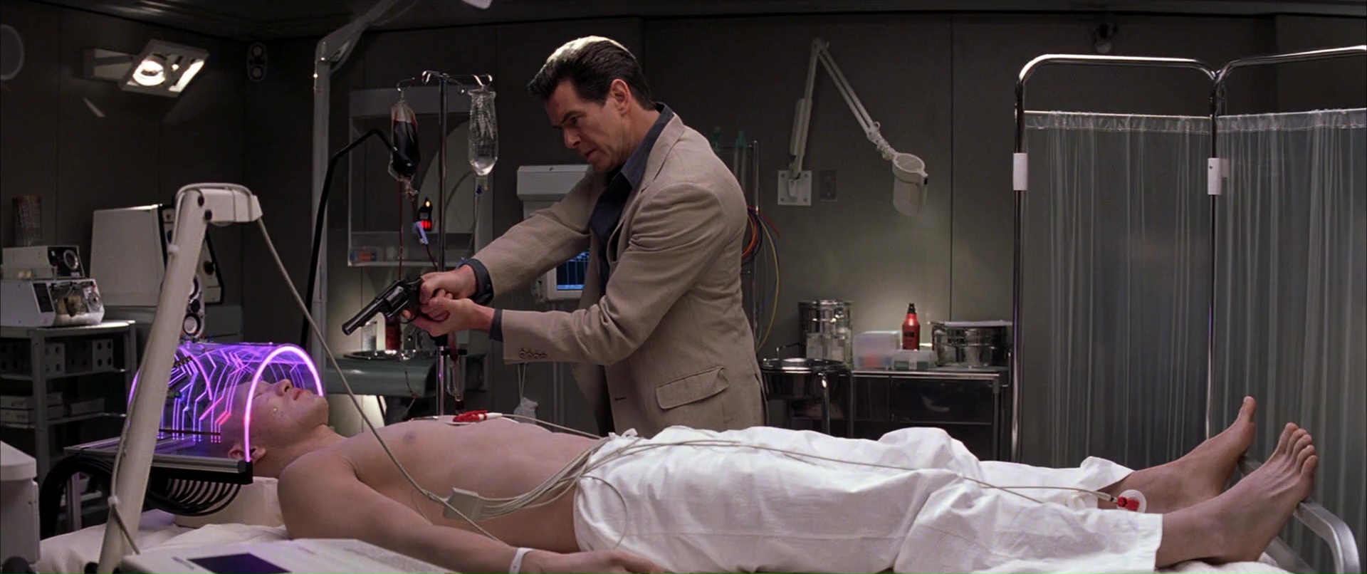 Le film pourrait se rattraper avec son histoire, ses méchants ou encore ses scènes d’action. Sauf que Meurs un Autre Jour, c’est le film over the top par excellence qui part dans le nanar complet et semble ne même pas en avoir honte. Maintenant, même Pierce Brosnan se marre totalement en interview en repensant aux scènes WTF du film, et même les producteurs s’excusent du surplus de gadgets et tout du film. Du coup moi je commence à cracher mon venin sur quel élément ? Bon passons rapidement sur l’histoire alors. C’est débile. En gros, un méchant Coréen qui fait de la chirurgie et se retrouve avec la tête d’un anglais roux ! Ouais, véridique. Et pour prouver qu’il est méchant, il termine le film dans une tenue ridicule que Mr Freeze de Batman & Robin n’aurait pas renié ! En plus de la chirurgie ridicule, heureusement un brave docteur nous explique tout… Dans Meurs un Autre Jour, t’inquiètes pas, on te fait une opération qui te retire ton ADN et ta moelle épinière et on te les remplace par l’ADN d’un porteur saint…. SCÉNARISTES, ÇA N’A PAS DE SENS, SAVEZ-VOUS COMMENT FONCTIONNE LE CORPS HUMAIN ET L’ADN ??? Personnages, histoire, rien n’a de sens, tout se tire en couille, et tout est fait avec le plus grand sérieux du monde, si bien que Meurs un Autre Jour fait rire, jaune, tout le temps. Un pur nanar. Histoire ratée, personnages ratés, bon il y a l’action au moins vous me direz ? Oubliez les cascades impressionnantes de la saga, place à la technologie et aux CGI.