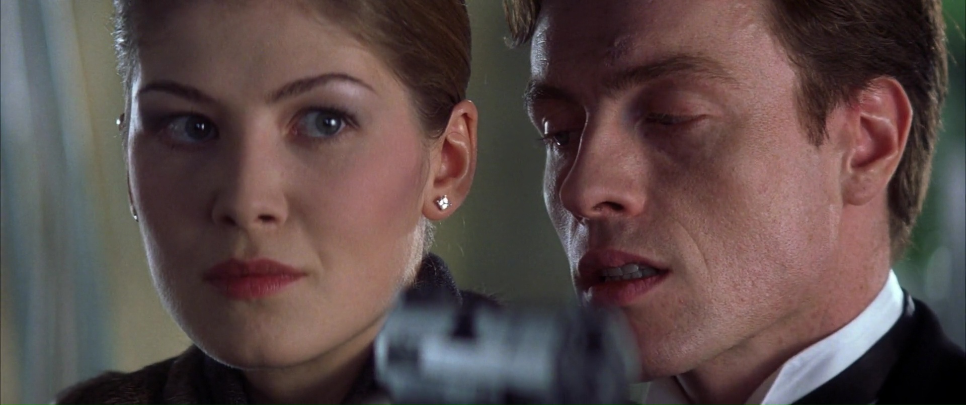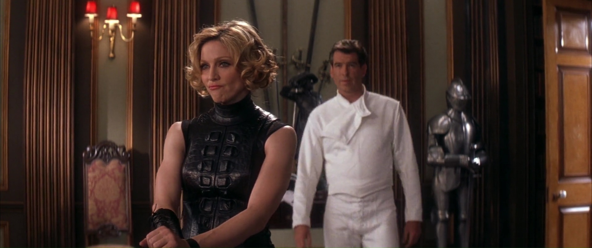 La scène pré-générique en Corée, à l’exception de fonds verts hideux qui feraient rougir Goldeneye pourtant datant de 7 ans auparavant, envoi du pâté. Explosions dans tous les sens, fusillades, poursuites en aéroglisseurs, champ de mines, cascades (sur fond vert aaaaah), ça envoie du lourd. Puis notre pauvre Bond est capturé par l’ennemi, torturé durant des mois sur un générique que je n’aime pas du tout (j’aime bien Madonna, mais mettre une chanson de Madonna avec voix déformée sur le premier générique de la saga qui compte raconter les sévices de James via ce générique, ça passe moyen), est libéré, puis désavoué par le MI6 (encore ?) et va tout faire pour accomplir sa mission en solo, trouver le traitre qui l’aura fait capturer, tuer les méchants, voilà voilà. Dés le départ, on note plusieurs idées sympathiques ici. Un James torturé, désavoué, qui va agir seul et qui… non en fait non ça ne changera rien au film, on le verra seul pendant quelques minutes (45 minutes de film), avant que le MI6 lui dise « hey t’es utile en fait reviens » et voilà, fin, ça n’amène que dalle, aucun élément d’histoire, aucune surprise, aucun développement de personnages. Fidèle à la saga, James va voyager, de la Corée à Cuba, en passant par Londres, tout ça tout ça. On aura les Bond Girls, avec deux filles, une que j’apprécie beaucoup (Rosamund Pike, malgré l’écriture désastreuse du personnage), et une beaucoup moins (Halle Berry, et son absence d’écriture). Deux personnages que l’on résumera à « bonjour, on m’annonce qu’il y a un traite, je suis nouvelle au MI6, mais promis c’est pas moi » et « bonjour, je sors de l’eau, on baise ? ».