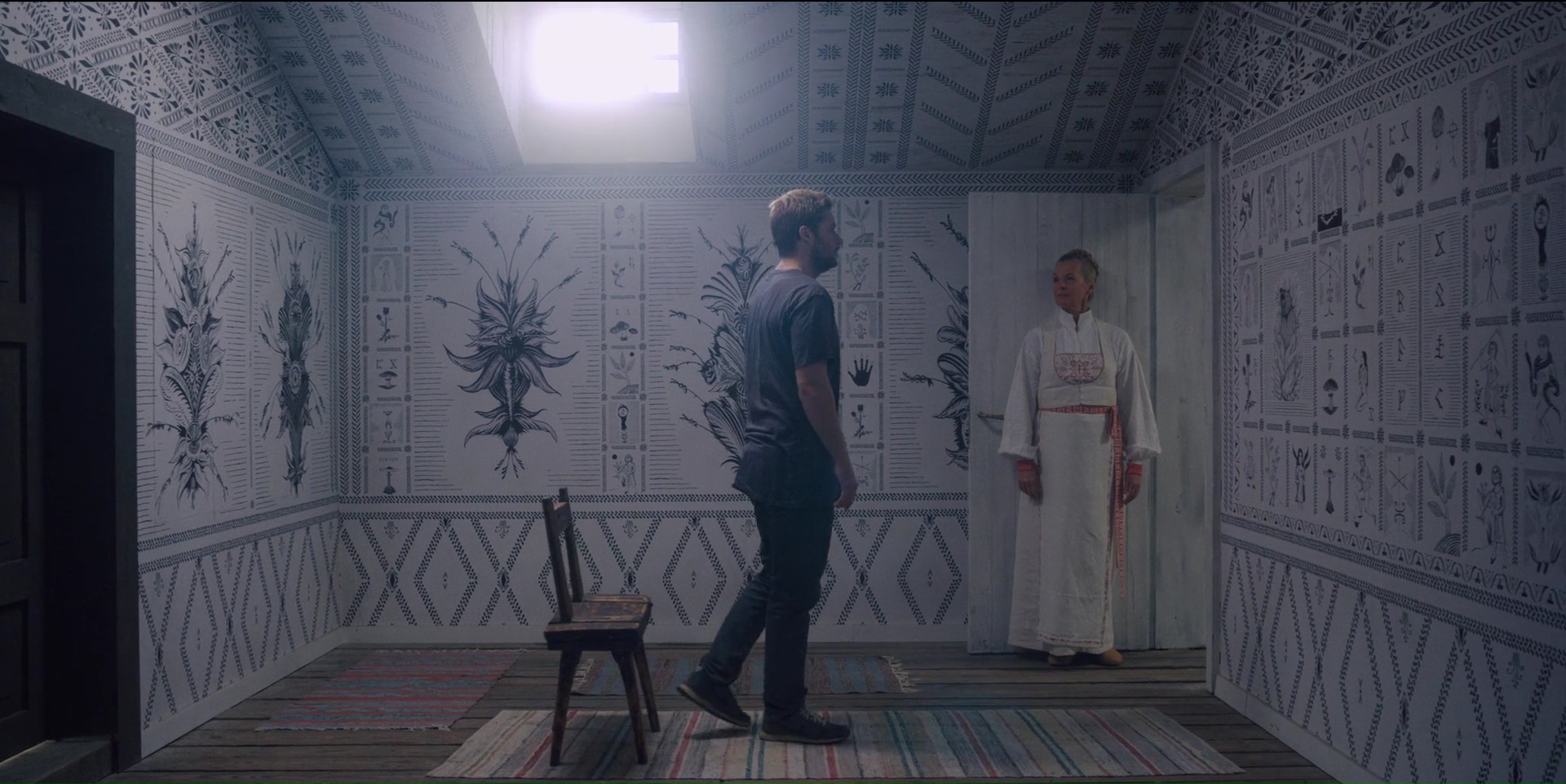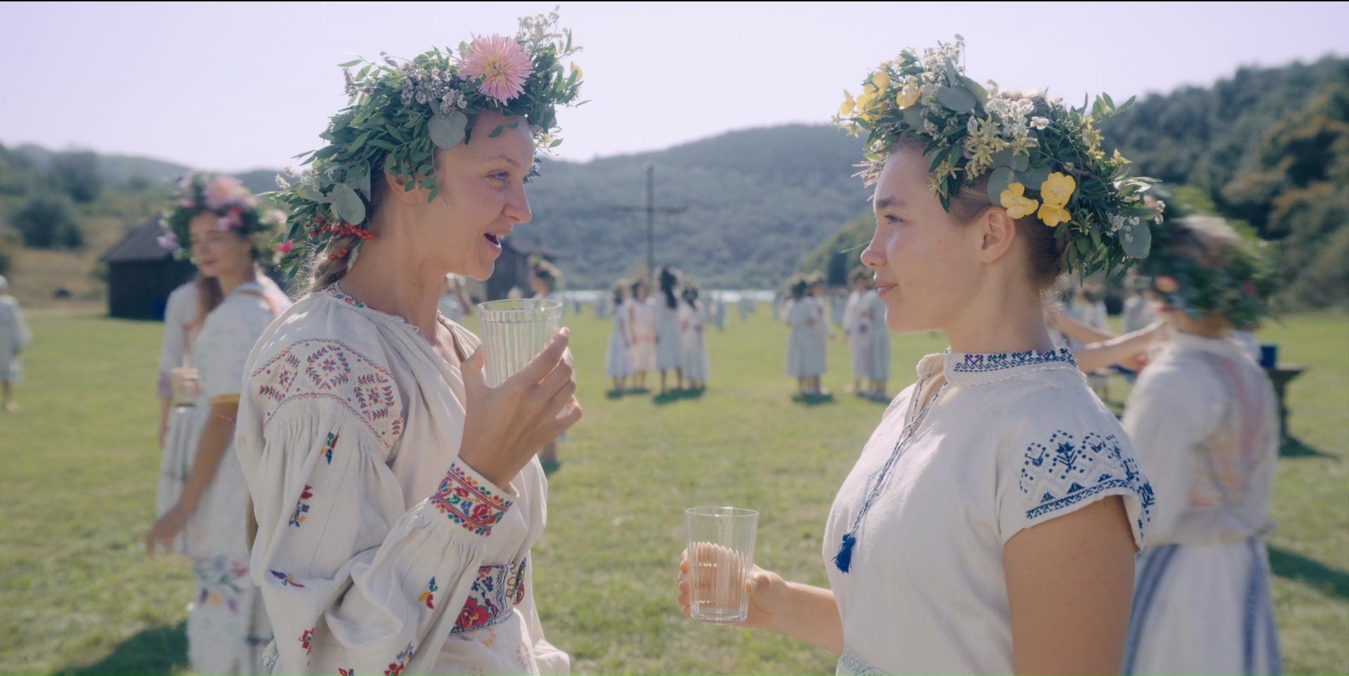 Il y a juste un an, Hereditary (Hérédité) m’avait fait forte impression. Certes, le final était en dessous du reste et plongeait un peu dans la facilité du cinéma de genre actuel, mais tout ce qui précédait était parfait. Choc, ambiancé, et le réalisateur, Ari Aster, qui signait son premier film, faisait preuve d’une certaine virtuosité dans sa mise en scène qui nous racontait quelque chose, en plus bien entendu de se montrer être un directeur d’acteur formidable. Alors quand à peine un an après débarque Midsommar, son second long métrage, qui en plus de prendre à revers tous les tics du cinéma de genre (le film se déroule intégralement de jour sous un soleil de plomb, il n’y a aucun jumpscare) rend hommage à The Wicker Man, que j’adore, et bien je jubile. Ari Aster avait après tout prouvé qu’il était un réalisateur à suivre, en espérant qu’il ne se fasse pas parasiter par les studios et un certain cinéma grand public. Fort heureusement, ce n’est aucunement le cas, et si l’on retrouve toutes ces obsessions dans Midsommar, on peut même affirmer qu’il radicalise sa proposition de cinéma. Pas de final convenu comme dans Hereditary, une histoire qui se livre sous forme de trip sous acide qui ne met pas vraiment à l’aise, et une mise en scène qui sert encore une fois autant à nous faire ressentir diverses émotions qu’à nous raconter quelque chose. Dans Midsommar donc, il est encore question de deuil. Dani perd sa famille. Et Ari Aster, connaissant sur le bout des doigts la grammaire cinématographique, impressionne en seulement quelques instants, avec un plan tout simple, mais qui a beaucoup à raconter. Les vingt premières minutes du film, avant l’arrivée de Dani et sa bande dans un village Suédois isolé, fait preuve d’une belle maîtrise formelle de l’image. Dani pleure dans les bras de son petit ami, et la caméra avance vers eux, les dépasse et nous montre ce qu’il se passe à l’extérieur, par la fenêtre. Pour beaucoup, un plan très joli et anodin, mais finalement signifiant bien plus (que la solution aux soucis de Dani se trouve dans son ouverture au monde extérieur).