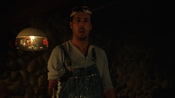 Ce n’est guère étonnant de retrouver dans Monster Man cet humour pipi-caca-cul-nibard puisque les deux films précédents du réalisateur, Michael Davis (Shoot’em Up), étaient deux rejetons d’American Pie, à savoir 100 Girls (2000), et American Sexy Girls (2002). L’humour crétinoïde va venir ici des deux protagonistes principaux, Adam, joué par Eric Jungmann, pas sorti de son rôle dans Sex Academy (2001), et Harley, interprété par un Justin Urich (How High) qui semble bien trop content d’avoir enfin un premier rôle. Le côté sexy va venir de la très belle Aimee Brooks (Annie dans Critters 3) et de son sex-appeal naturel. Après une introduction nous annonçant du gore qui tâche façon Saw avant l’heure, le change de cap pour partir dans son délire comico-débilo-fatigant dans lequel, alors en route pour aller assister à un mariage, nous deux amis vont passer leur temps à se chamailler et à se faire des blagues toutes plus lourdingues les unes que les autres, tombant régulièrement dans le bon gros vulgaire. Et oui, que voulez-vous, l’un d’eux est puceau et se réserve à la « bonne », l’autre est un gros lourd qui ne pense qu’au cul et qui en parle tout le temps. Et forcément, quand l’atout charme du film va rentrer en jeu, les blagues grivoises vont continuer, à base de main dans le soutif, de concours de bisou, et de qui la forniquera en premier. Je citais American Pie en intro, fleuron de l’humour bien graveleux (même si moins con qu’il en a l’air), mais Monster Man arrive à faire bien pire en moins de temps. Alors malgré tout, certains gags fonctionnent, surtout dans la seconde moitié du film, lorsque l’humour à la con vient se mêler au côté craspec du film, mais ce n’est clairement pas cette facette là de Monster Man qui fonctionne le mieux et qui retient réellement l’attention.