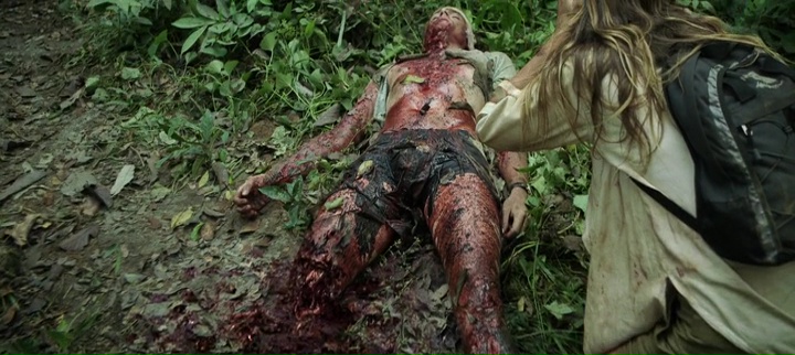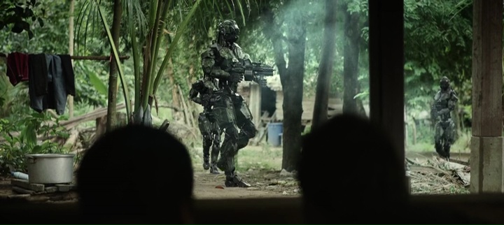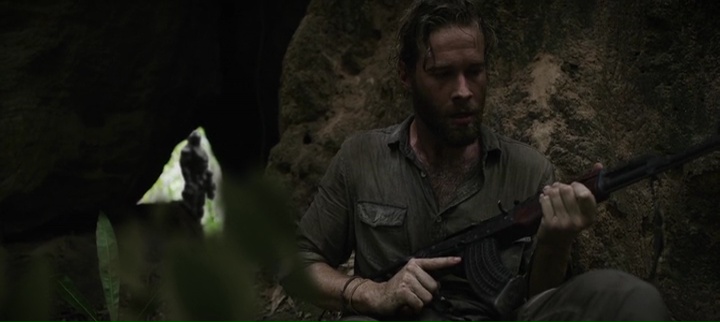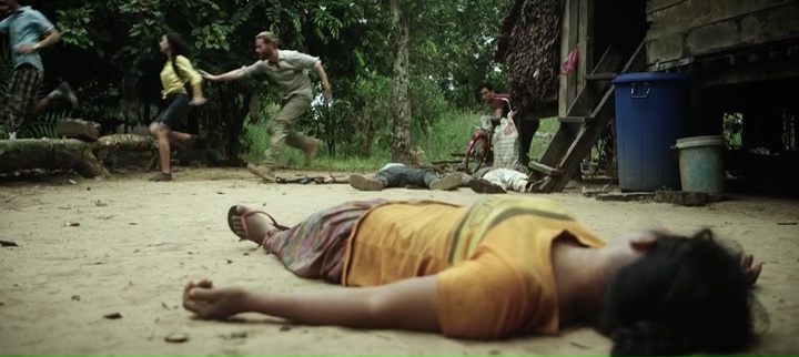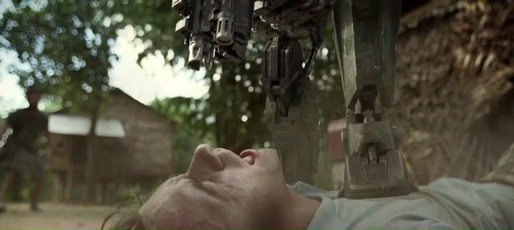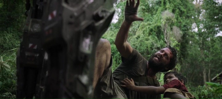 Et face à nos robots, un village, dans lequel six américains venus aider dans les pays pauvres se retrouvent, ainsi qu’un ancien militaire ayant déserté et refait sa vie. Du classique sur toute la ligne, il faut des personnages autres que de simples villageois ou terroristes pour les suivre pendant tout le long, et de préférence, un personnage avec un background militaire pour lui permettre de lutter. Rien de nouveau oui, mais il faut avouer que le film de Mark Toia a malgré tout quelques atouts, notamment un sérieux à toute épreuve dans sa mise en scène (sérieux et propre) et dans ses effets spéciaux, les robots étant la plupart du temps crédibles à l’écran, dans leurs mouvements, leurs animations. Si bien que l’on peut croire à leur présence, on sent véritablement un poids lorsqu’ils marchent, lorsqu’ils avancent vers leur cible, ou lorsque tout à coup, ils deviennent un peu plus souples et se mettent à tuer tout ce qui passe devant eux, même les femmes et les enfants. Car Monsters of Man est assez radical dans sa mise en application, les enfants se font flinguer à bout portant assez souvent. Par moment, on aura même des plans que l’on pourra qualifier de gore, avec des corps qui explosent en passant malencontreusement sur des mines cachées, ou lors d’une scène où le robot défectueux du métrage voudra découvrir l’anatomie humaine, ou ouvrant un corps pour voir les organes. Le sérieux a toute épreuve du film fonctionne en tout cas plutôt bien, et cette traque dans la jungle, qui sait varier les décors avec des villages, la jungle elle-même, puis des grottes et autres ruines, peut devenir prenante, même s’il est difficile de s’attacher aux personnages et donc de prendre leur parti.