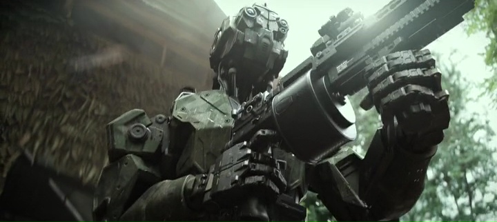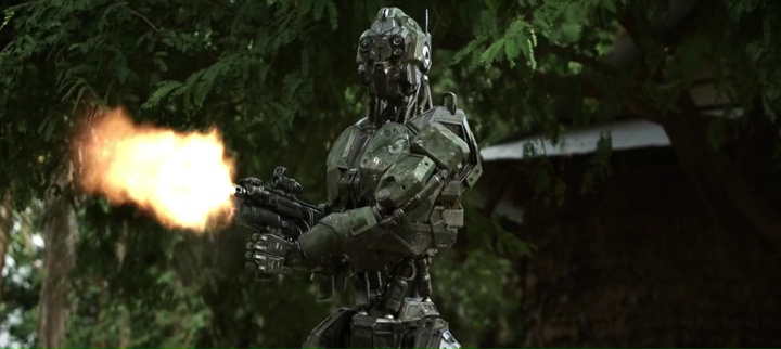 Financé via une campagne de financement participatif, je n’aurais jamais entendu parler de Monsters of Man si ce cher Oli d’Échec et (ciné)mat ne m’avait pas montré il y a quelques mois le trailer. Voir des robots au design ressemblant à Chappie faire un carnage dans la jungle, ça pouvait être fun. Une série B bourrine qui fait le job et repose les neurones. Et en soit, Monsters of Man, c’est exactement ça. On aurait presque pu dire même que c’était une excellente série B, si le film n’avait pas un gros défaut dans sa poche : sa durée. Car quand une série B n’invente rien, et ne vise que le divertissement au final, avec un concept tenant sur un post-it (des robots tueurs et pas très bien gérés qui pourchassent un groupe de civils dans la jungle), 2h10, c’est long, beaucoup trop long. Sans être désagréable, mais on se dit très rapidement qu’avec 40 voir 50 minutes en moins, le divertissement aurait été super rythmé. Monsters of Man donc, c’est l’histoire de trois pauvres ingénieurs en robotiques qui doivent, un peu malgré eux, envoyer quatre prototypes dans la jungle afin que la CIA éliminer un village suspecté de fournir des trafiquants, en médicaments, armes, tout ça. Bien entendu, film de genre oblige, les quatre robots ne vont pas fonctionner comme prévu, notamment un des modèles, dont la carte principale lui servant à se connecter au réseau (et donc de recevoir des ordres directs) est volée par un enfant qui passait par là avec ses amis. On retrouve dans le fond de Monsters of Man tous les clichés du sous genre robotique au cinéma. L’intelligence artificielle défaillante, le robot qui n’en fait qu’à sa tête, qui se met à apprendre tout seul, les modèles indestructibles, et qui en cas de vrai danger, sont dotés d’un système d’autodestruction produisant une grosse explosion.