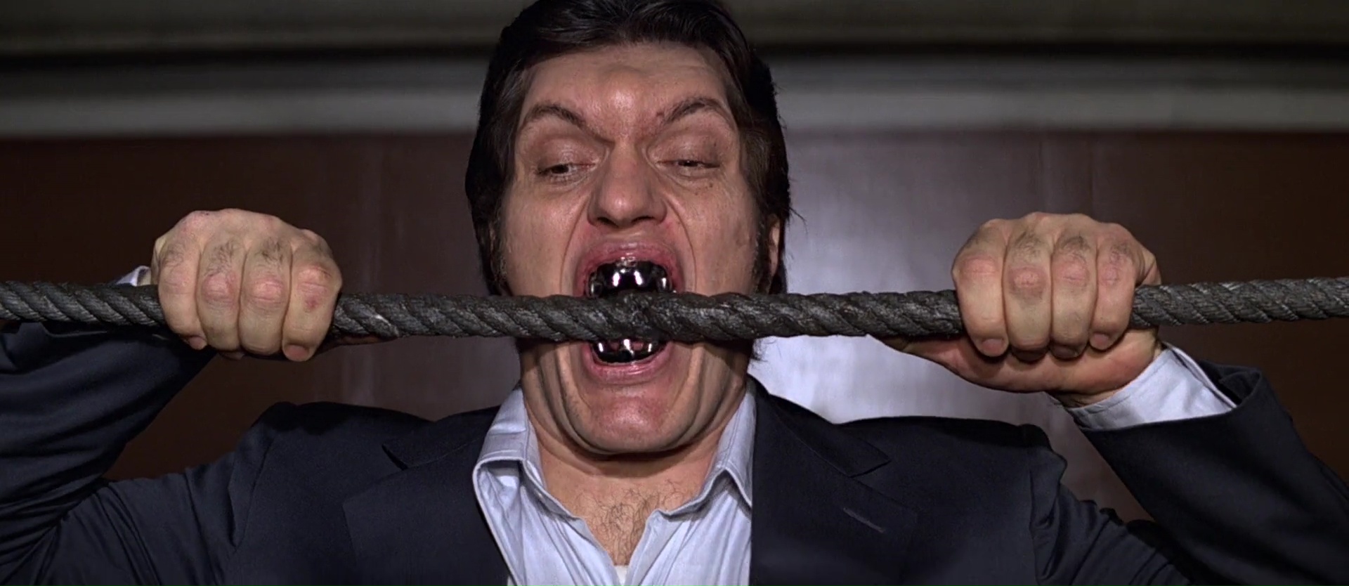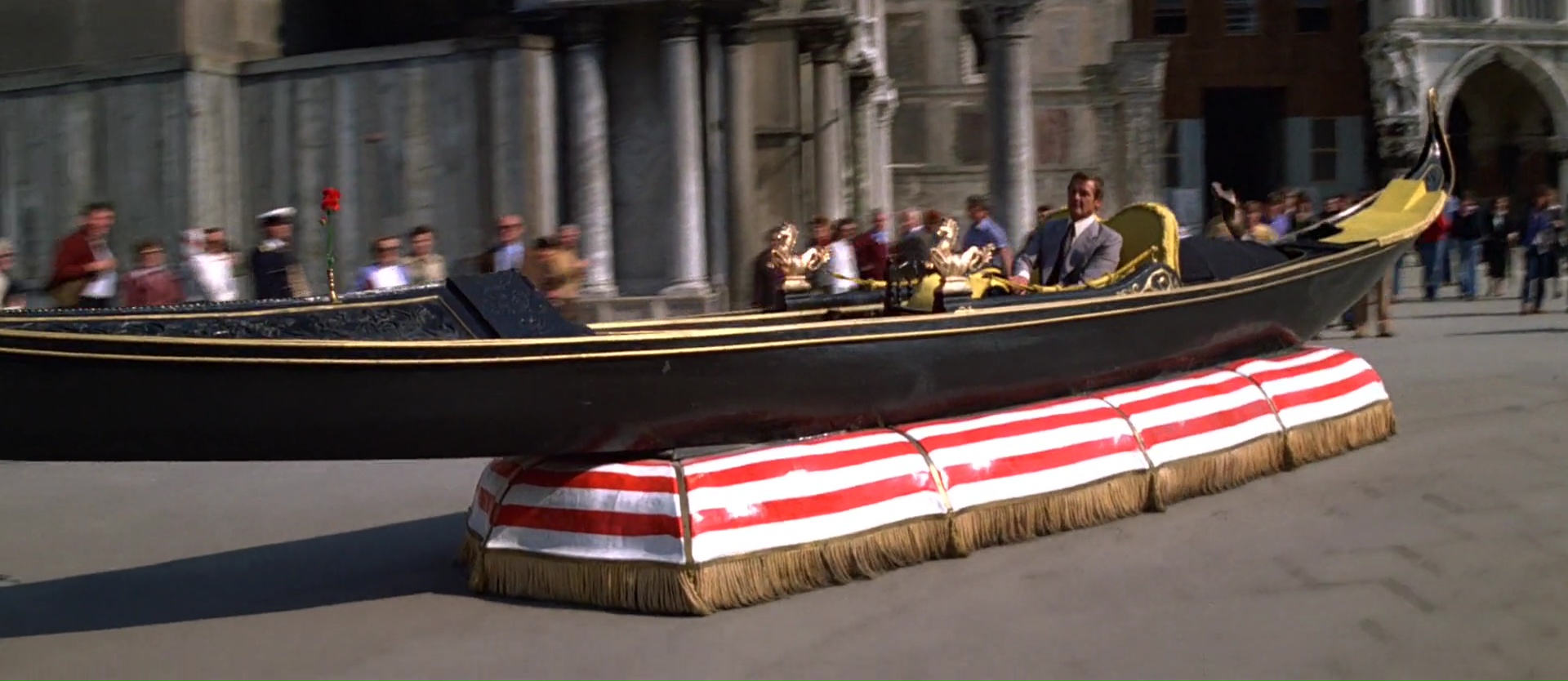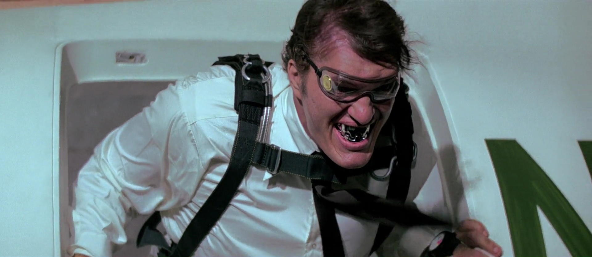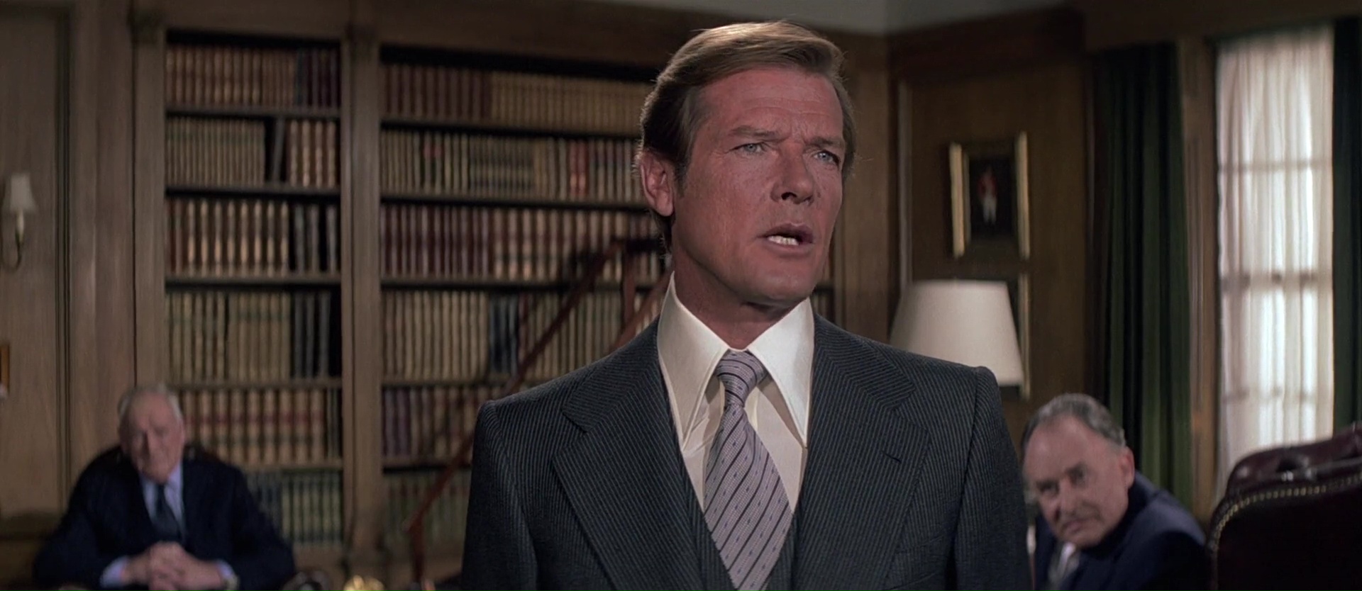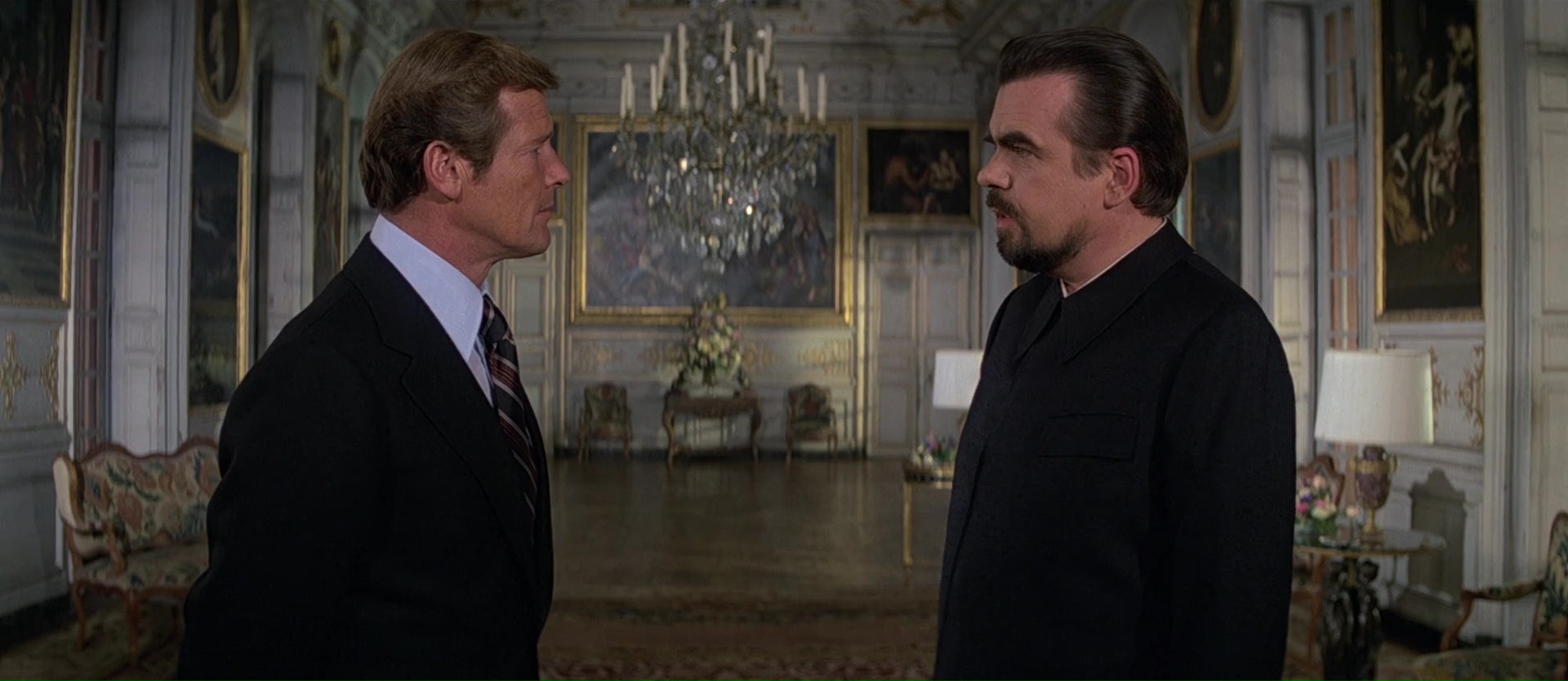 Si je n’avais par exemple pas aimé Dr No ou Opération Tonnerre chez Sean Connery, c’était avant tout à cause du rythme, je m’y ennuyais beaucoup. Chez Roger Moore, je ne m’ennuie pas, mais les films ne sont pas fameux pour autant. Moonraker donc commence bien. La scène d’ouverture avec cette chute libre d’un avion, Bond encore poursuivi par Jaws rescapé du précédent film, ça fonctionne super. Puis on nous offre le générique d’ouverture très sympathique (dernière chanson chantée par Shirley Bassey après Golfinger et Les Diamants sont Éternels), puis le début d’une intrigue encore relativement sérieuse. De beaux décors, des plans d’hélicoptères gracieux, la dernière apparition de Bernard Lee dans le rôle de M avant son décès durant la préproduction du film suivant, le dernier score musical signé John Barry, et puis Moonraker, si ça fonctionne bien au début en nous en mettant pleins les yeux, il faut savoir aussi que le budget aide. Là où le précédent avait un confortable budget de 13,5 millions, soit le plus haut pour l’époque, et bien en l’espace de seulement deux ans, Moonraker se retrouve avec un budget de 34 millions. Oui, tout de même. On nous présente Drax, un méchant très méchant (comme toujours…), et James Bond après la France continue son enquête en Italie. Et c’est là que le film franchit un cap avec le gadget de trop qui vient alors faire sombrer le film. Un peu comme si le film allait d’ailleurs sombrer un peu plus à chaque changement de lieu.