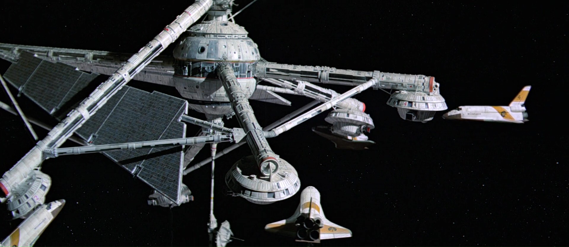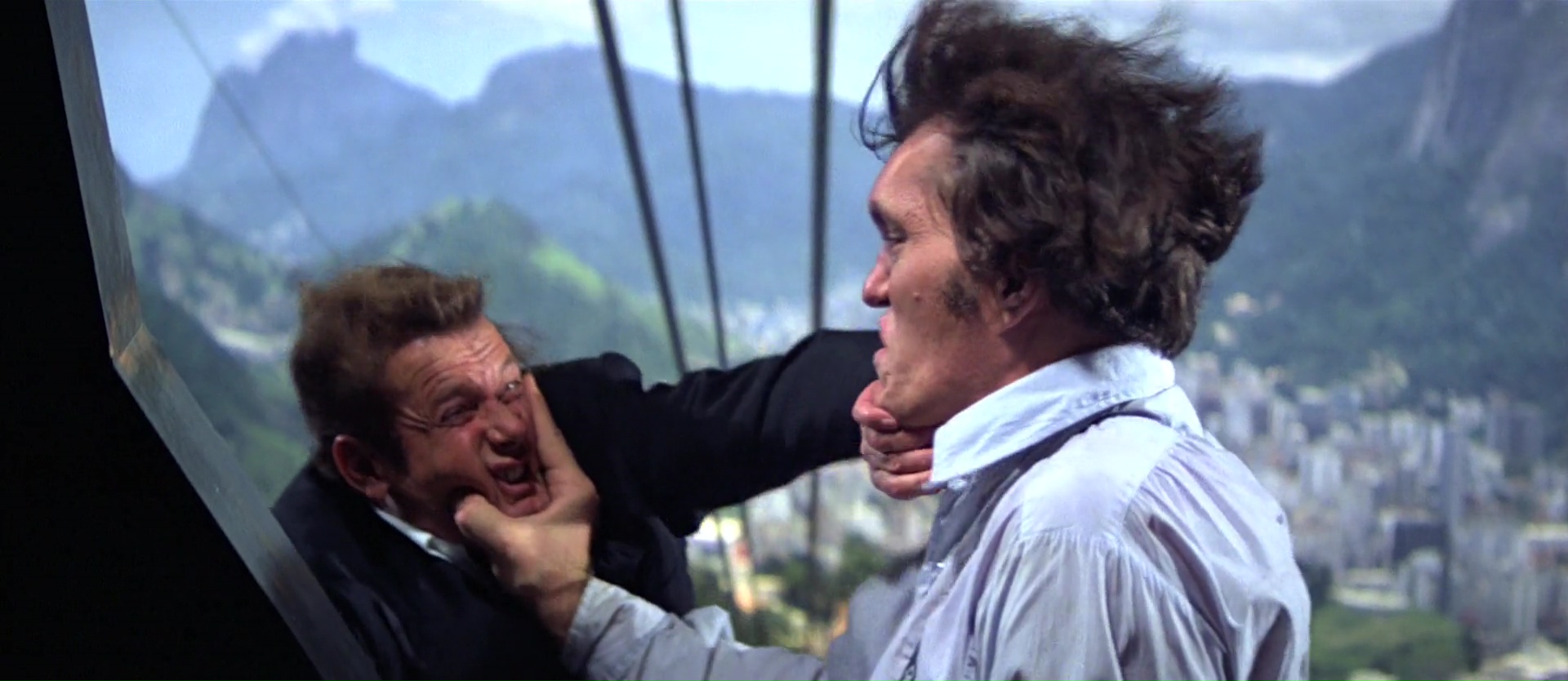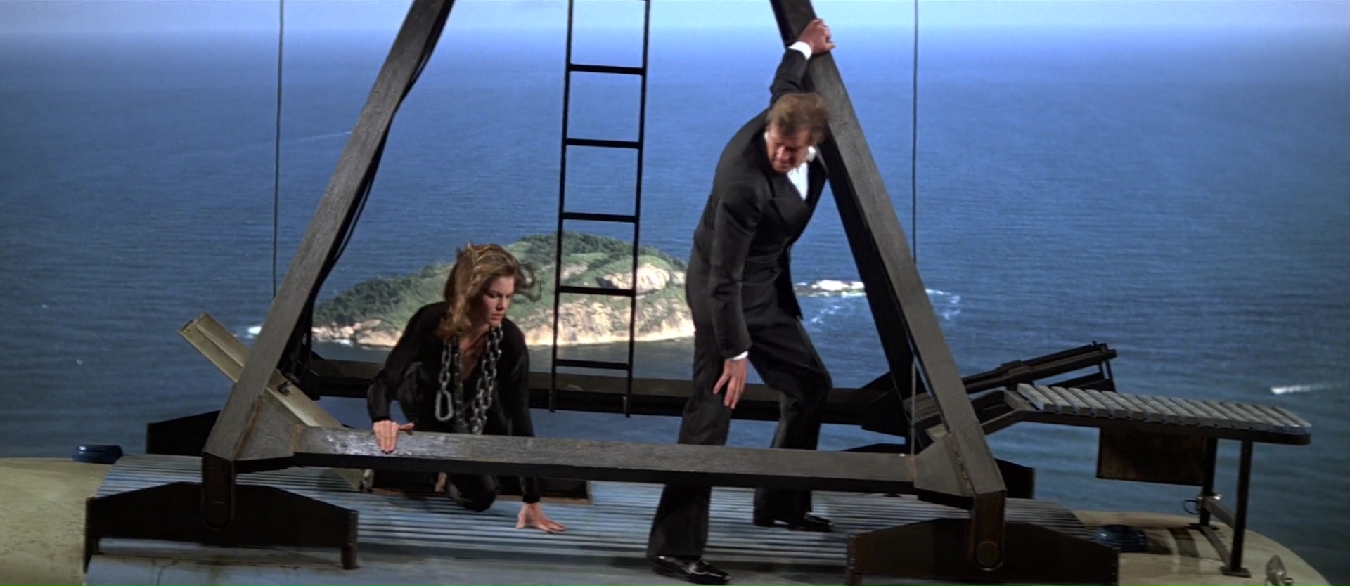 Triste mais vrai. Toujours est-il que le tout est rythmé, et que l’amateur de nanar trouvera beaucoup de choses pour rire. Car oui, James Bond, pour semer ses poursuivants lors d’une course poursuite à Venise, ne trouve rien de mieux que d’utiliser un super gadget transformant son innocente gondole en… aéroglisseur. Et là, malgré la mort stupide du méchant de Vivre et Laisser Mourir qui m’aura fait rire, ce sera la première fois que je me serais fais un joli facepalm sur toute la saga James Bond, et que le film fut perdu. Heureusement encore une fois pour l’amateur de nanar, le film change de lieu encore une fois, et peut donc sombrer un peu plus, nous voilà donc à Rio maintenant. Un passage un peu inutile au final, si ce n’est pour remettre la James Bond Girl sur le devant de la scène, et de nous offrir une nouvelle scène d’action, bonne sur le papier, mauvaise à l’écran, à savoir le retour encore de Jaws et son combat contre Bond sur le toit d’un téléphérique. Ça pourrait être fun, épique, sauf que avouons le, les fonds verts sont voyants, les coups peu impressionnants, l’humour ne fonctionne pas, et la scène se termine par un moment kitch improbable. Jaws, ce tueur intrépide… après un regard avec une blonde à couette, lui prend la main et se barre avec, le tout sur une musique romantique. Jaws est amoureux, ça y est, on a perdu Moonraker ! Sauf que attendez, il faut encore changer de lieu pour sombrer plus bas, et surtout faire plaisir aux fans de Star Wars, nous voilà donc pour la dernière demi-heure dans l’espace.