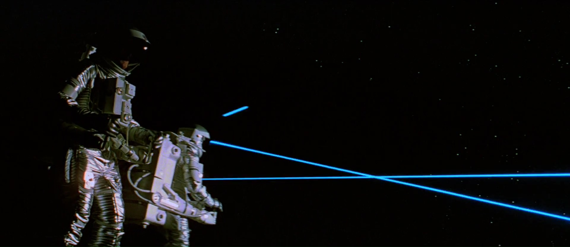 Que dire que dire ? Faut-il vraiment dire quelque chose sur cette dernière demi-heure kitch et ratée ? Bon, et bien il y a de l’apesanteur, des effets kitchs, parfois des batailles dans l’espace molles avec des lasers qui font piou piou de partout, Jaws qui est toujours amoureux et qui du coup devient gentil et court au ralenti devant sa petite blondinette, des blagues de James Bond qui arrivé à ce stade dans le nanar m’auront fait rire (notamment lors de la mort de Drax), des explosions de partout… Alors si en plus, plus personne ne se prend au sérieux et que même Q se met à faire des petites blagues, et ferme même le film avec une blague de son cru, montrant clairement que Moonraker ne se prend pas un seul moment au sérieux. En fait, on s’aperçoit surtout, en plus d’être une période de James Bond pleine d’humour, que cette partie de la saga ne sait pas où aller, profitant toujours des modes actuelles. La Blacksploitation pour Vivre et Laisser Mourir, les films de kung-fu pour L’Homme au Pistolet d’Or, et maintenant donc les films dans l’espace. Amusant, mais bien mauvais.