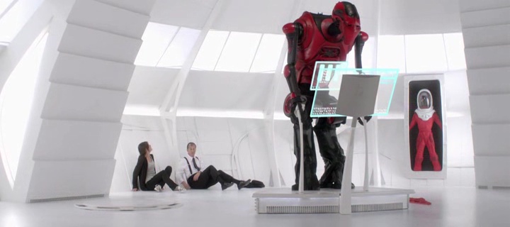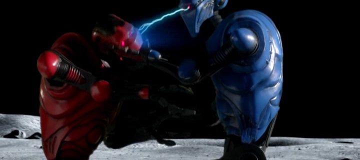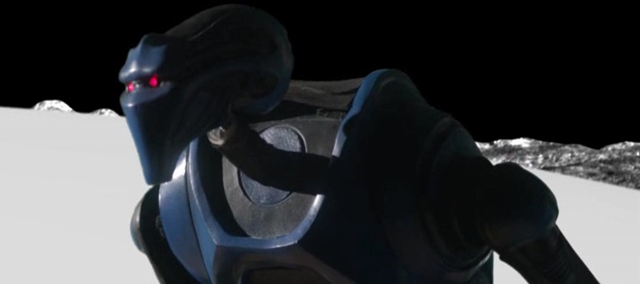Et puis la suite, et bien, non, c’est tout. Moontrap Target Earth accumule les erreurs, et dés la scène d’ouverture, on comprend qu’il faudra mieux se tourner vers le métrage original. Les scènes s’enchaînent de manière parfois étranges, les personnages ont des réactions tout aussi étranges, l’ensemble prend son temps pour pas grand-chose, et mon dieu les effets spéciaux ! C’est du niveau d’un téléfilm Syfy, c’est vous dire. Et donc du niveau d’une cinématique PS2. Alors forcément, quand le film a pour ambition de nous offrir des robots géants, un voyage vers la lune, l’espace et tout, et bien ça pique souvent. Enfin, des robots… nous en aurons deux, et vous pouvez attendre 50 minutes avant de voir le premier débarquer à l’écran. La lune ? Des CGI ridicules la plupart du temps. Même lorsque le métrage n’entre pas encore dans le vif du sujet, donc pendant plus de la moitié, tout sonne faux, les décors sont grands mais vides, les acteurs peu nombreux. La crédibilité en prend un coup quand on pense à une découverte qui pourrait changer l’humanité, avec seulement deux personnes bossant dessus, ou quand on pense au gouvernement et aux complots, et que l’on ne verra que six personnes au loin et un interlocuteur en gros plan.