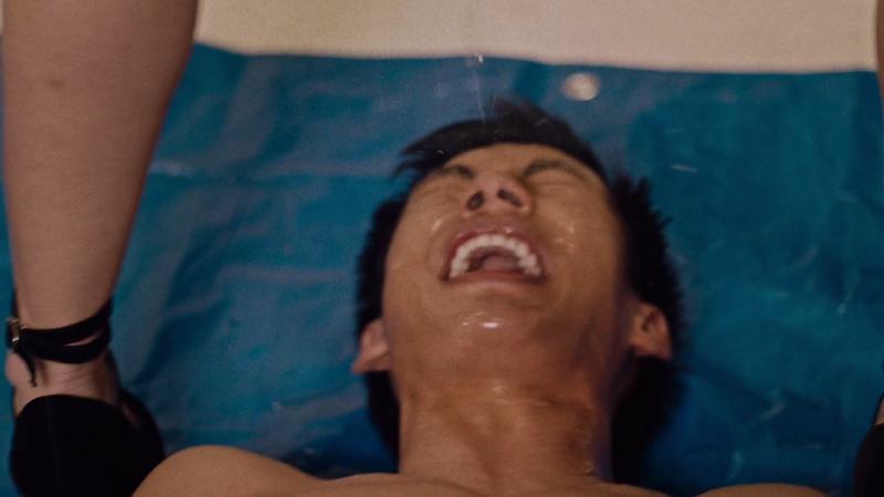 Pour commencer, qu’est ce qu’un mope ? Dans le monde du porno, un mope est considéré comme de la merde, un moins que rien qui n’a pas percé ne serait-ce que dans l’amateur, relayé à des « rôles » dans ce que l’industrie peut produire de pire, du fétichisme bizarre à la scatologie en passant par l’uro et le bukkake. A l’image d’un acteur porno (tout du moins aux Etats Unis, et à de rares exceptions près) qui aura la lettre X gravée sur son front à vie, l’empêchant toute reconversion, on peut considérer que le mope aura le même destin mais lui n’évoluera même pas à un niveau supérieur de l’industrie du X. Ce qui n’était pas de l’avis de Stephen Clancy Hill, qui s’est lancé dans l’industrie sous le nom de Steve Driver après avoir consommé plus que de raison du porno pendant une assignation de 3 ans à résidence après avoir menacé un prof de fac avec une arme de poing pour une histoire de note. Psychologiquement instable, il trouve la mort en 2010 après s’être fait viré de la société Ultima DVD inc., suite à quoi il a blessé deux employés et assassiné son collègue et ami Herbert Hin Wong, AKA Tom Dong, avec un Katana. Mope retrace le parcours du duo, surnommé « les Chris Tucker et Jackie Chan du porno », de leur rencontre en plein bukkake à l’événement tragique dont est tiré le métrage. Dès la première scène, Lucas Heyne, dont c’est le premier film, fait une sorte de mise au point : bien que Mope se déroule dans le monde du porno underground, hors de question d’y porter le moindre jugement. Pour cela, il désamorce le coté trash et sale en y injectant un peu de second degré, ainsi la trentaine de mecs attendent le bukkake comme des soldats attendant d’être parachutés sur le champ de bataille, et quand le voyant passe au vert, c’est sous fond d’une reprise de la Chevauché des Walkyries (renommée pour l’occasion la Chevauchée du bukkake) qu’ils entourent la jeune femme prête à se faire asperger. Tous les autres moments contenant les gang bangs, scènes scatophiles, reniflages d’aisselle et autres lattages de couilles fonctionne sur le même principe, Heynes ne fait pas dans le contemplatif, ne va pas dans des détails explicites et ne cherche pas à choquer ou dégouter le spectateur, tout en ne lui épargnant pas les diverses pratiques sexuelles et fétichismes nombreux. .