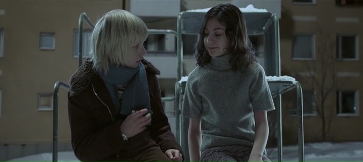 Ah Morse ! Let the Right One In. Voilà bien un film fantastique que j’adore. Variation sur le thème du vampire, mais avec des enfants dans le rôle principal, un ton froid, un rythme lent et un sérieux à toute épreuve, Morse est un film qui ne laisse pas indifférent. Si bien d’ailleurs qu’il a eu droit à son bien mauvais et inutile remake en 2010. Morse avant toute chose était un roman parût en 2004 en Suède, écrit par John Ajvide Lindqvist. Grand succès, de nombreux producteurs tentèrent d’en acquérir les droits afin de livrer une adaptation cinématographique. C’est finalement dans un premier temps Tomas Alfredson qui récupère les droits, et avec l’aide de l’auteur qui signe le scénario, modifie quelques éléments de l’intrigue. Film fantastique ou pas, vampires ou pas, Morse est quoi qu’il arrive avant tout une magnifique histoire d’amour entre deux jeunes enfants de 12 ans. Oskar vit avec sa mère dans la banlieue de Stockholm, il est martyrisé par ses camarades de classe, il est timide, et le soir lorsqu’il est enfin seul dans sa chambre, il s’imagine en train de se venger au couteau. Oskar est en marge de la société déjà malgré son jeune âge, il ne rentre pas dans le rang. On se moque de lui, il ne parle pas beaucoup, il n’a pas d’amis, il pense déjà à la vengeance et il tient un petit cahier chez lui avec des coupures de presses parlant des meurtres ayant lieu dans la région. Un personnage à part, qui ne va pas tarder à rencontrer un autre personnage à part, Eli, qui vient d’emménager dans l’appartement à côté de chez lui.