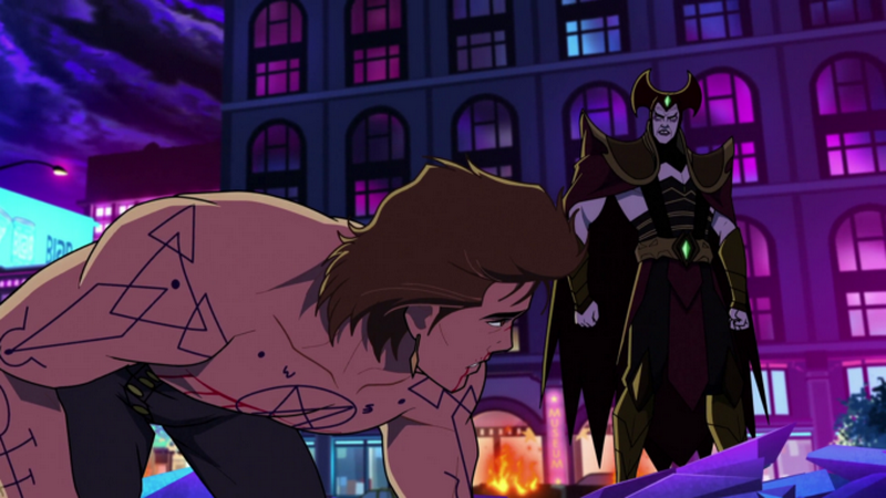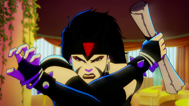 Mortal Kombat Legends: Cage Match se concentre avant tout sur son personnage principal avec la grande gueule et le melon surdimensionné qui le caractérise. Le film laisse ainsi plus de place à l’humour qui fait parfois sourire, parfois pas avec cette voix off, balançant des vannes sur des vannes, qui devient vite envahissante. Le métrage tourne aussi gentiment Hollywood en dérision, mais là encore rien exceptionnel si ce n’est comme le reste quelques punchlines sympas mais pas inoubliables. Le scénario n’en oublie jamais son protagoniste en lui apportant une personnalité bien développée, ainsi qu’à Ashrah qui est un démon à forme humaine qui cherche la rédemption. Chose possible grâce au nombre limité de personnages qui interviennent dans l’histoire et en évitant d’y faire intervenir d’autres figures connues du jeu. En dehors de Raiden présent le temps de deux lignes de dialogues, Mortal Kombat Legends: Cage Match puise des personnages plus que secondaires tels que Kia, Jataaka et Sareena, qui ont fait leur première apparition dans le spin off tout pourri Mortal Kombat Mythologies: Sub-Zero. Ça parait étrange mais c’est cohérent avec le choix de faire de Shinnok l’antagoniste de ce quatrième volet et c’est finalement appréciable que le film ne se sente pas obligé de mettre en scène d’autres personnages iconiques de la saga Mortal Kombat.