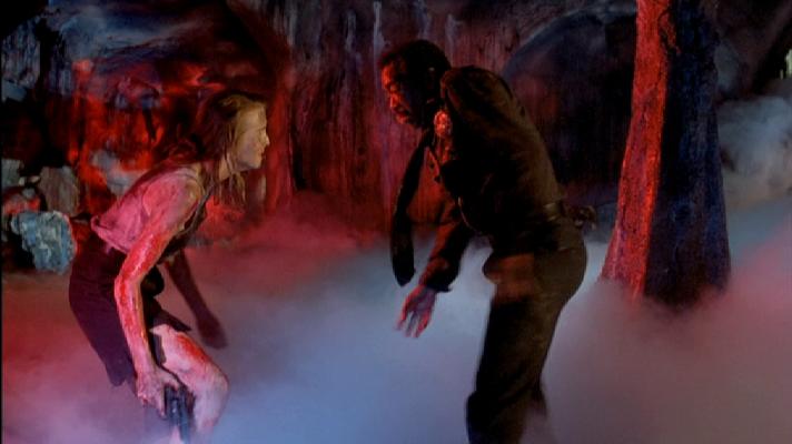 Arrive enfin le dernier segment, signé Yuzna lui même. Ayant déjà fait la même année Le Retour des Morts-Vivants 3, qui rattrapais son mauvais Re-Animator 2, il semble motivé à continuer sur la même route, et y mettra toute la bonne volonté du monde, prouvant qu’il est un honnête artisan du genre, qui se fait plaisir, et à nous aussi par la même occasion. Son segment met en scène une femme flic, enceinte et désirant avorter, à la poursuite d’un malfrat dans les rues de la ville avec son collègue (et petit ami). Après avoir eu un accident, son collègue disparaît, emmené par un mystérieux individu dans un immeuble délabré. Sarah va partir à la recherche de son collègue et tomber sur deux mystérieux individus qui vont la mener dans les ruines d’un peuple étrange. Pour le dernier segment, aucun doute, Yuzna a mit le paquet et signe, malgré des défauts comme souvent, une œuvre forte et qui marque. Pas d’humour ou si peu, des effets gore à foison, un ton sombre et désespéré, limite malsain, il signe non seulement un sketch que j’apprécie beaucoup, mais également un de ses travaux les plus sanglants. Oui, on pourra critiquer la qualité discutable de certains effets spéciaux (comme le design des créatures dans les plans où elles volent), mais les images sont tellement poignantes, et le déroulement inattendu qu’on en vient à pardonner ces quelques défauts, nous laissant sur une note plus que positive (malgré la finalité de l’intrigue concernant Lovecraft arrivant juste après). Bien qu’inégal, Necronomicon possède assez d’atouts et de moments forts pour faire parti des films à sketchs réussis.