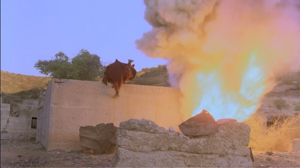 Ces scènes d’action sont une fois encore des plus réussies, avec leur lot de cascades dangereuses et d’explosions toujours plus impressionnantes. Albert Pyun, les charges explosives, c’est sa grande passion, et comme dans le premier opus, ça explose dans tous les sens. Enfin, dans la deuxième moitié surtout, la première posant les bases d’un nouvel univers, une nouvelle ambiance. La sensation est d’ailleurs un peu étrange au début lorsqu’on a vu le premier Nemesis peu de temps avant, le film se passant ici en 1980 et pourtant on a l’impression d’être parfois dans un post-apo limite cyberpunk avec de forts accents de western. L’ambiance n’est donc clairement plus la même. L’histoire se déroulant essentiellement en Afrique, dans de grandes étendues désertiques, on se rapprocherait plus d’un Mad Max 2 pour les décors, toujours de Terminator pour la trame principale, mais aussi d’un Predator tant le cyborg qui traque notre héroïne a de fortes similitudes avec celui du film de John McTiernan (camouflage, différentes visions thermiques,…). Bon, pour être franchement sincère, ce cyborg a plutôt l’air sorti d’un épisode de Bioman, mais heureusement qu’on ne le voit réellement que peu au final puisqu’il passe une bonne partie du film sous son camouflage kaléidoscopique, façon Predator du pauvre donc.