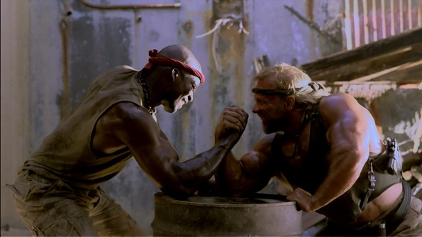 Mais qu’est-ce que c’est que cet engin ! Mais… mais… ses bras, c’est mes cuisses ! Imaginez une sorte d’actrice bodybuildée ayant un peu trop abusée des stéroïdes… sorte de Conan le Barbare féminin élevée aux hormones ! Tellement musclée que parfois elle marche les bras écartés. Et en plus, Pyun insiste souvent bien sur ses muscles atrophiés en abusant de plans bien rapprochés. Un petit coup d’œil rapide sur Google nous apprendra que Sue Price est une ancienne championne de bodybuilding dont la courte carrière dans le cinéma, se limitant à Nemesis 2, 3 et 4 donc, n’aura pas marqué grand monde tant son jeu d’actrice est… limité dirons-nous. Même être évanouie, elle le joue mal, c’est dire ! Mais au final, qu’importe, puisque dans les scènes d’action, elle y met vraiment de sa personne et le résultat s’en ressent à l’écran.