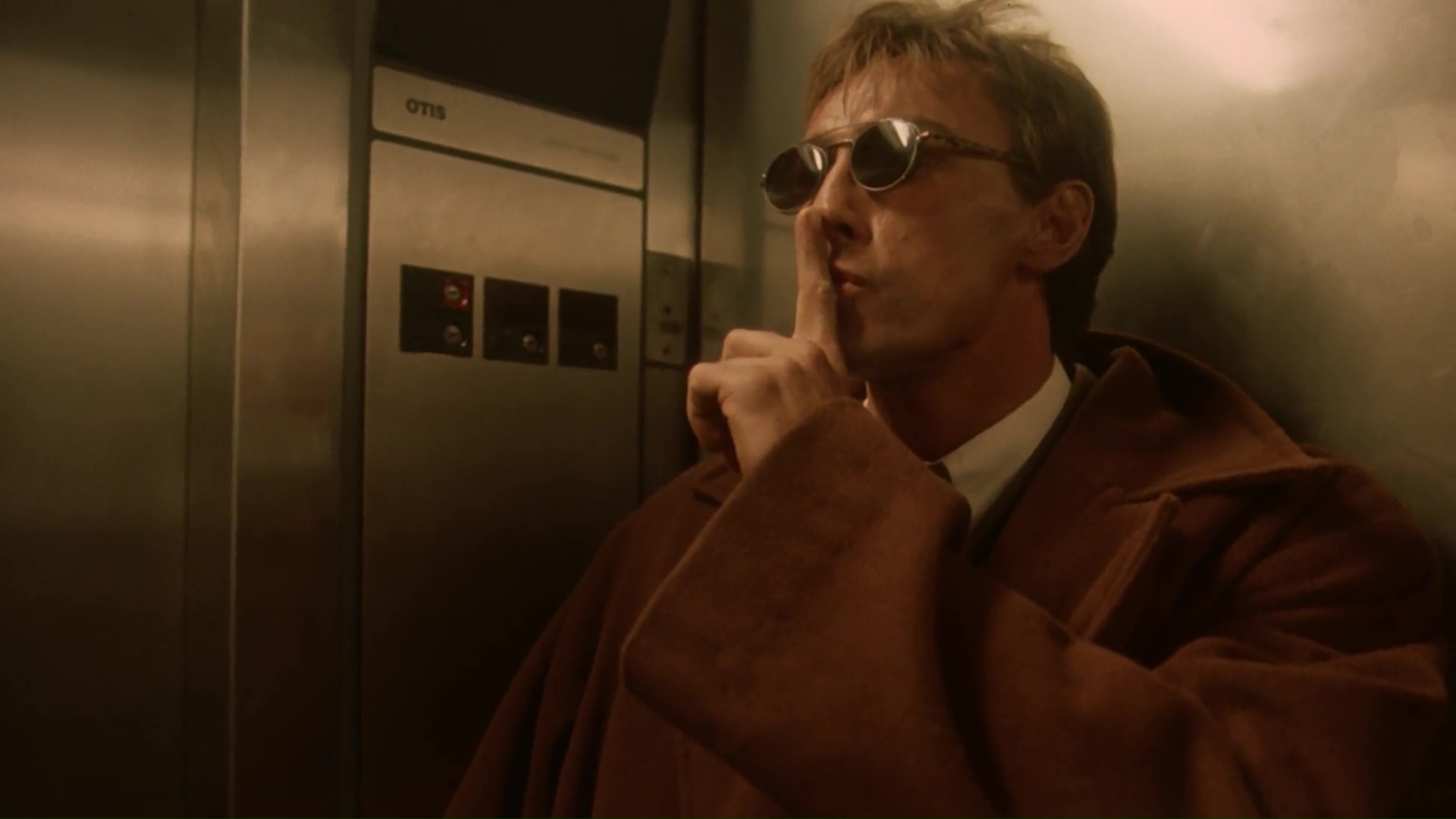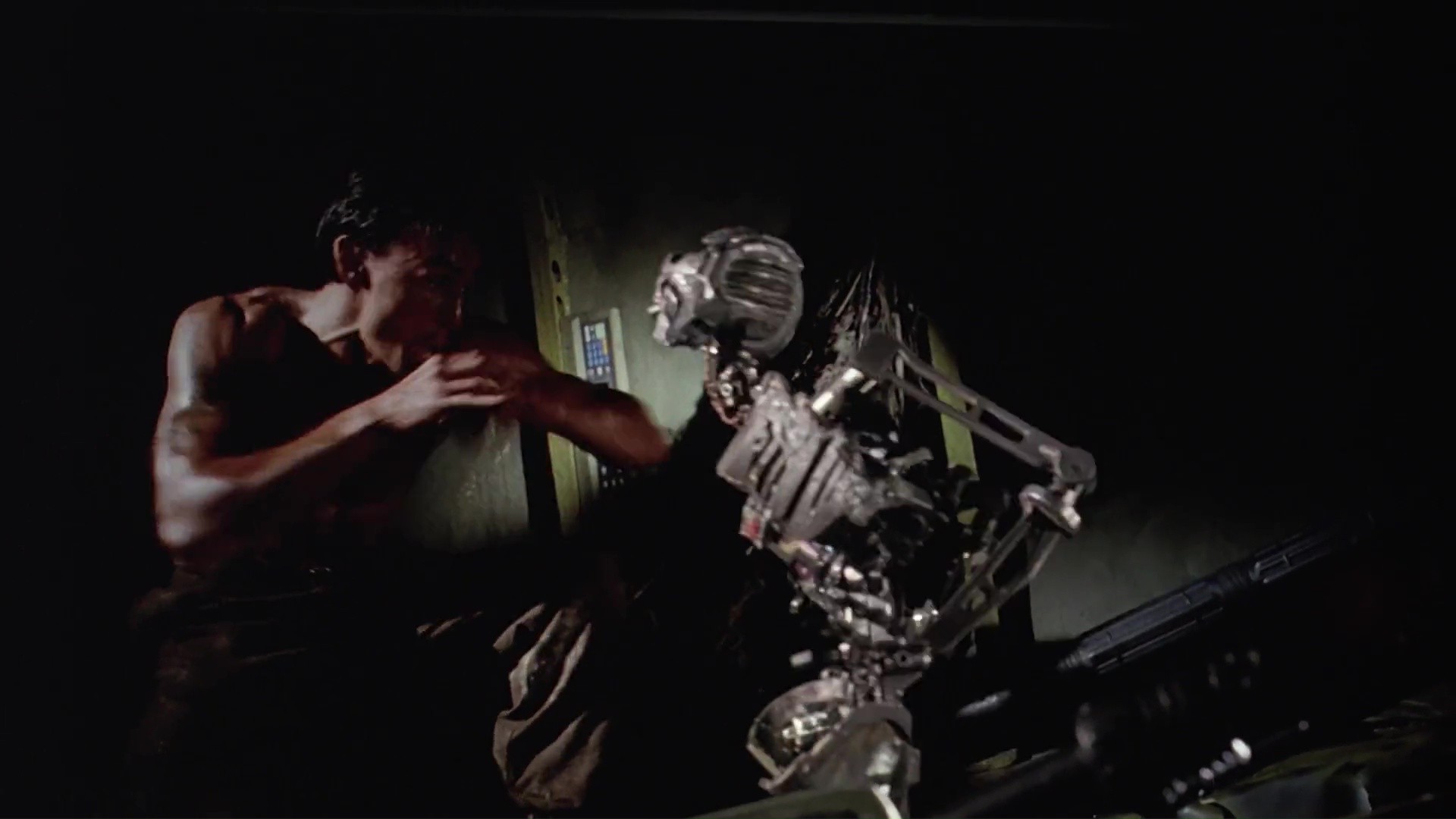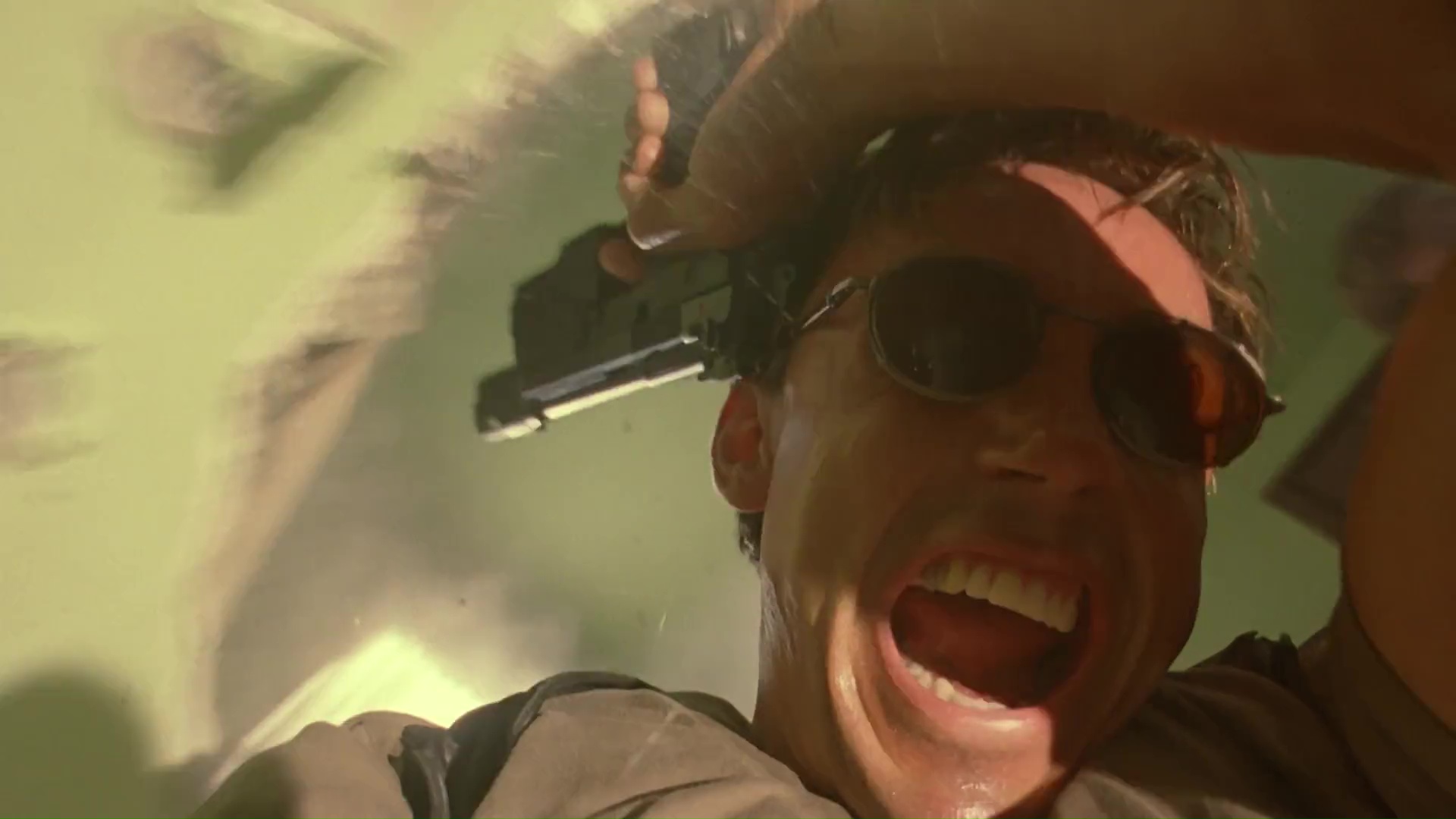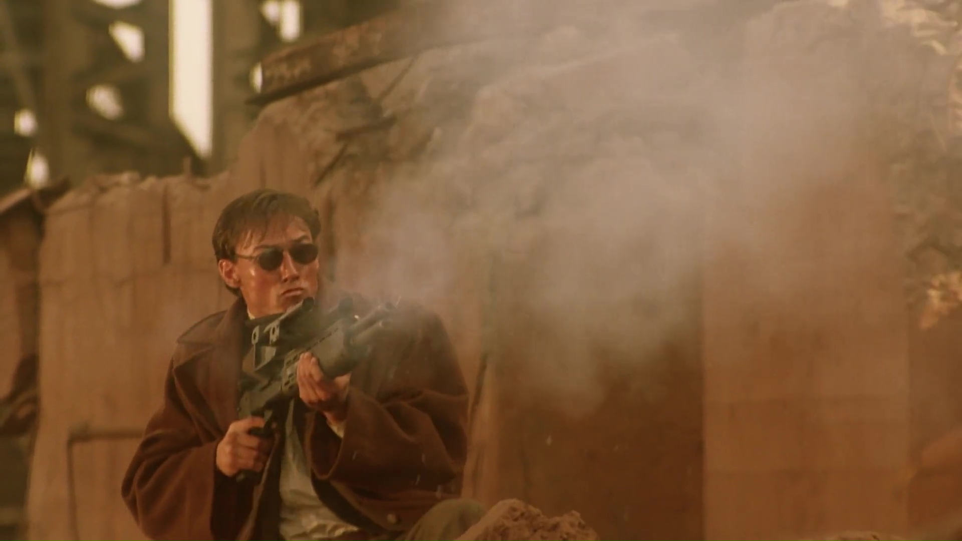 Ces scènes d’action sont d’autant plus intéressantes qu’Albert Pyun ose pas mal de choses et pond sur pellicule des idées très rigolotes. Outre le gunfight en pleine glissade sur une sorte de toboggan géant du plus bel effet, c’est sans doute la scène où Olivier Gruner tombe d’étage en étage afin de s’échapper, arrosant le sol de balles afin de passer à travers, qui restera dans les mémoires. Ca dure environ 10 secondes, et pourtant plusieurs jours après visionnage, c’est LA scène qui arrive directement en tête lorsque je me remémore le film. On sent également l’inspiration du cinéma d’action de Hong Kong. Voir ce même Olivier Gruner, manteau long et lunettes noires, se jeter en arrière dans une pente, glisser sur le dos, tout en vidant le chargeur de ses deux flingues, nous renvoie forcément à Chow Yun-Fat dans Le Syndicat du Crime 2. Il faut dire que le film bouffe un peu à tous les râteliers et ne se cache à aucun moment d’emprunter / rendre hommage à des films tels que Terminator ou Blade Runner.