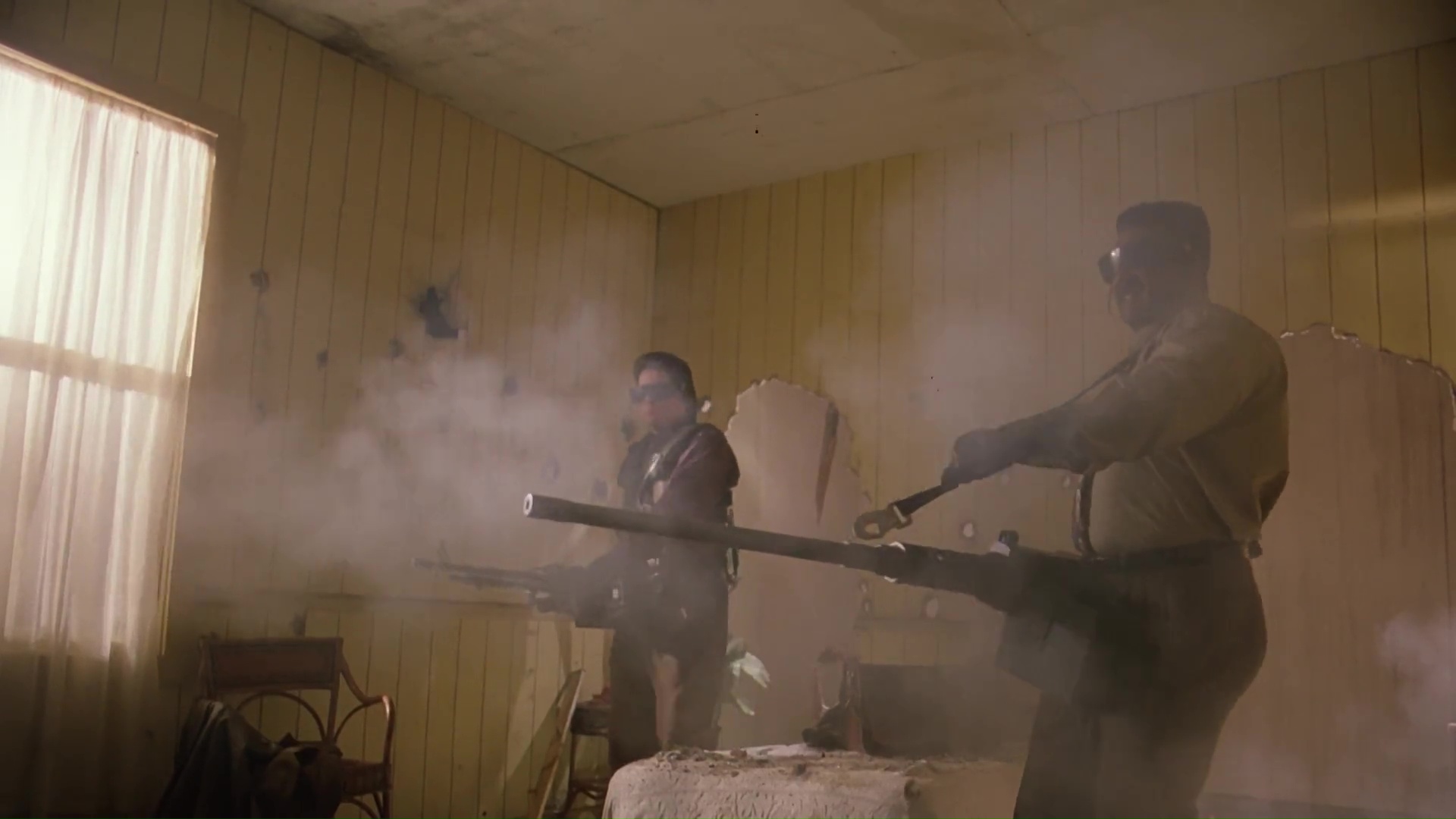 Alors bien entendu, tout n’est pas tout rose dans le merveilleux petit monde de la série B fauchée 90’s, et malgré un sérieux dans la mise en scène et une envie de bien faire, Nemesis se foire sur plusieurs choses et fait même quelques minis incursions dans le nanar. Olivier Gruner passe par tous les styles capillaires, osant même la coupe la plus ridicule possible pour un film : le mulet ! Mais si ce n’était que ça… Les méchants font littéralement exploser des bâtiments entiers avec 3 coups de fusils à pompe ; les personnages féminins sont parfois très indécis ; certaines punchlines frôlent le débile (Olivier Gruner, se balançant au bout d’une liane, vole une puce à de gros méchants en leur lançant un « Merci c’est sympa ! ») ; un montage parfois foireux comme par exemple le grand méchant qui se met à recharger, qui tire dans le plan suivant, et qui continue son rechargement le plan d’après, le tout en l’espace de 2 secondes ; ou encore un doublage français absolument génial, avec des accents appuyés au possible : « Ch’adore fous foir trafailler ».