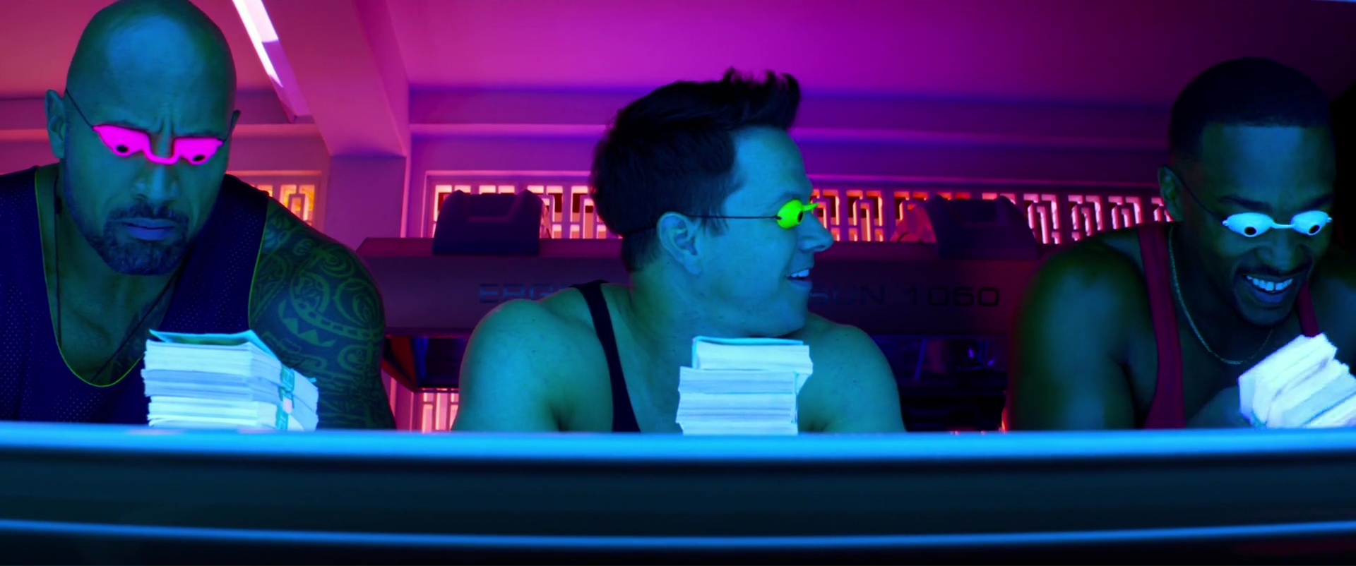 Et oui, No Pain No Gain n’a coûté que 26 millions. Soit le budget le plus bas de la carrière de Bay depuis son premier film, Bad Boys. Ici donc, une histoire vraie, celle de trois bodybuilders pas franchement très intelligents qui décident de se faire un peu d’argent, en kidnappant un riche client de leur club de gym, en lui extorquant tous ses biens et ressources, et en essayant de le tuer. Une histoire totalement folle, où Michael Bay et ses deux scénaristes se servent d’une histoire vraie pour livrer la classique histoire du coup qui tourne mal, mais où les personnages responsables semblent totalement à l’ouest. Daniel Lugo (Mark Wahlberg) se lance dans cette entreprise juste parce qu’il veut une part du rêve Américain. Mais avec des modèles comme Le Parrain ou Scarface, on comprend de suite que ça coince. Paul Doyle (Dwayne Johnson) est le simple d’esprit, ancien détenu, ancien drogué, qui semble au départ le plus sympa de la bande, se refusant à la violence et aux autres magouilles, mais qui en replongeant dans la drogue se retrouvera dans des situations impossibles. Quand à Adrian Doorbal (Anthony MacKie), il apparaît comme celui qui veut juste être bien vu et veut vivre une vie pour laquelle il n’en a clairement pas les moyens (le mariage, la grande maison, le chien). Une équipe de bras cassés qui va kidnapper Victor Kershaw, tenter de tout lui extorquer, en le kidnappant, le tabassant, et en essayant finalement de le tuer. Sauf qu’ils sont bras cassés jusqu’au bout. Le kidnapping en lui-même tourne mal à plusieurs reprises, et on se retrouve à se marrer devant des situations improbables, comme ce kidnapping sur un parking où nos personnages utilisent des déguisements ridicules. Les situations vont loin, avec Paul se liant d’amitié avec sa future victime, Daniel voulant paraitre intelligent mais oubliant les plus petits détails. Et forcément, ça part très rapidement dans tous les sens, les situations les plus folles s’enchaînent les unes après les autres sans nous laisser un temps de répit.