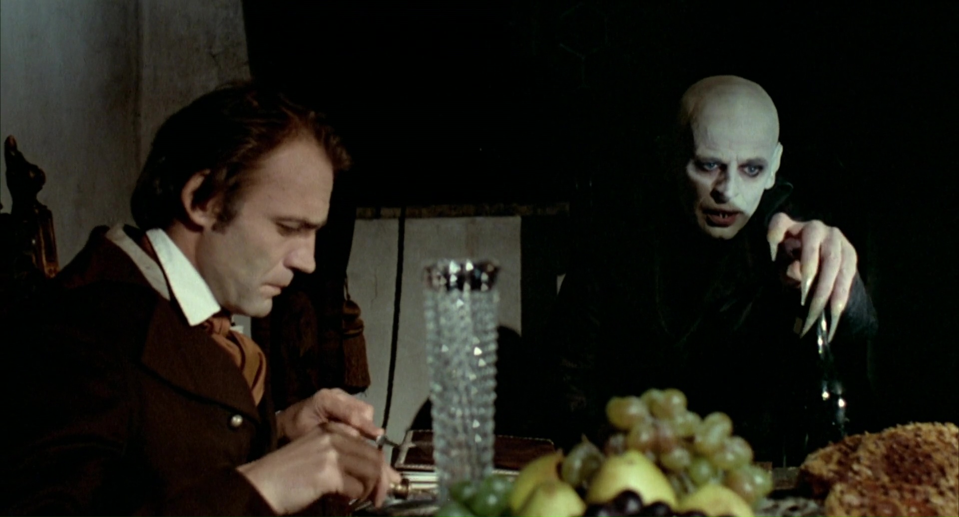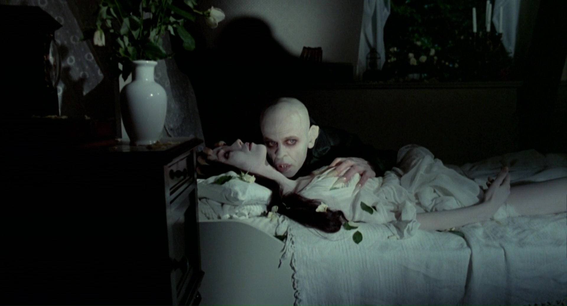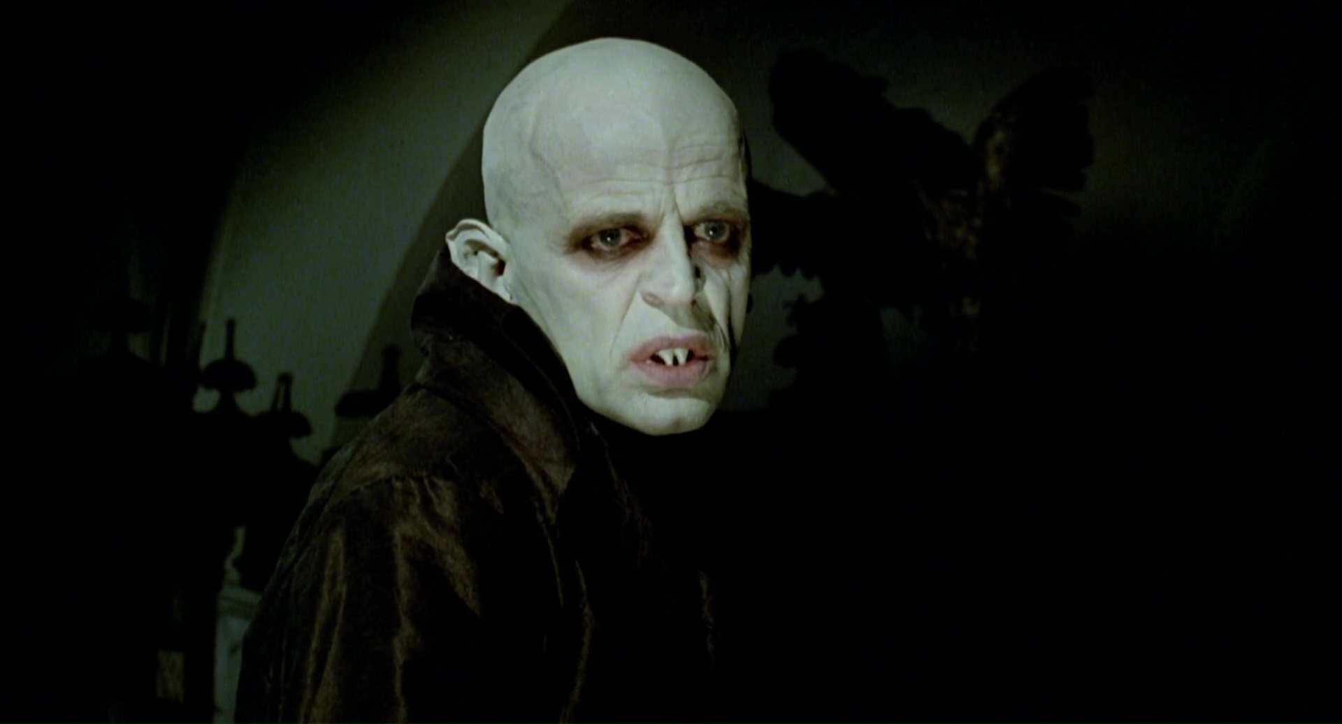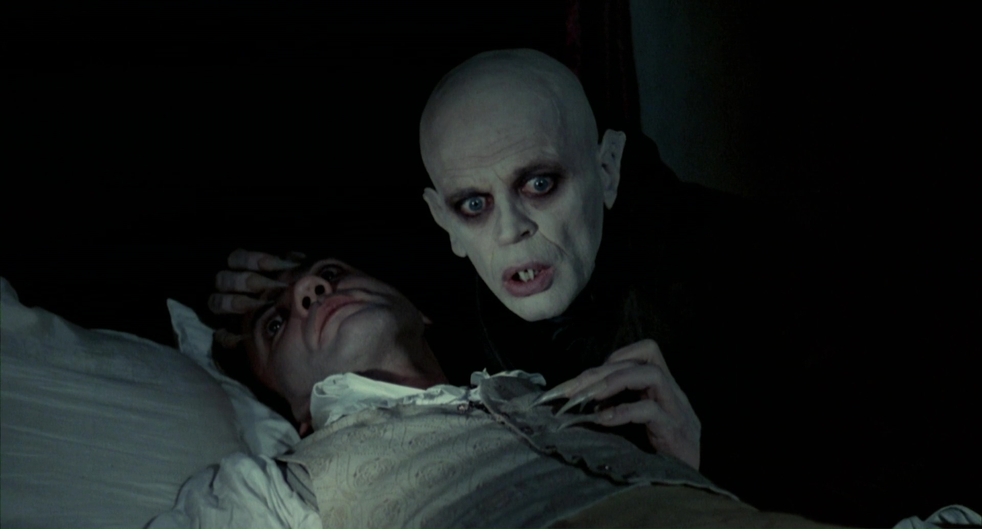 Étrange projet que voilà. Nosferatu, le film de Murnau de 1922, avait quasiment été détruit puisqu’il copiait (et au final, transcendait) le roman de Bram Stoker, Dracula. Reste que le métrage, au-delà de son aspect plagiat qu’il a dés le départ, est un monument de cinéma. Alors que les droits de Dracula sont tombées, permettant à tout le monde de livrer sa version (on aura les versions de la Hammer, la version de John Badham en 1979 et tant d’autres), Werner Herzog, connu pour ses tournages longs et difficiles, se lance dans un remake de Nosferatu, en conservant les noms des personnages du roman de Bram Stoker. Cela permet dans un sens à Herzog de se rapprocher de l’œuvre originale, mais pourtant, il garde beaucoup d’aspects du Nosferatu de Murnau, notamment dans l’aspect du vampire, flippant, sans vie, bien loin des interprétations de Christopher Lee. Il retrouve Klaus Kinski et lui offre le rôle du vampire, ce qui lui « offrira » pas moins de 4 heures de maquillage par jour, rien que ça. Oui, entre Herzog et Kinski, ça se passe souvent mal, et on pourra comparer leur relation à une relation d’amour / haine. Production entre l’Allemagne et la France, distribuée par la 20th Century Fox, ceux-ci lancent une requête à Herzog. Il doit livrer une version anglaise du film. Ainsi, pour les scènes de dialogues, plutôt que de faire appel à un doublage (bien que certains acteurs furent ensuite doublés), chaque plan sera filmé deux fois, en Allemand, puis en Anglais.