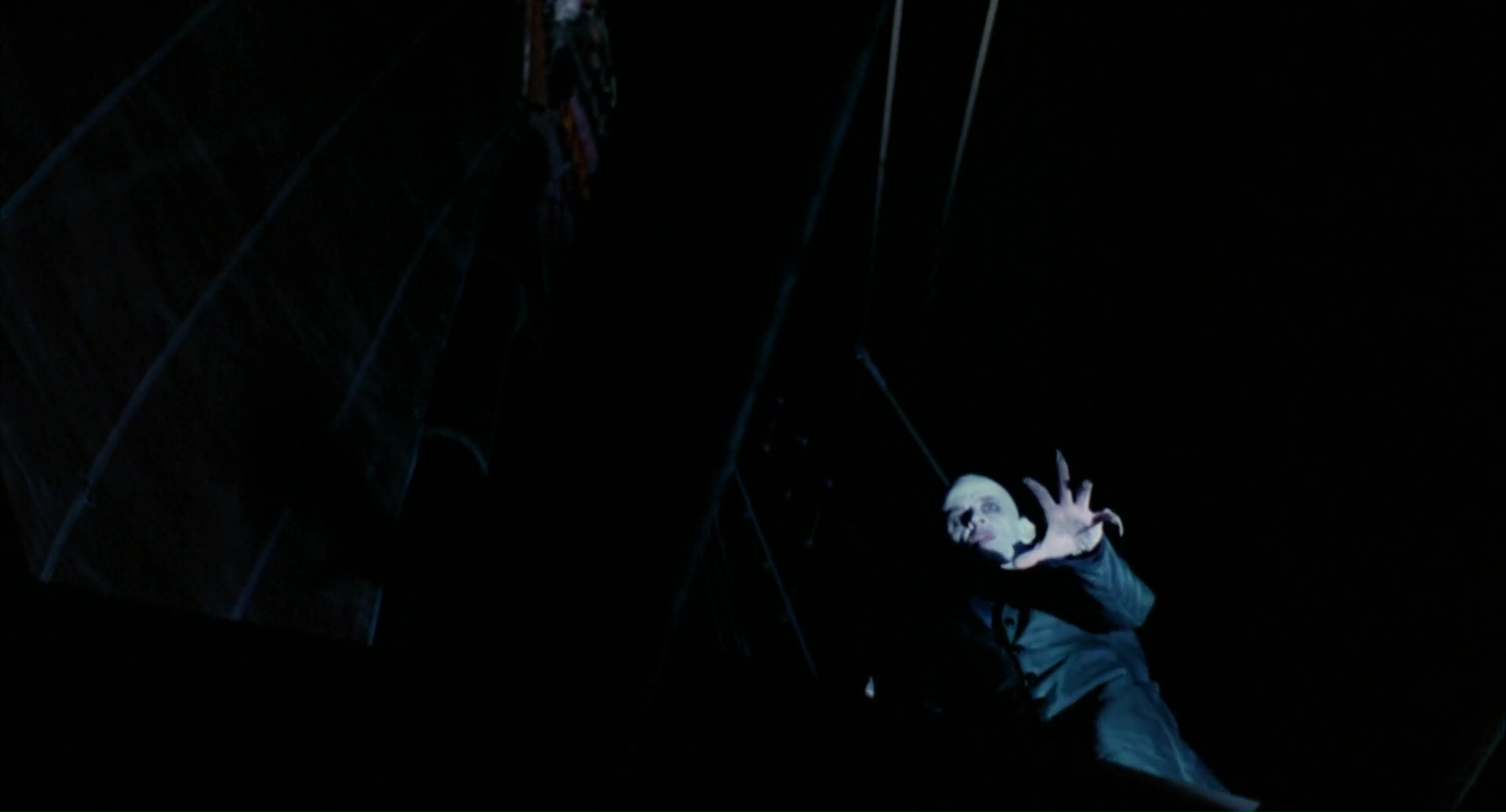 Kinski livre une interprétation plutôt impressionnante du comte d’ailleurs. Il n’est pas séducteur, il n’est pas charmant, il est terrifiant, inhumain, n’a pas d’âme. Bref, il s’agît d’un prédateur nocturne, comme le rappelle ce plan oh combien sublime d’une chauve-souris au ralenti. Car si Nosferatu par Herzog n’arrive pas au même niveau que le métrage original, il n’en demeure pas moins un grand film donc, et surtout, comme souvent avec Herzog, un film avant tout visuel et sensitif. L’attention du spectateur ne se pose pas sur le scénario ou ses enjeux, mais bel et bien sur l’imagerie du film, le scénario n’étant là que pour servir cette imagerie. Pourtant, même en terme de scénario, ce Nosferatu possède des idées qui s’éloignent fortement du mythe traditionnel du vampire si l’on y prête attention. Ainsi, dés le début, les villageois préviennent Harker que le château est en ruines, et Harker décrira même le lieu comme irréel alors qu’il est dans un château comme neuf. Comme si Dracula, son château et finalement son monde ne faisaient pas parti du notre. La mise en scène d’Herzog semble d’ailleurs souvent appuyer ce point de vue, étant à bien des égards totalement surréaliste, que ce soit dans les angles, l’éclairage, ou même l’ambiance générale. Les longs plans atmosphériques sur le bateau, l’arrivée de celui-ci en ville, ce fameux plan de la chauve-souris, Kinski transportant de nuit son cercueil dans les rues. Nosferatu de Herzog regorge d’images fortes, de plans à la puissance visuelle certaine. Il souffre de sa comparaison avec l’œuvre de Murnau, mais demeure plus qu’intéressante.