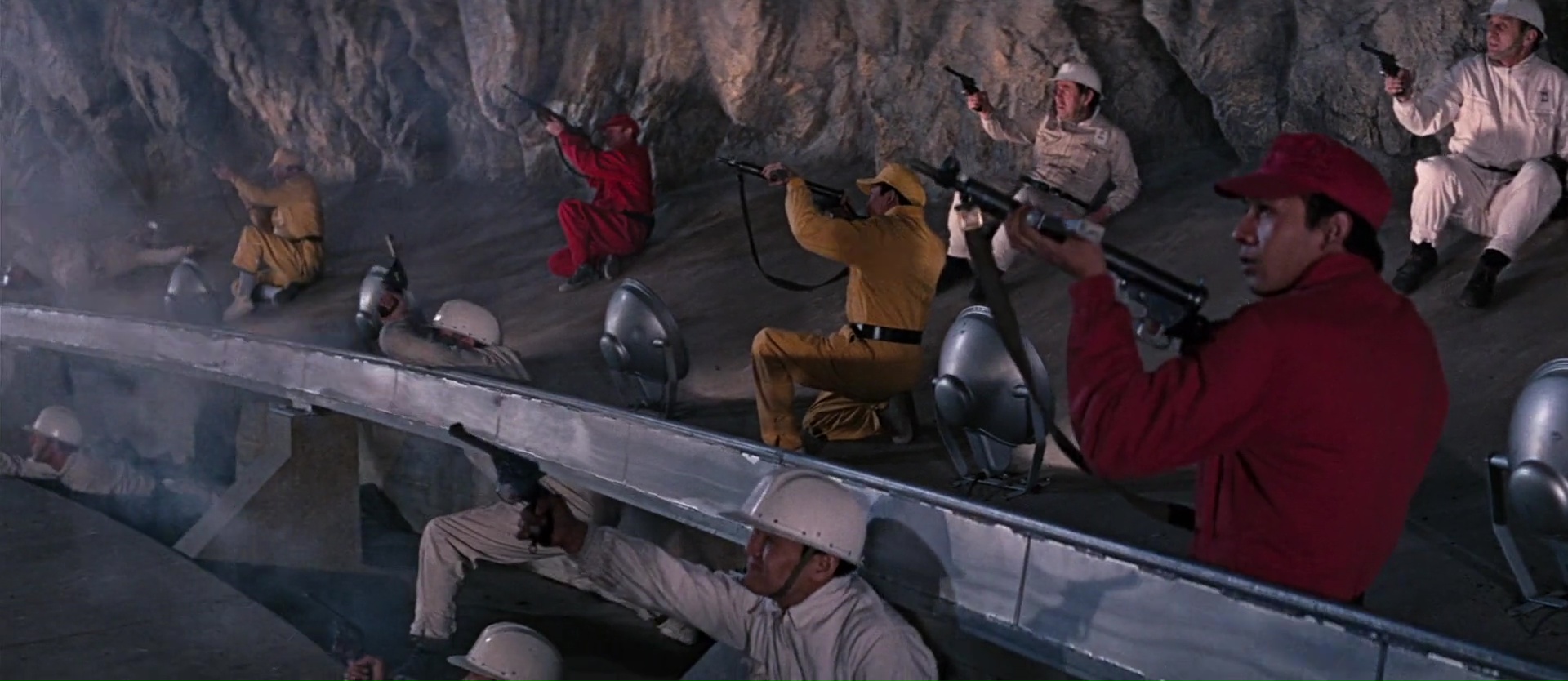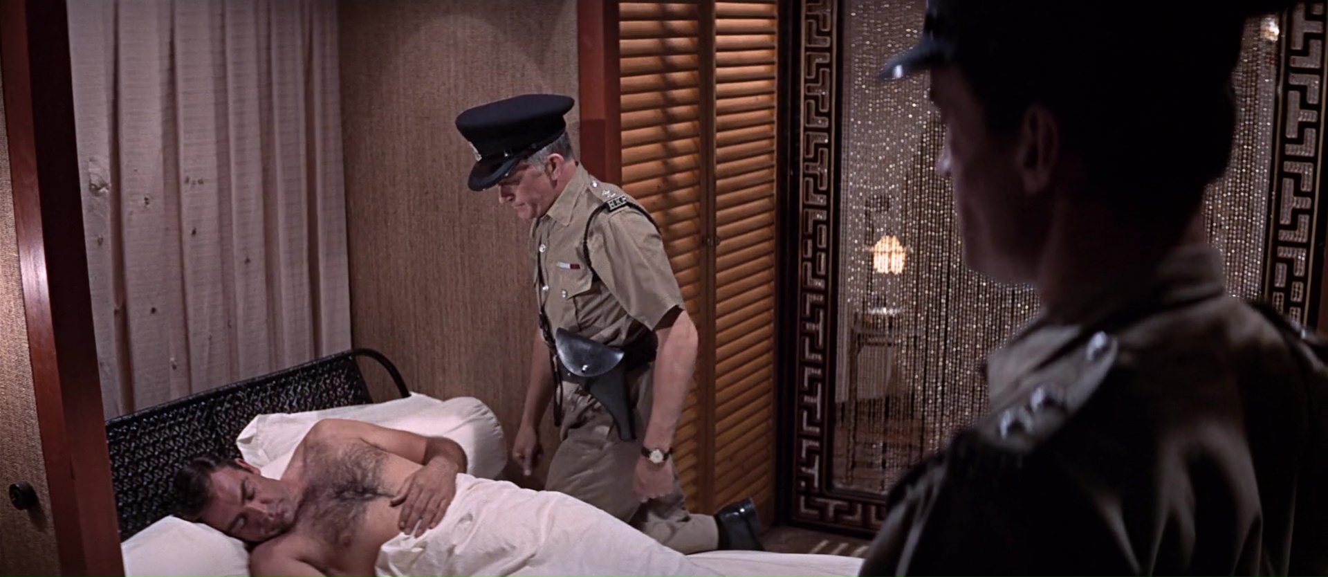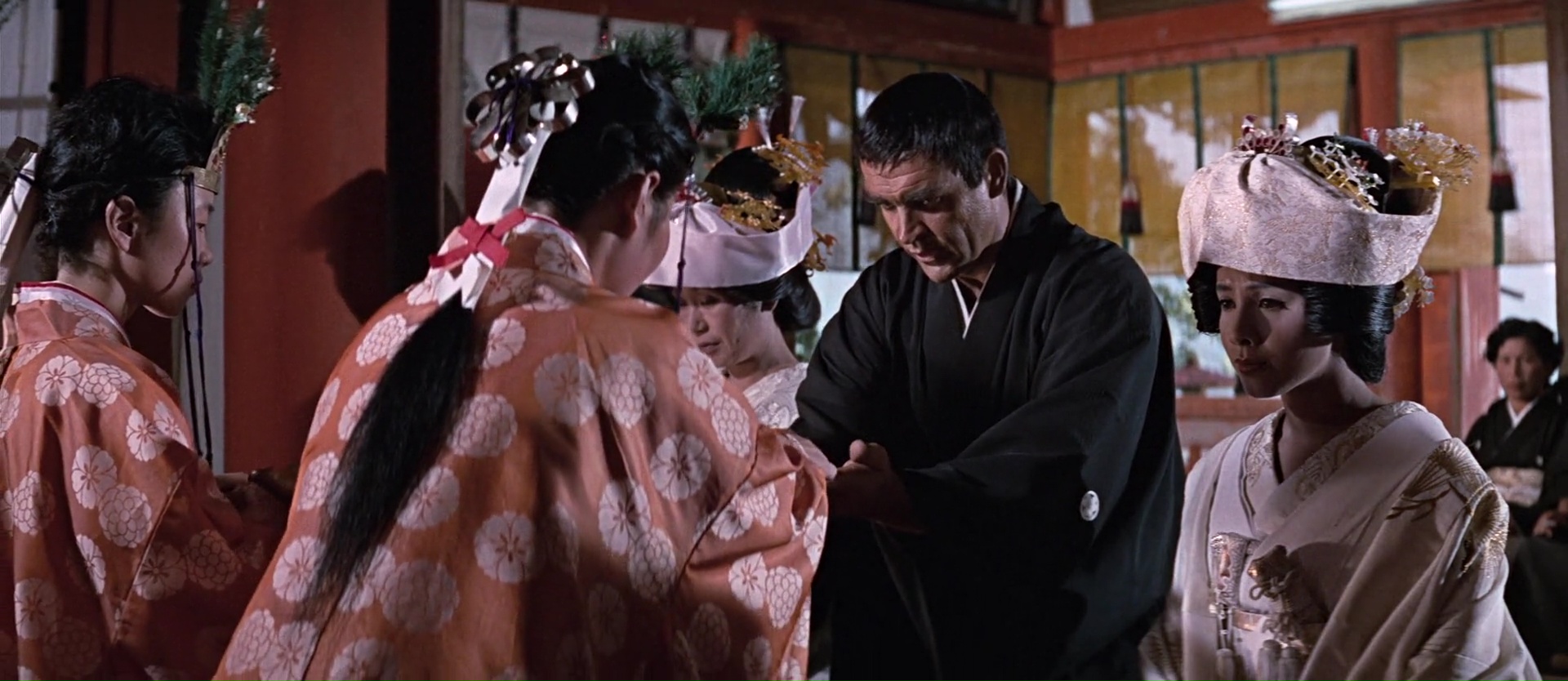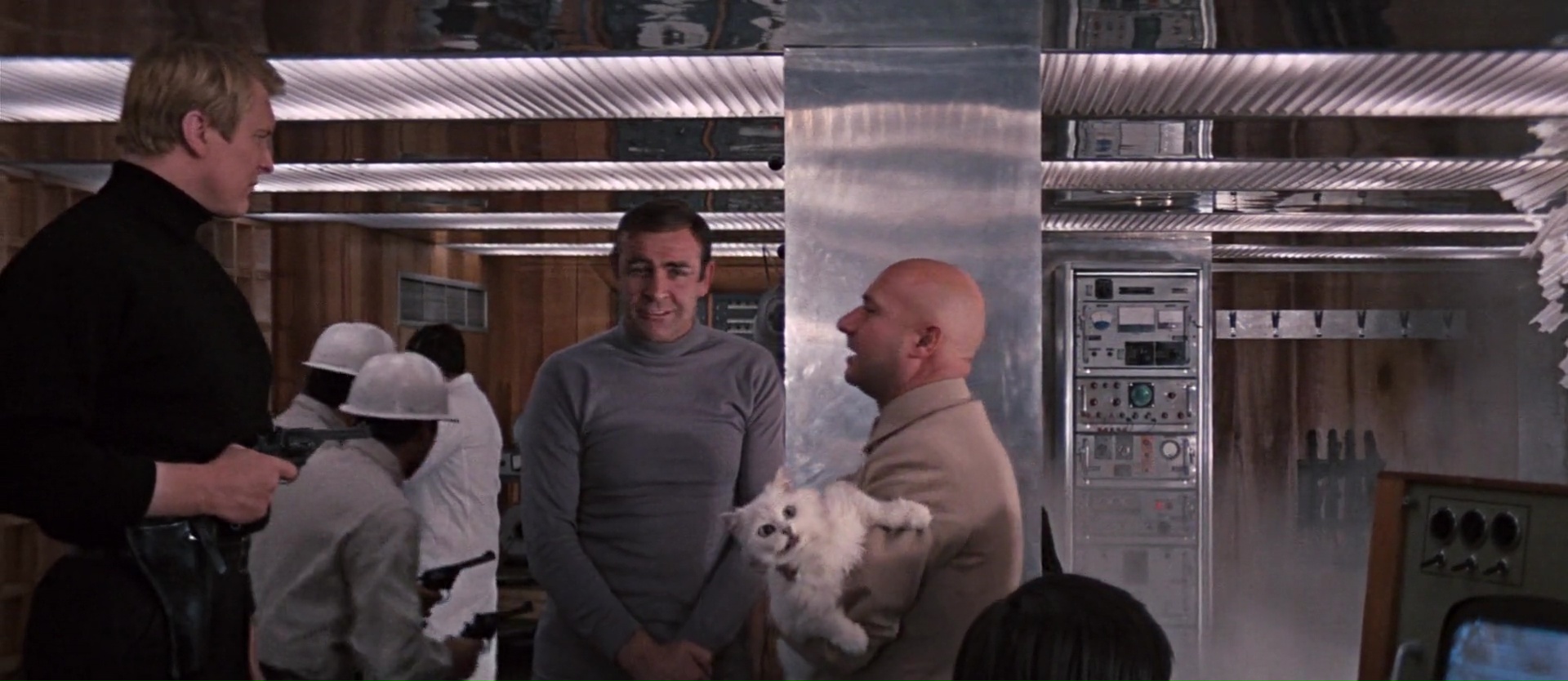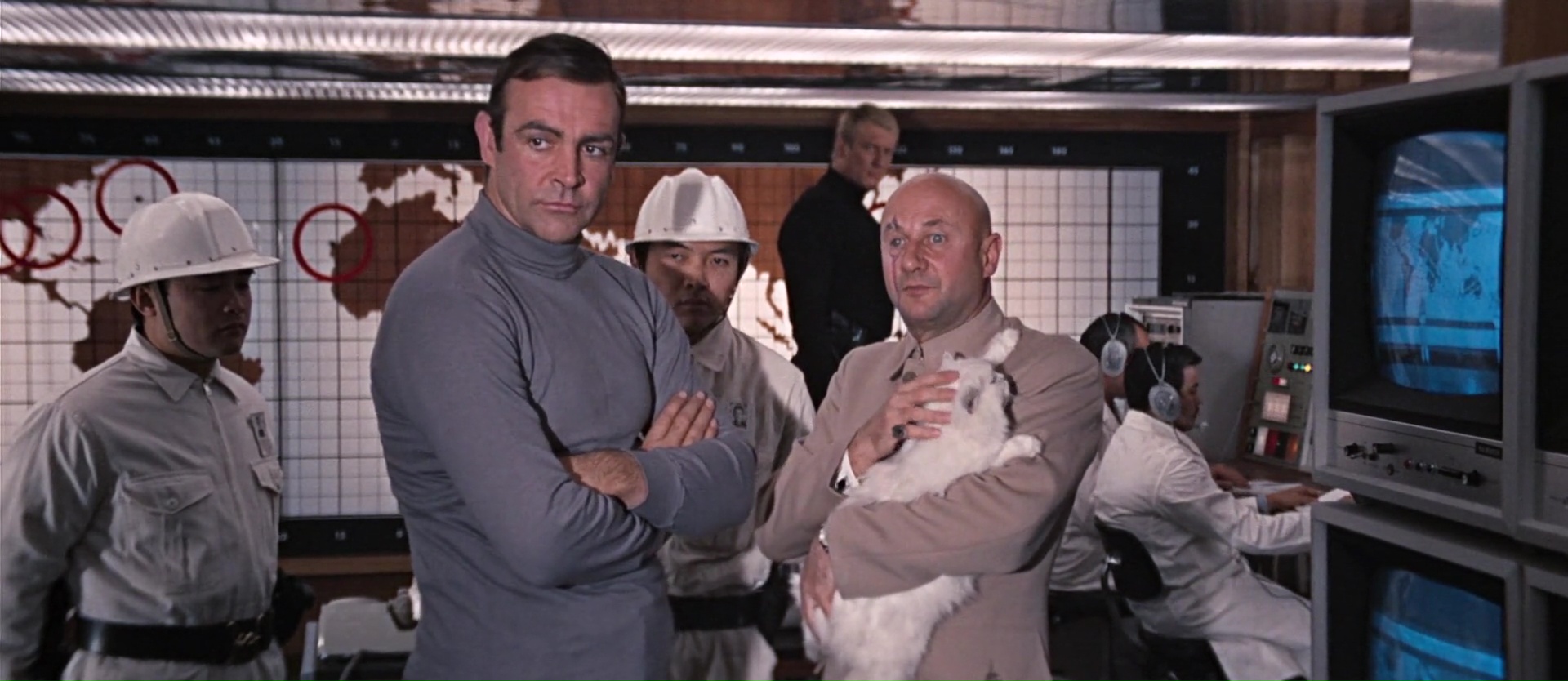 Car notre brave agent 007 va devoir trouver la base de l’ennemi, une base bien cachée (dans un volcan, ils sont intelligent ces méchants), et pour passer inaperçu, voilà qu’on lui annonce qu’il va devoir devenir Japonais et Ninja. Oui oui monsieur ! Et devenir Japonais dans le film, cela veut dire mettre une perruque et ressembler à Mr Bean (on s’en rapproche sérieusement). Devenir ninja, un petit entrainement de 2 jours et on en parle plus. Je ne sais pas si le côté dérisoire est volontaire, surtout que bon, si tout cela sert à infiltrer James, ça n’empêche pas qu’il est grillé dés le départ, puisqu’on tente de le tuer dés sa première nuit, puis dés le premier jour de son entrainement. Et que dire de son final, explosif, généreux, nous dévoilant enfin Donald Pleasence, mais donnant l’impression de voir des hommes en pyjamas jaune attaquant la base ennemie où ceux-ci sont habillés en pyjamas rouge pour bien les différencier. Oui je sais, 1967, mais voilà, ça fâche l’œil. Mention spéciale au chat tout paniqué que Donald Pleasence essaye de garder bien malgré lui dans ses bras durant plusieurs plans. Alors oui, il y a du risible dans le métrage, quelques moments ratés, mais au final, le métrage s’avère divertissant et n’ennuie jamais. C’est déjà pas mal, et ça en fait un métrage que l’on regarde avec plaisir. Notons d’ailleurs que les deux Japonaises principales du métrage, Wakabayashi Akiko et Hama Mie, avaient déjà tournées ensembles en 1962 dans King Kong contre Godzilla de Honda Ishirô, et que le film se paye le luxe d’avoir également Tamba Tetsurô dans son casting, qui après une prolifique carrière, aura beaucoup tourné pour Miike Takashi au début des années 2000 avant de rendre l’âme en 2006. Un épisode plein de bonnes intentions et plutôt amusant donc, mais loin d’être parfait.