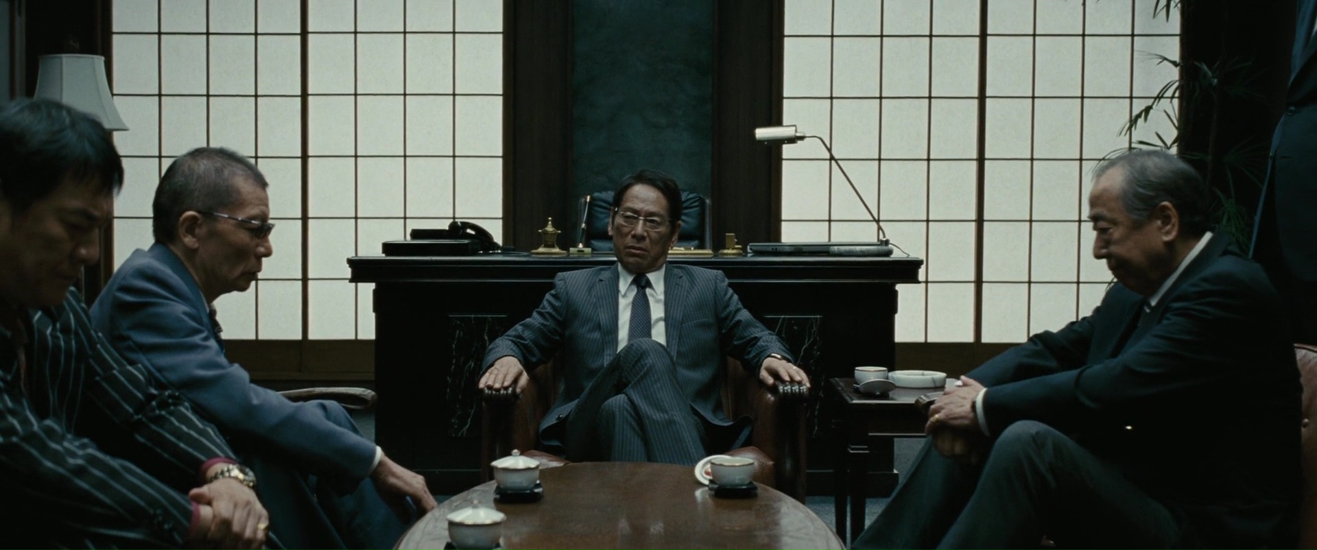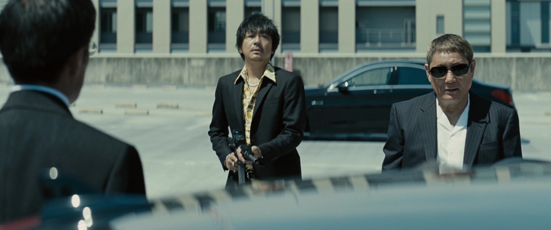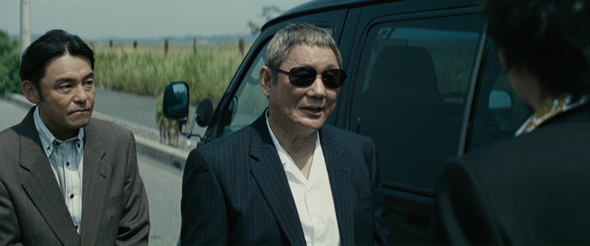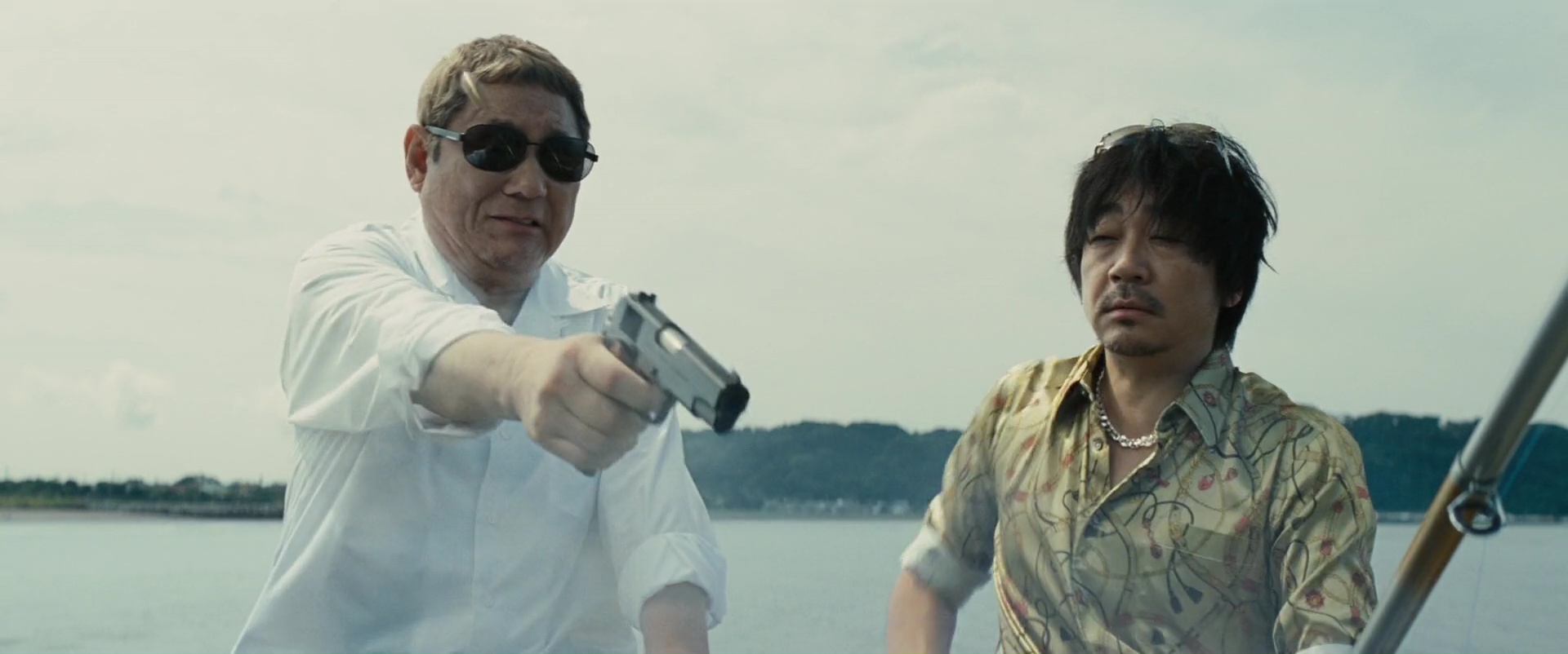 Dans Outrage Coda, l’on retrouve Otomo, exilé en Corée, et travaillant pour son ami Chang. Tout pourrait aller pour le mieux, sauf que tout ne va pas très bien au Japon, avec le clan Hanabishi dirigé par Nomura, joué par l’énorme Osugi Ren (RIP), qui est tout sauf un Yakuza. Premier point, et pas des moindres, et celui-ci fait débat, Nomura n’a rien mais vraiment rien d’un Yakuza. Il n’a pas fait de prison, il n’a pas de tatouage, c’est un homme d’affaire plus qu’un Yakuza, qui profite de la moindre occasion loin des bas gradés du clan pour se la couler douce en survet et planifier des jeux de pouvoirs en montant tout le monde les uns contre les autres. Otomo est loin de tout ça, mais la présence d’Hanada (Pierre Taki) en Corée et un léger différent avec son clan va venir tout faire déraper, et sera le point de départ d’une guerre bien sanglante qui s’annonce dévastatrice. Otomo va donc devoir revenir au Japon, pour venger un de ses hommes, tout faire pour protéger, de près ou de loin, son chef, Chang, et bien faire comprendre une bonne fois pour toute au clan Hanabishi qu’ils font n’importe quoi. Rien de nouveau sous le soleil levant dans les faits, mais Kitano filme tout ça comme souvent avec application et rend parfois jubilatoire son nouveau jeu de massacre, que ce soit dans ses rares et expéditives effusions de violence, ou dans ses manipulations avant tout verbales, où tout le monde tente de prendre le dessus sur les autres, en mentant, proposant de l’argent, faisant des alliances cachées, dans le but de monter en grade. Un certain talent pour trouver un équilibre fragile dans une formule qui a déjà fonctionné durant deux métrages. Oui, les Yakuzas n’ont plus de vrai code d’honneur, ceux de la pire espèce parviennent toujours à trouver manière à grimper les échelons du clan avec leurs coups bas, tandis que les rares hommes encore « bons » n’ont pas franchement cette chance.