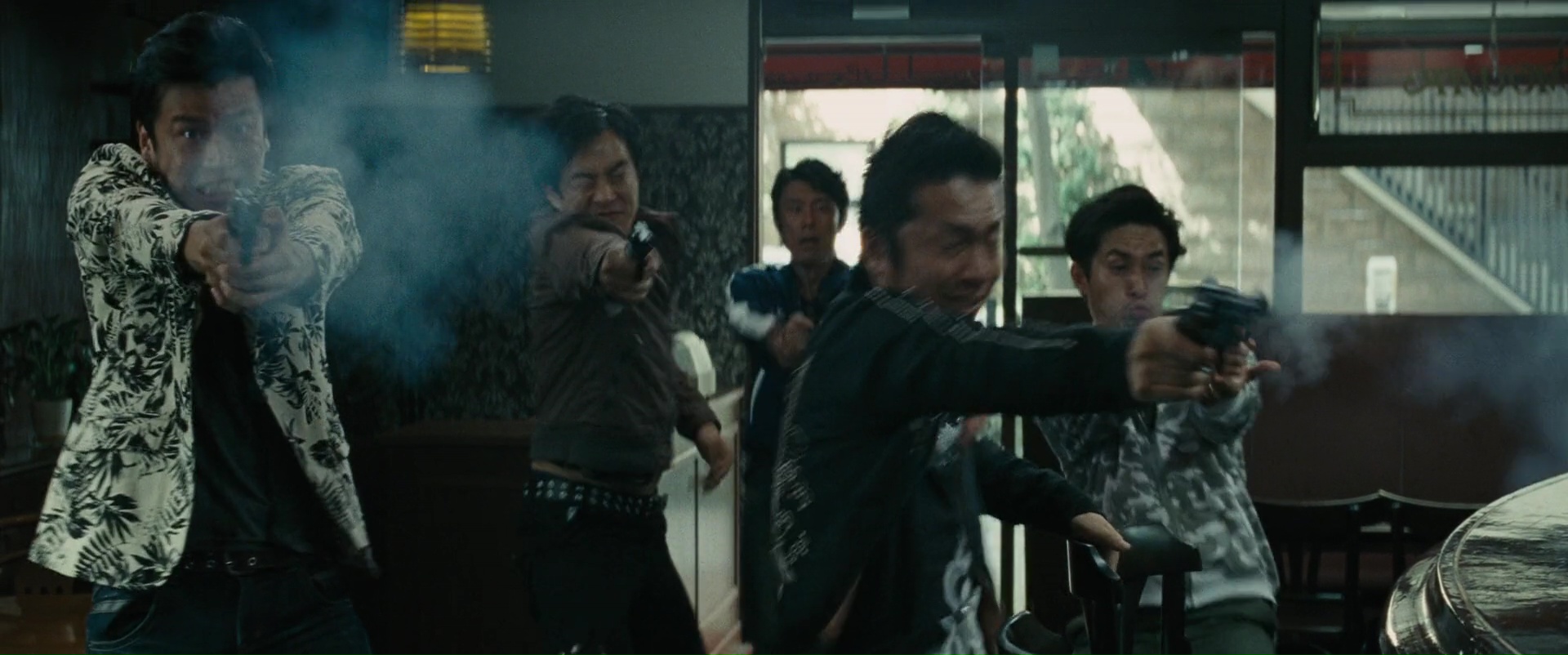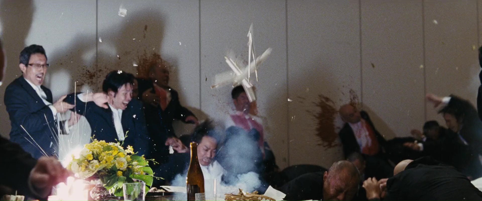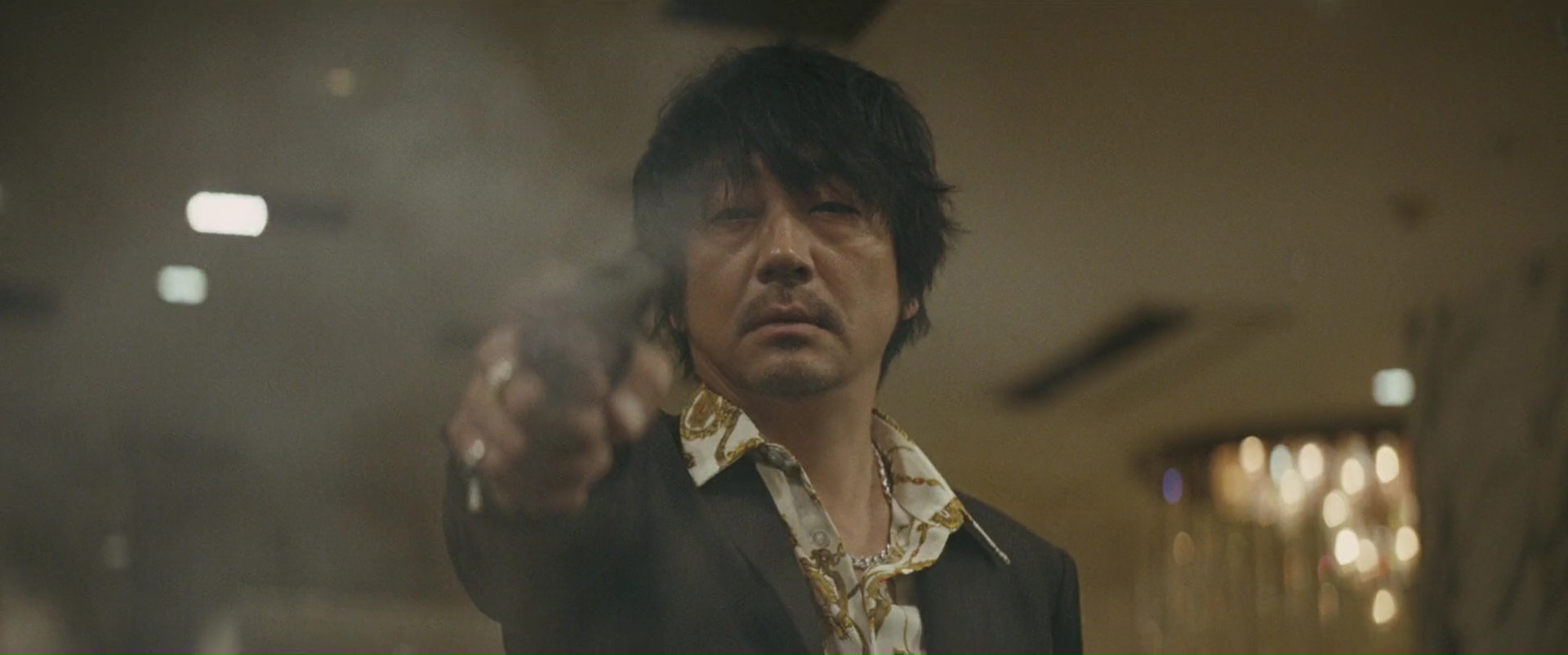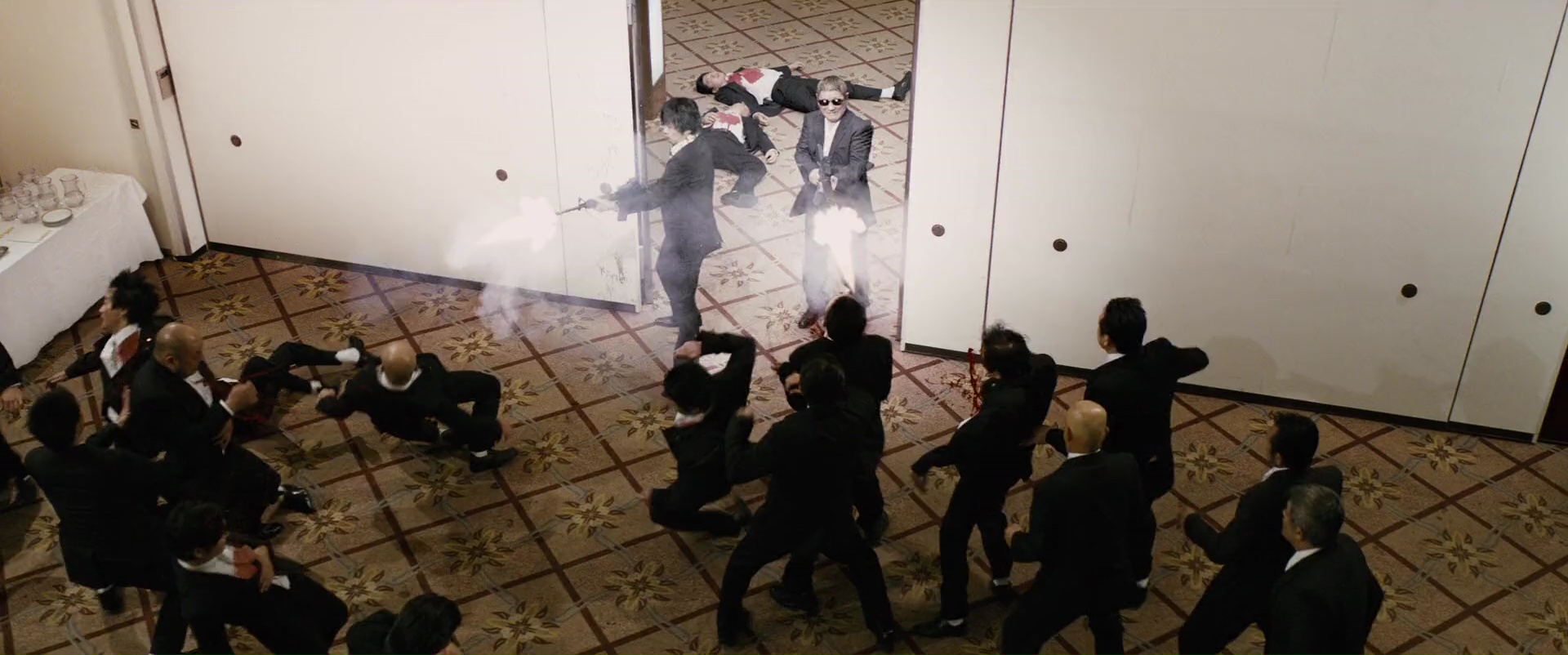 Pourtant, et malgré une mise en scène aussi simpliste dans les faits que maitrisée (pas d’effets de styles inutiles), une musique discrète mais qui parvient à faire par moment énormément monter la sauce, Outrage Coda se permet de mettre du temps à démarrer. Non pas dans ces jeux de pouvoirs, mais dans son jeu de massacre, se faisant très bavard durant toute sa première heure. Peut-être un peu trop ? Oui c’est vrai, même si comme souvent, Kitano s’est entouré d’acteurs doués qui font passer l’ensemble comme une lettre à la poste, ou comme une balle de pistolet dans la tête. Voir en effet dans le même film Kitano, mais aussi Ôsugi Ren, Pierre Taki, ou même retrouver dans un petit rôle Ômori Nao (le fameux Ichi de Ichi the Killer) qui avait déjà tourné plusieurs fois pour Kitano (Dolls et Achille et la Tortue), ça fait toujours plaisir. Et quand nos Yakuzas sortent enfin les armes, ça ne plaisante pas, et ça retrouve l’énergie et le côté jouissif des deux premiers métrages. En allant sans doute même un peu plus loin, c’est après tout la dernière aventure d’Otomo, et il n’a plus vraiment grand-chose à perdre après un tel cheminement. Il n’écoute après tout même plus les ordres, comme le prouve le carnage lors d’une soirée. Et si l’humour est un peu en retrait, comme dans le second film, le film ne l’oublie pas pour autant, et nous ressortira, bien que tardivement, quelques scènes ou mises à mort assez grotesques qui feront assurément sourire. Comme je le disais, la formule était déjà là, ce troisième opus n’invente rien, mais conclut plutôt bien la trilogie, et pour les fans de Kitano, et bien, cela fait toujours plaisir à voir, surtout qu’il n’a rien réalisé depuis, et que Outrage Coda date déjà de 2017.