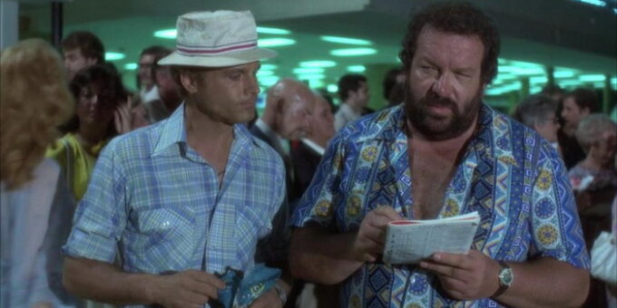 Premier film du duo pour le réalisateur Sergio Corbucci (Django, Le Grand Silence), qui réalisera pour eux par la suite Un Drôle de Flic (1980) et Salut l’Ami Adieu le Trésor (1981), Pair et Impair va reprendre la recette qui a fait le succès des films de Bud Spencer et Terence Hill. Le film va de nouveau jouer sur un duo que tout oppose, ne se connaissant pas au départ mais qui vont finir par collaborer. Bud Spencer est un as du jeu mais qui ne veut plus jouer et qui s’est recyclé dans le transport de dauphins vivants, un ronchon balourd mais au grand cœur, et Terence Hill récidive avec son rôle de roublard malin, dragueur, et un peu fouteur de merde. Un duo avec toujours un aussi gros charisme. A leur côté, toujours l’équipe de cascadeurs de Riccardo Pizzuti, avec ses acteurs aux cabines mémorables (Sal Borgese, Giancarlo Bastianoni, Claudio Ruffini) qui se donnent à fond. Tellement à fond que Riccardo Pizzuti sortira du tournage avec deux côtes et deux molaires cassées. Merci Bud et Terence ! Comme souvent, on retrouve également des clins d’œil aux films précédents du duo : les fayots (On l’appelle Trinita), la course de voiture (Attention on va s’fâcher), un pari stupide d’ingurgitation de jus d’orange (celui des saucisses dans Attention on va s’fâcher), la démolition complète d’un restaurant (Attention on va s’fâcher, Deux Super Flics), et bien d’autres… Autant vous dire qu’on est en terrain connu et que le sourire va très rapidement monter jusqu’aux oreilles de l’inconditionnel.